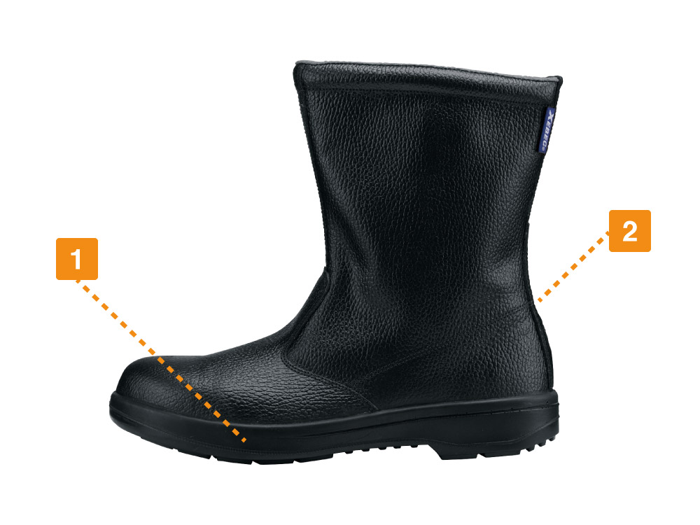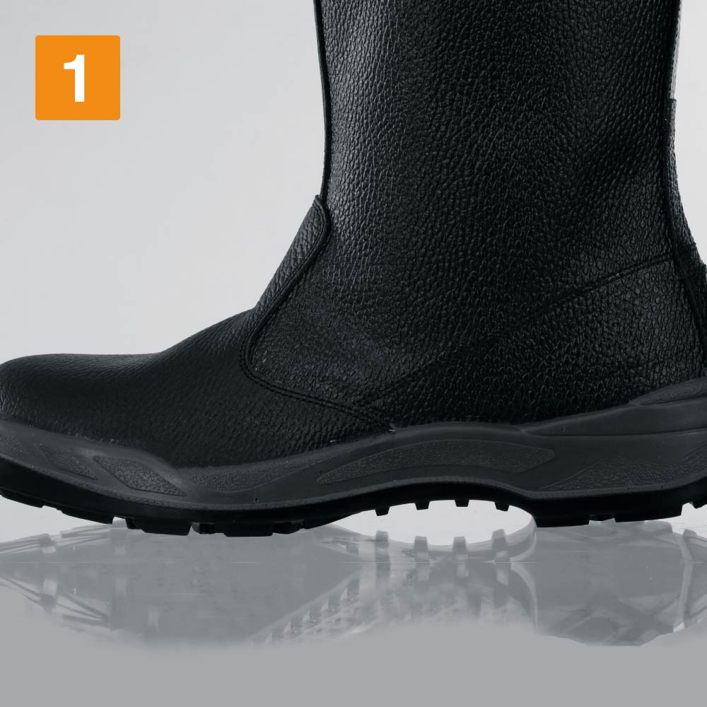 JIS規格に適合した高品質牛革を使用した安全靴です。安全靴としての高い機能を備えた一足。つま先には鋼製先芯と同程度の高い強度ながら、軽さが魅力の樹脂製先芯が使用されています。重量物の落下から足先を守り、安全な作業をサポート。かかと部分には反射材が配置されており、夜間や暗所での高い視認性を確保します。時間帯や環境を問わず、安全な作業をサポート。また、クッション性に優れた靴底のウレタン素材は、耐油性にも優れているのがポイント。油による劣化を防ぎ、長く安全に履いていただけるシューズです。