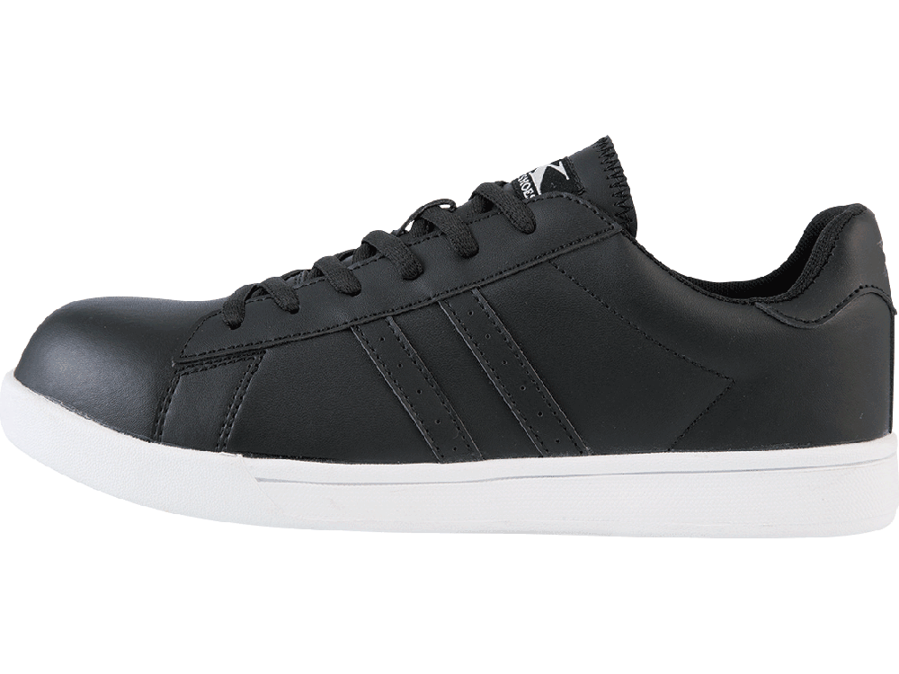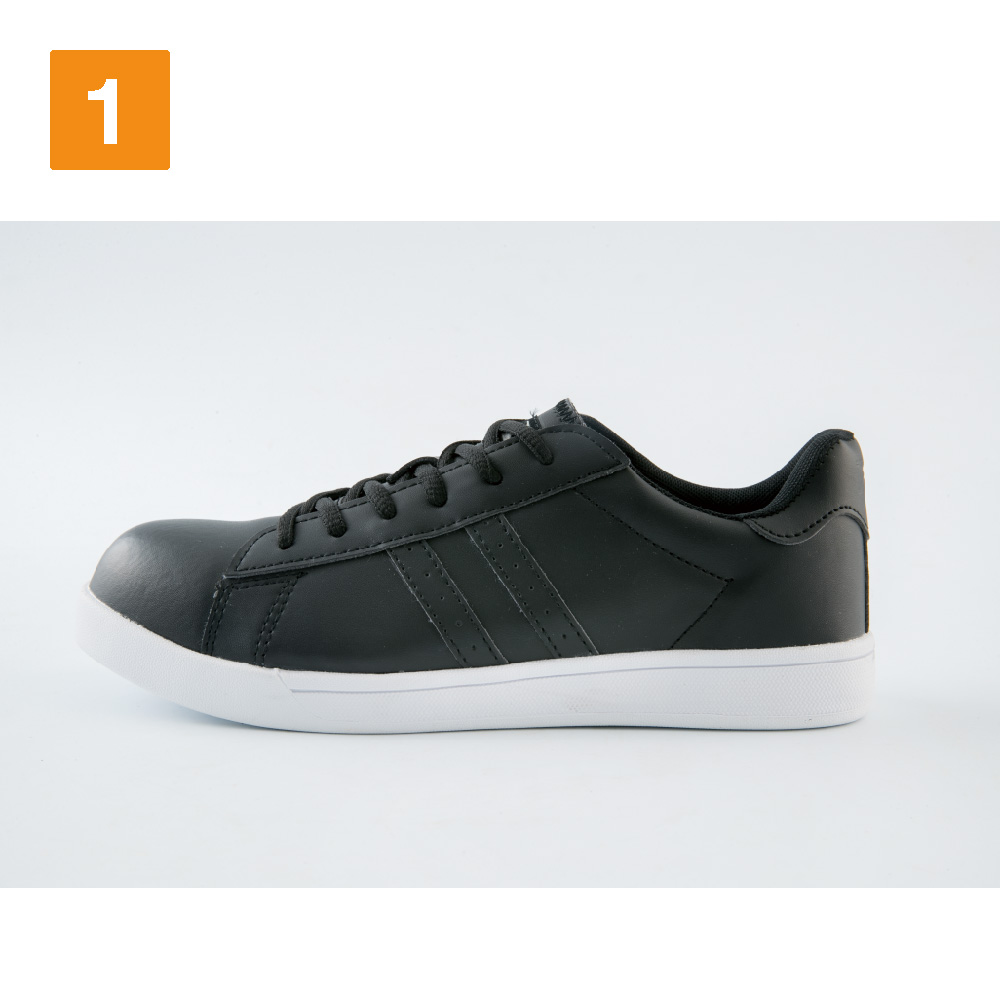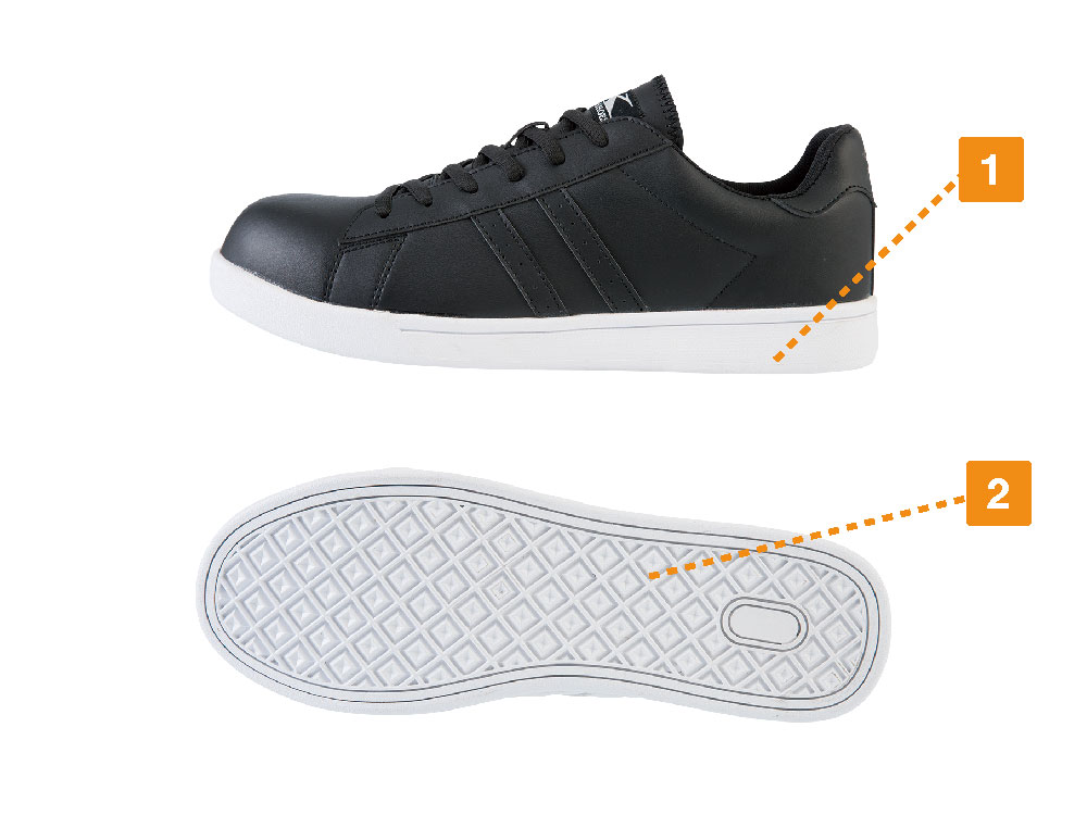 シンプルながら安全靴としての高い機能を備えたシューズ。JSAA規格 A種に適合しており、高い衝撃吸収力で足への負担を軽減します。ソール自体が優れたクッション性を持つので、一日中履いても疲れにくい仕様に。また、つま先には樹脂製の先芯が配置されています。軽量ながら鋼製先芯と同等の高い強度で、重量物の落下から足を守ります。快適なは着心地もポイント。汗や汚れが気になる中底に抗菌・防臭加工が施されており、靴内の環境を清潔に、かつ不快な臭いを低減。お仕事で汗をかいても、常に爽やかな着用感が続きます。