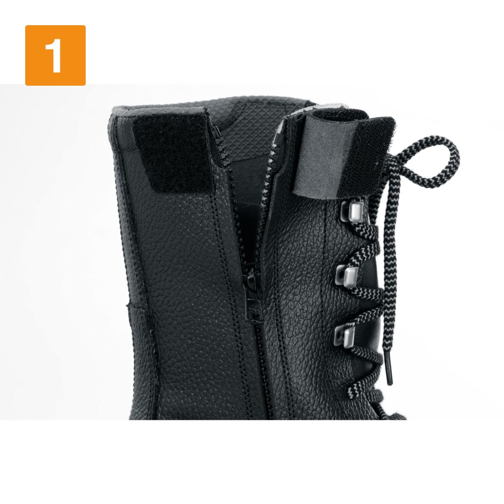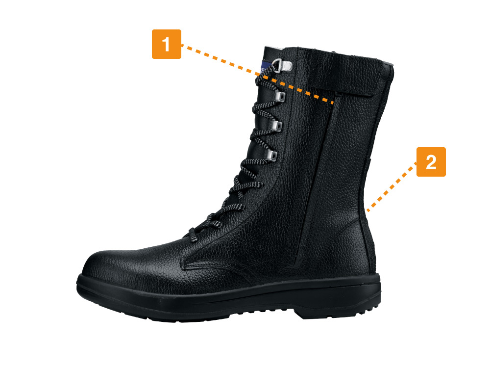 足元をかっこよく彩る、編み上げデザインが人気の牛革ブーツです。ヒモでお好みのフィット感を調整できるので、常にベストな履き心地で着用可能です。ふくらはぎの真ん中までカバーされたロング丈ながら、サイドファスナーにより着脱も容易。ストレスない脱ぎ履きを実現しています。また、クッション性に優れたウレタン製の二重底が、作業時の足の負荷を低減。疲れにくく、毎日の作業をアシストしてくれます。安全面では、かかと部分に配置された反射材が夜間や暗所での視認性をアップ。時間や環境を問わず、安全に履いていただけます。