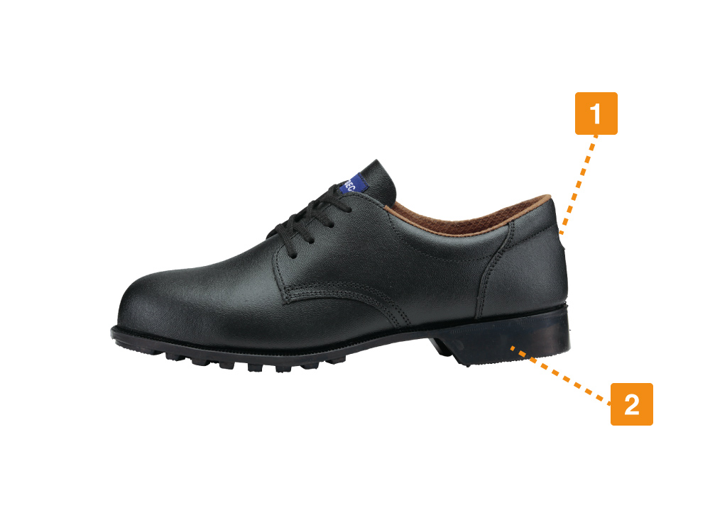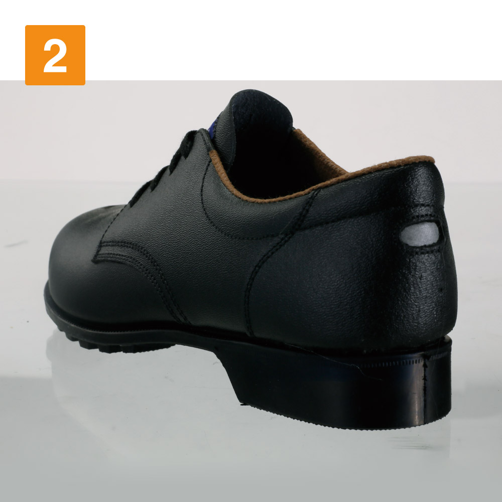 すっきりとした見た目ながら、熱に対する抜群の強さを誇るシューズ。さらに、安全靴としての基本機能もしっかり抑えられた一足です。つま先には、強度の高い鋼製先芯を使用し、足先を重量物の落下からガードします。また、かかと部分に配置された反射材は、夜間や暗所での視認性をアップ。現場での安全性を向上しています。耐久性の面では、靴裏に耐油性に優れたゴム底が採用されています。油による劣化を抑えて、長く安全に履いていただけるシューズです。