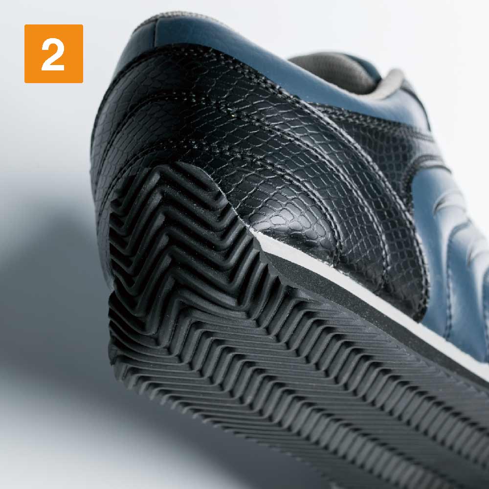 高い作業性を支える、機能面も充実した安全靴です。つま先の先芯には、鋼製先芯と変わらない強度を持ちながら、軽量な樹脂製先芯が使用されています。足に負荷がかかりにくく、重量物の落下から足をしっかり守ります。また、ソールは衝撃吸収性の高い素材が使用されています。軽量で疲れにくく、足のダメージを低減する一足です。また、臭いの気になる中底部分には抗菌・防臭加工が施され、常に清潔に。汗をかいても不快な臭いがしにくく、菌の繁殖を抑え、快適な履き心地が続きます。