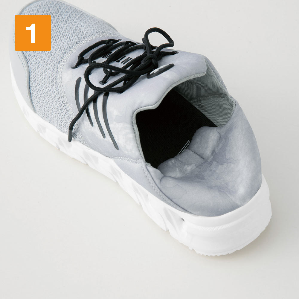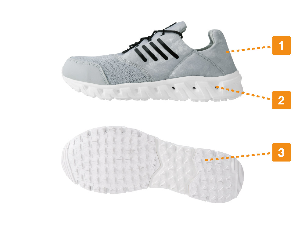 デザインスニーカーのようなスポーティなルックスで、足元を彩る安全靴。甲の一部にメッシュを使用し靴内の蒸れを軽減することで、抜群の通気性をプラスしたモデルです。履き口はかかとを踏んでも履ける、やわらかなスリップオン仕様。脱ぎ履きがスムーズで着脱時にストレスを感じさせません。また、高い耐滑性を備えた靴底が、全色ホワイトカラーで統一されているのもポイント。床面への汚れにシビアな内装業などにも採用の多いモデルです。