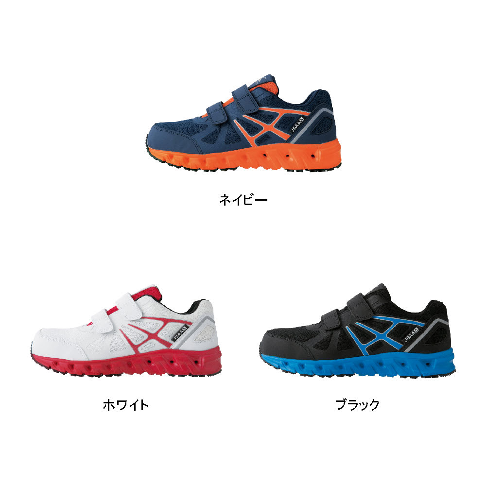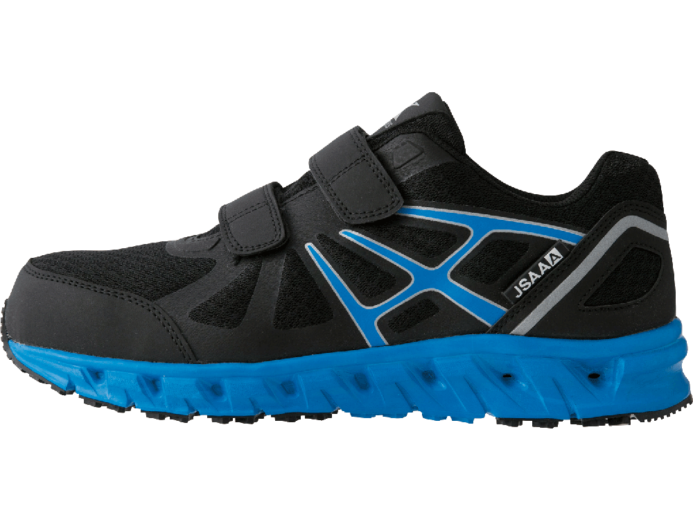 面ファスナーや通気性といった主な特長はもちろん、安全靴としての充実の機能性を備えたシューズです。ソールには軽量で衝撃吸収性能に優れたEVA素材が使用されています。さらに、JSAA規格 A種規格にも認定された高い衝撃吸収力で足の負荷を軽減してくれます。また、通気性に加え中底には抗菌・防臭加工が施されているのもポイント。汗や蒸れによる不快な臭いを抑え、靴の中を清潔に保ちます。耐久性も高く、靴裏に耐油性に優れたゴムを使用することで、油による靴の劣化を防止。長く安全に着用できる、コストパフォーマンスも魅力の一足です。