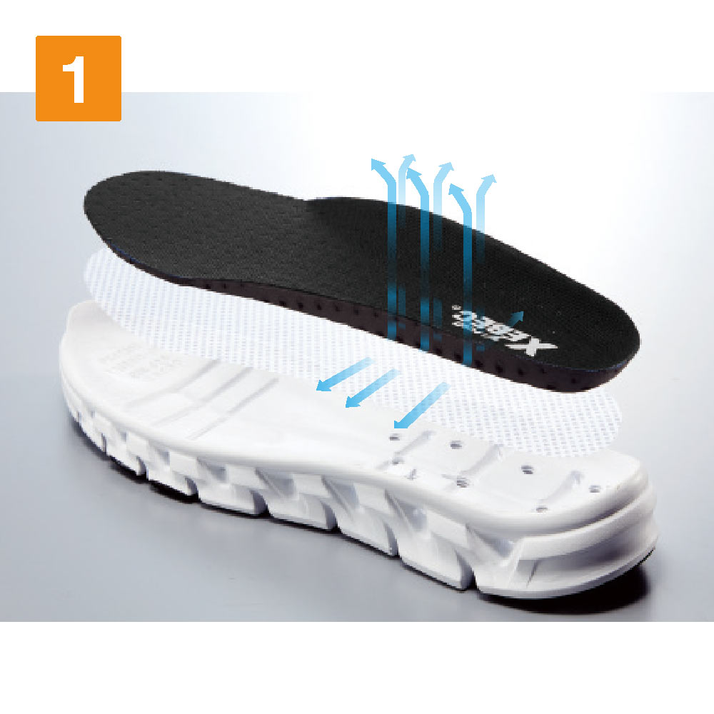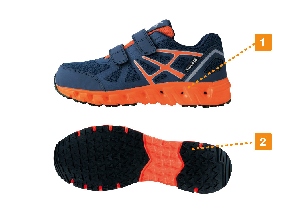 メッシュを使用しスポーティにまとめられた、デザインも人気のモデル。通気性が高く、暑い時期でも爽やかな履き心地がポイントです。アッパーソールにメッシュを使用し、さらにミッドソールには空気を循環させるベンチレーションシステムを採用。不快な蒸れを抑え、汗をかいても快適な着用感が持続します。また、安全面でも優れており、かかととサイドには反射プリントを配置。夜間や暗所での作業でも、高い視認性を確保します。靴裏には耐滑性の高いゴムを使用。溝のデザインとともに高いグリップ力で作業をアシストします。
