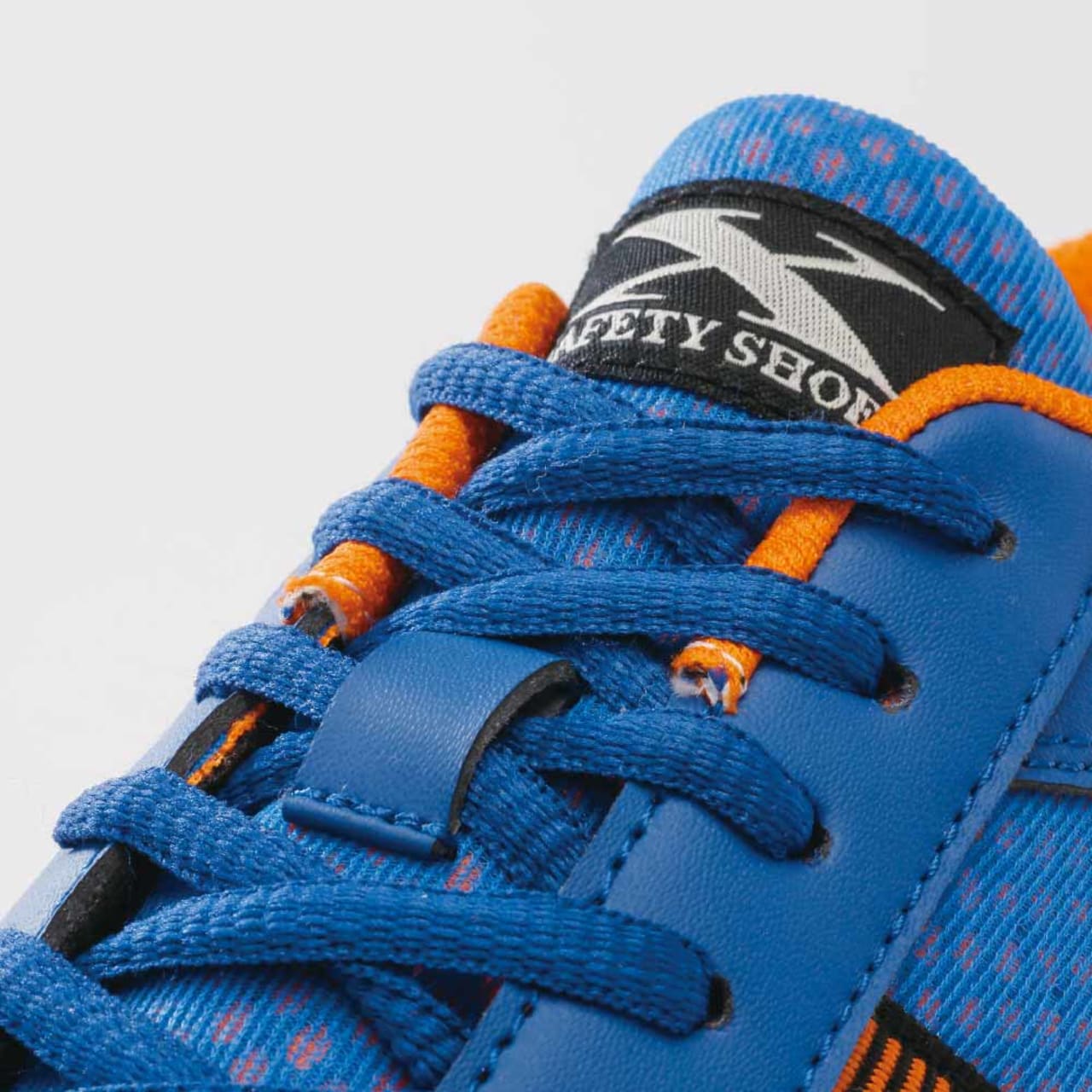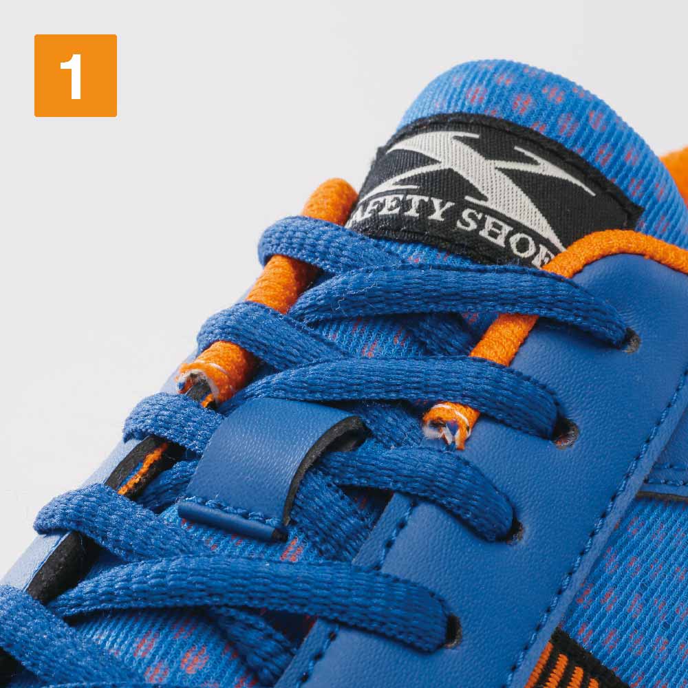 軽さや通気性といったメインの性能を支える、細やかな設計も手を抜かないシューズです。つま先には、軽量かつ鋼製先芯と変わらない強度の樹脂先芯が使用されています。重量物の落下から足をしっかり保護し、より安全に。またかかと部分には反射材が使用され、夜間や暗所での視認性が大幅にアップされています。ディテールでは靴ヒモに楕円形断面のシューレースが採用され、ほどけにくさをプラス。幅広い環境で安全に作業いただける一足に仕上がっています。