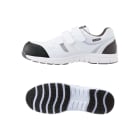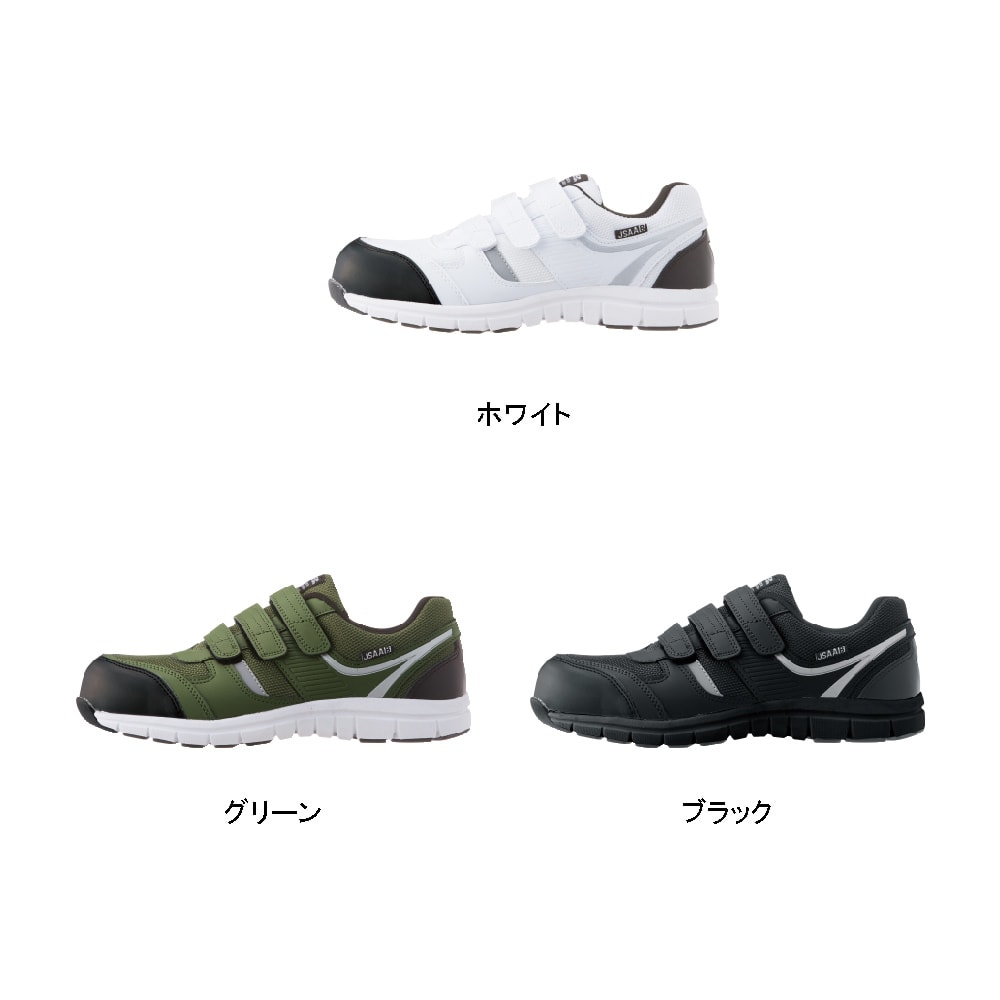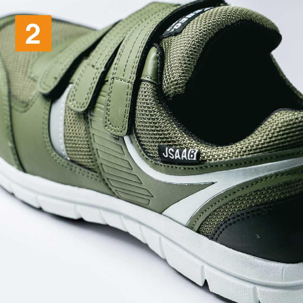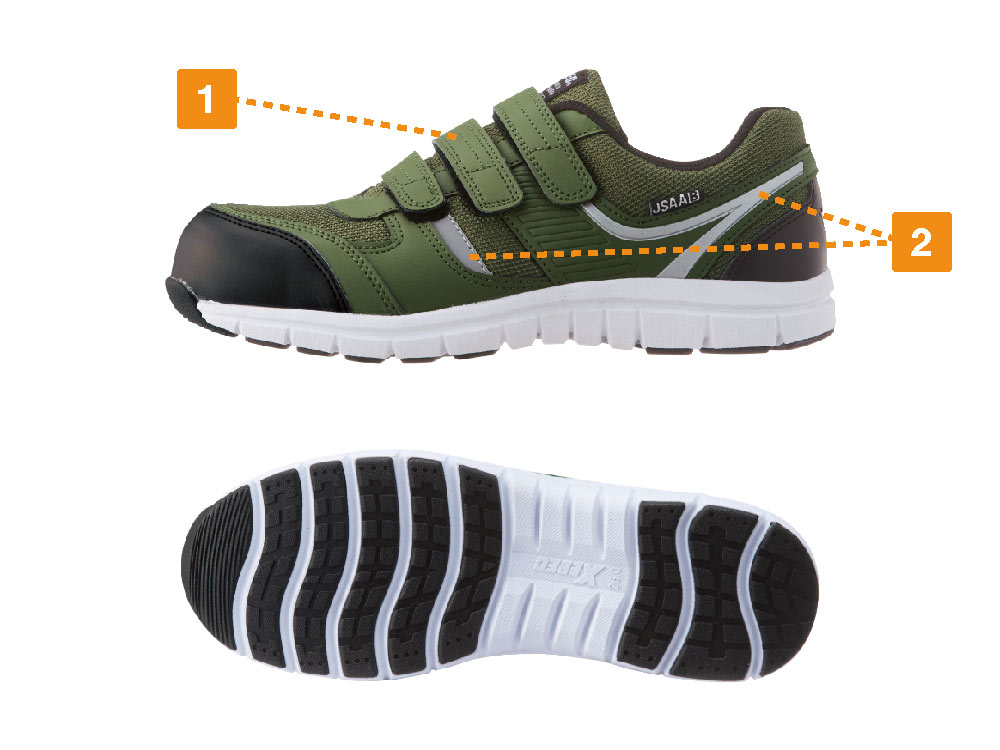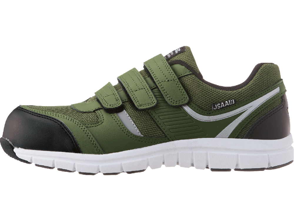 安全性、快適性など安全靴に求められる機能を贅沢に備えたシューズです。つま先を保護する先芯には、高い強度ながら軽量の樹脂製先芯が使用されています。また、ソールには軽量かつ高い衝撃吸収性を備えたEVA素材が使用され、足への負荷を軽減しています。JSAA規格 B種にも認定された衝撃吸収力で、ハードな動作でも足が疲れにくい仕様です。安全面では、側面とかかとに夜間や暗所での高い視認性を確保する反射材が配置され、幅広い時間帯、環境での安全作業を可能にしています。靴裏は油による劣化を抑えたゴムが使用されており、長く安全にお使いいただける一足です。
