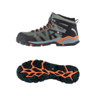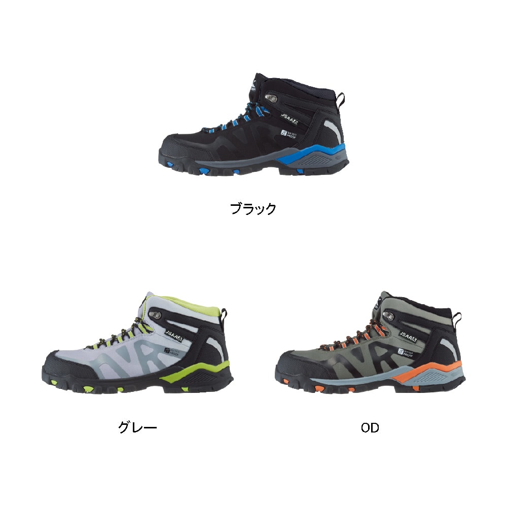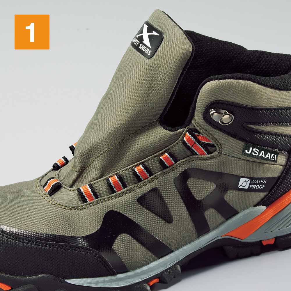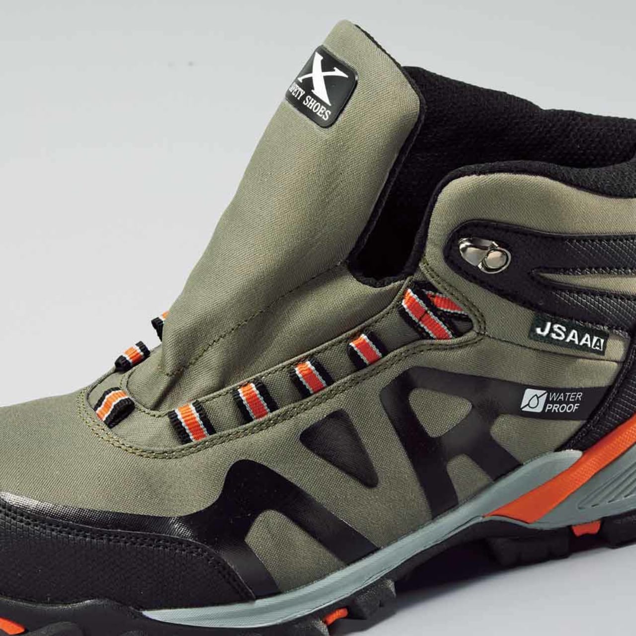 トレッキングシューズを思わせる無骨なデザインがかっこいい、高機能安全靴です。独特な形状のラバーを使用したアウトソールが、悪路や水に濡れた場所でも地面をしっかりキャッチ。さらに、アッパーには防水フィルムが貼り合わせてあり、5cm/5時間水の侵入を防ぐ高い防水性能をプラスしています。靴ベロは水かきのような形状で隙間がなく、ここでも靴内部への水、ほこりの侵入をガード。また、かかと部分に配置されたスタビライザーが、足の横ブレを低減します。安定した歩行により、長時間の作業でも疲れにくい一足に。足元の悪い環境で最大の能力を発揮するシューズです。