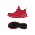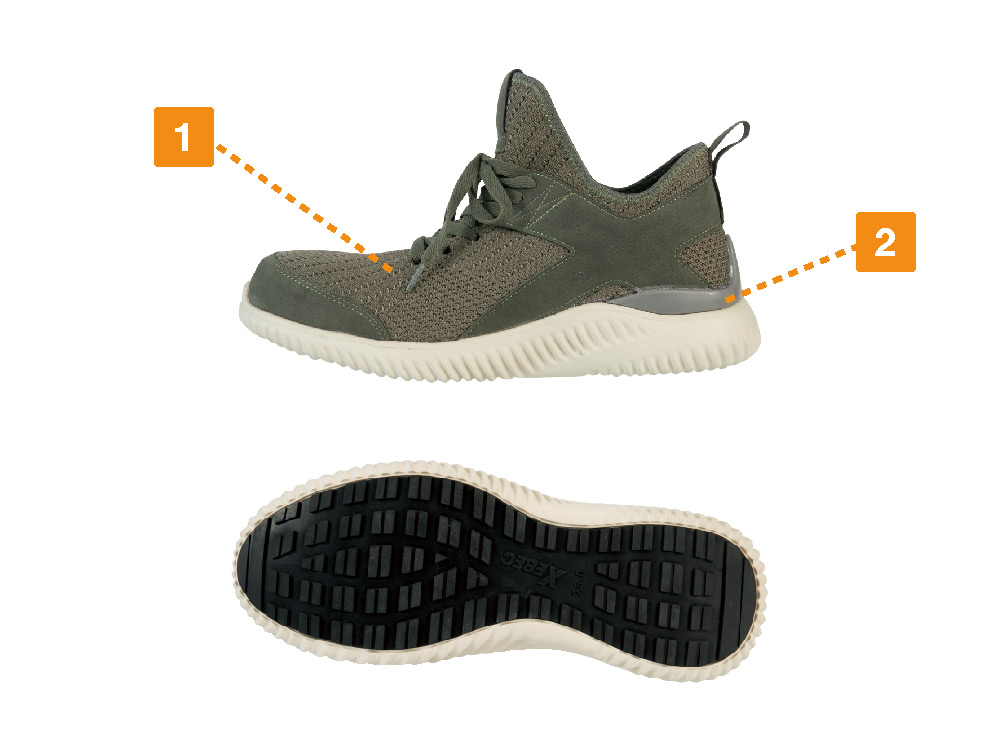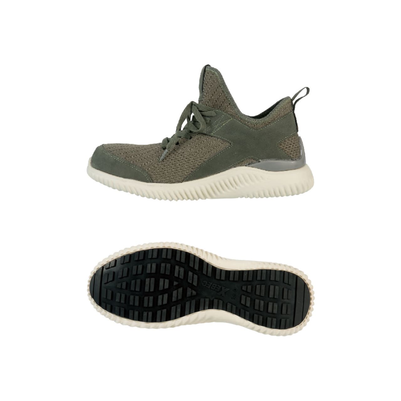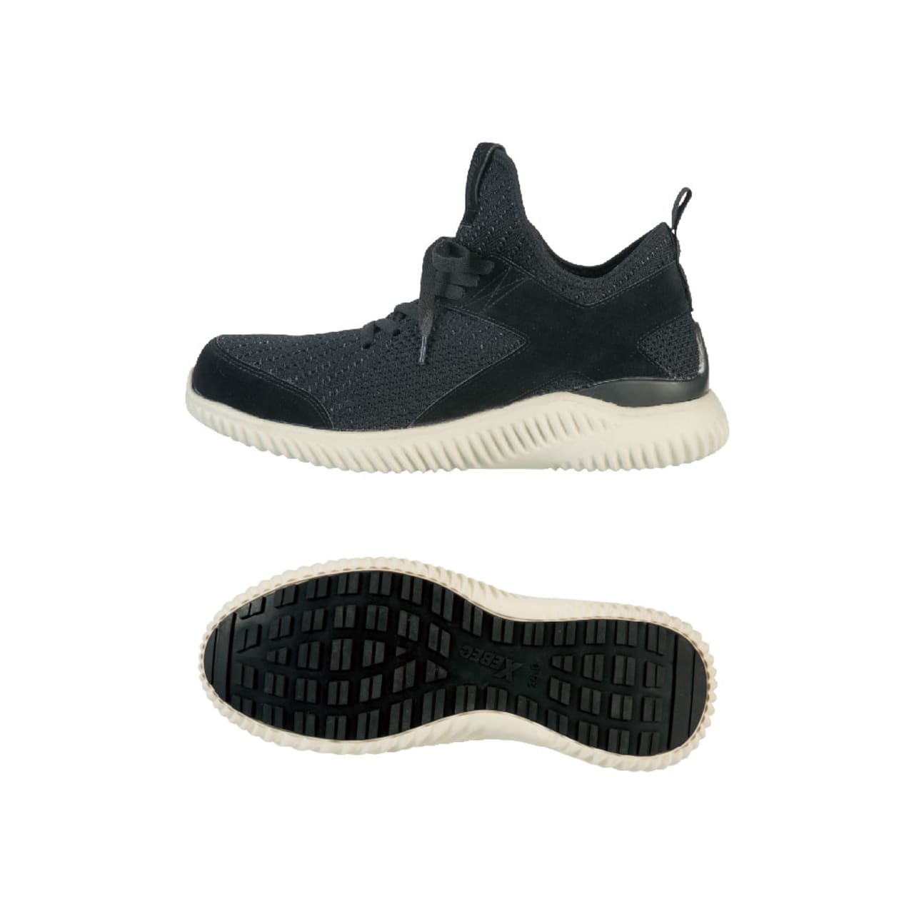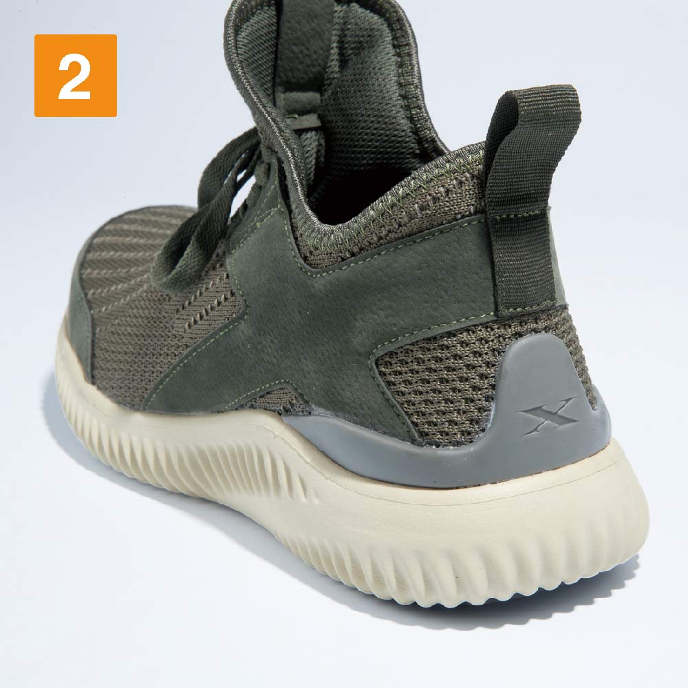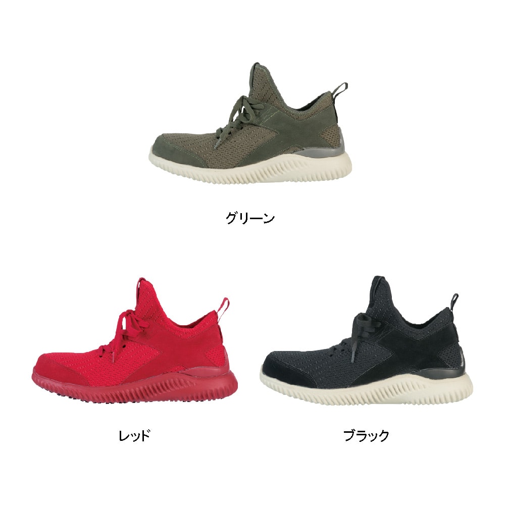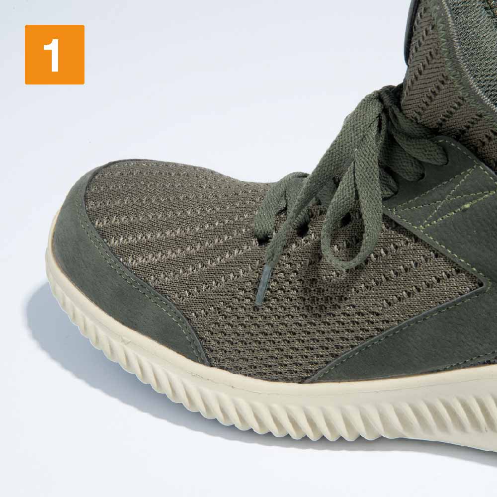 つま先の保護には、高強度の鋼製先芯が使用されています。軽やかな印象ながら、重量物の落下から足をしっかり保護する安全靴です。また、ニット素材が使用されていることで高い通気性を実現しています。汗による靴内の蒸れを常に排出するので、長時間の着用でも快適な履き心地が持続します。さらに、中底には抗菌・防臭加工が施されており、不快な臭いの発生を抑え清潔に保ちます。耐久性の面では、靴底の素材に耐油性に優れたゴムが使用され、油による劣化を抑えています。長く安全に履いていただけるシューズです。