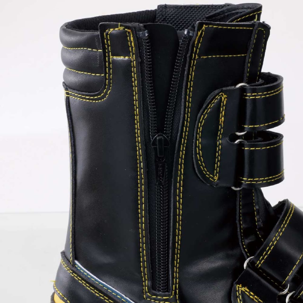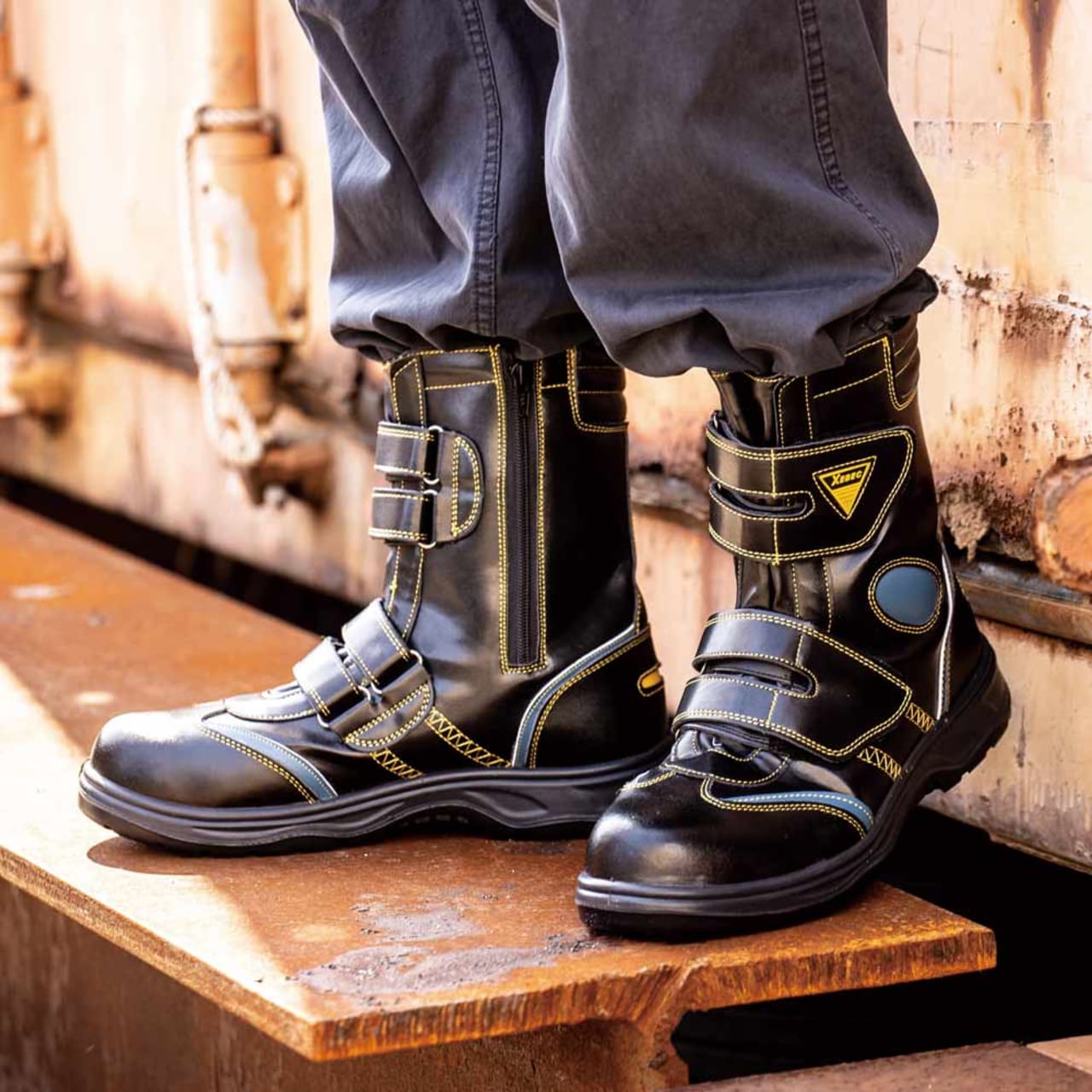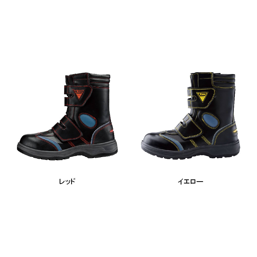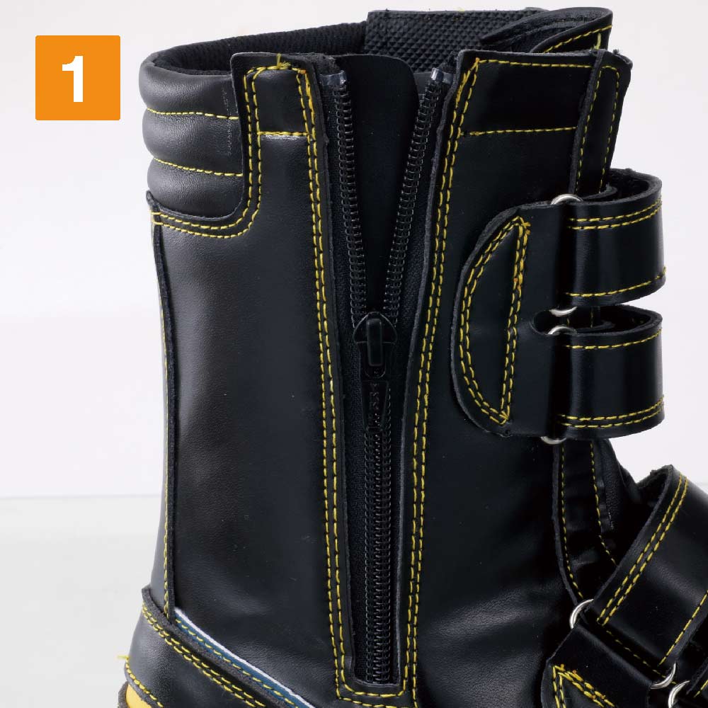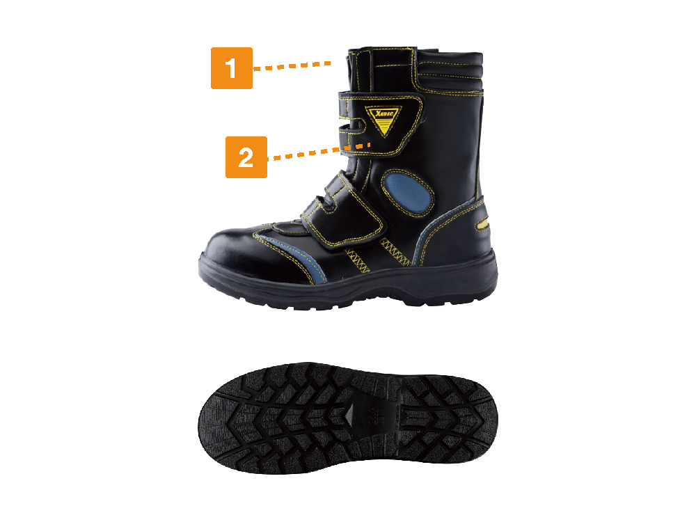 安心感のあるがっちりとしたフォルムに、散りばめられたデザインアクセントがかっこいいロングブーツ型安全靴です。また、面ファスナーとサイドファスナーのダブル使いで、ロングブーツのわずらわしさをなくしたモデル。手袋や軍手を付けていても着脱やフィット感の調整が容易に行えます。さらに、くるぶし部分のワンポイントアクセントであるクッションがポイント。くるぶし部分のでっぱりを保護し、ケガの危険を低減してくれます。
