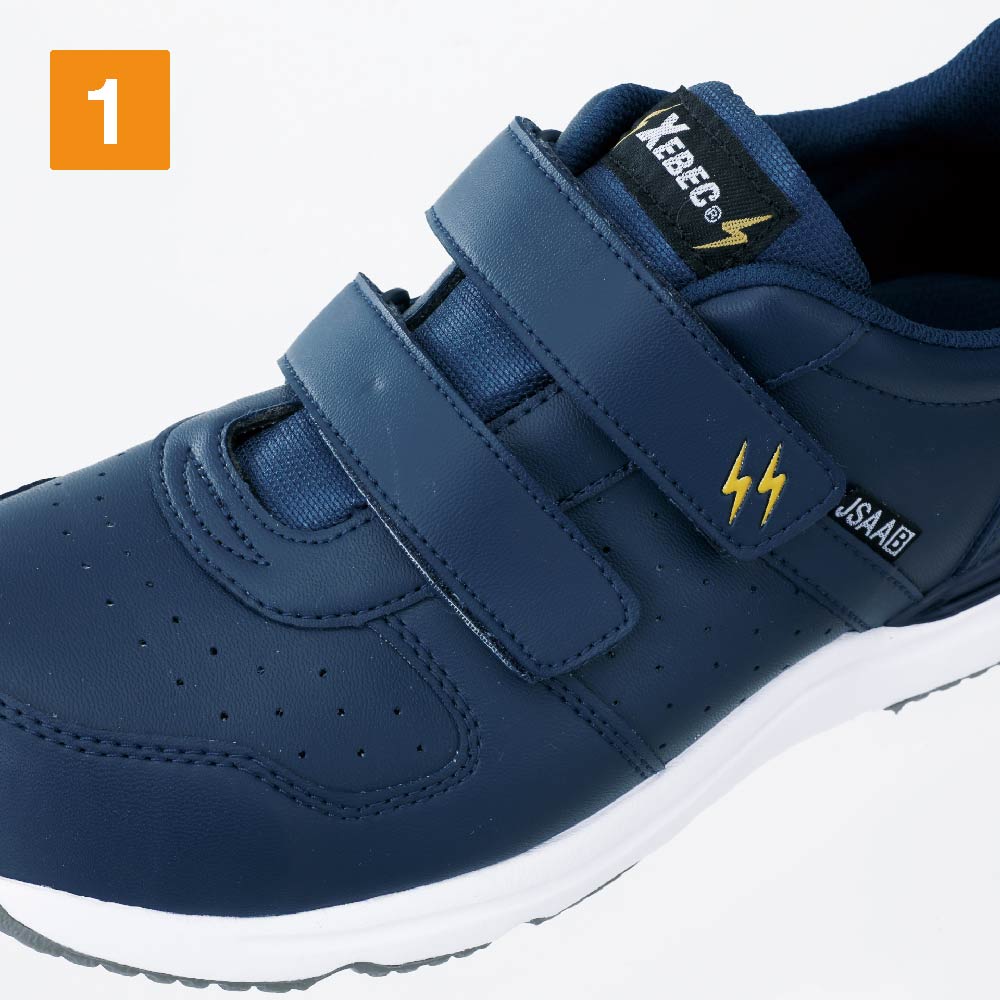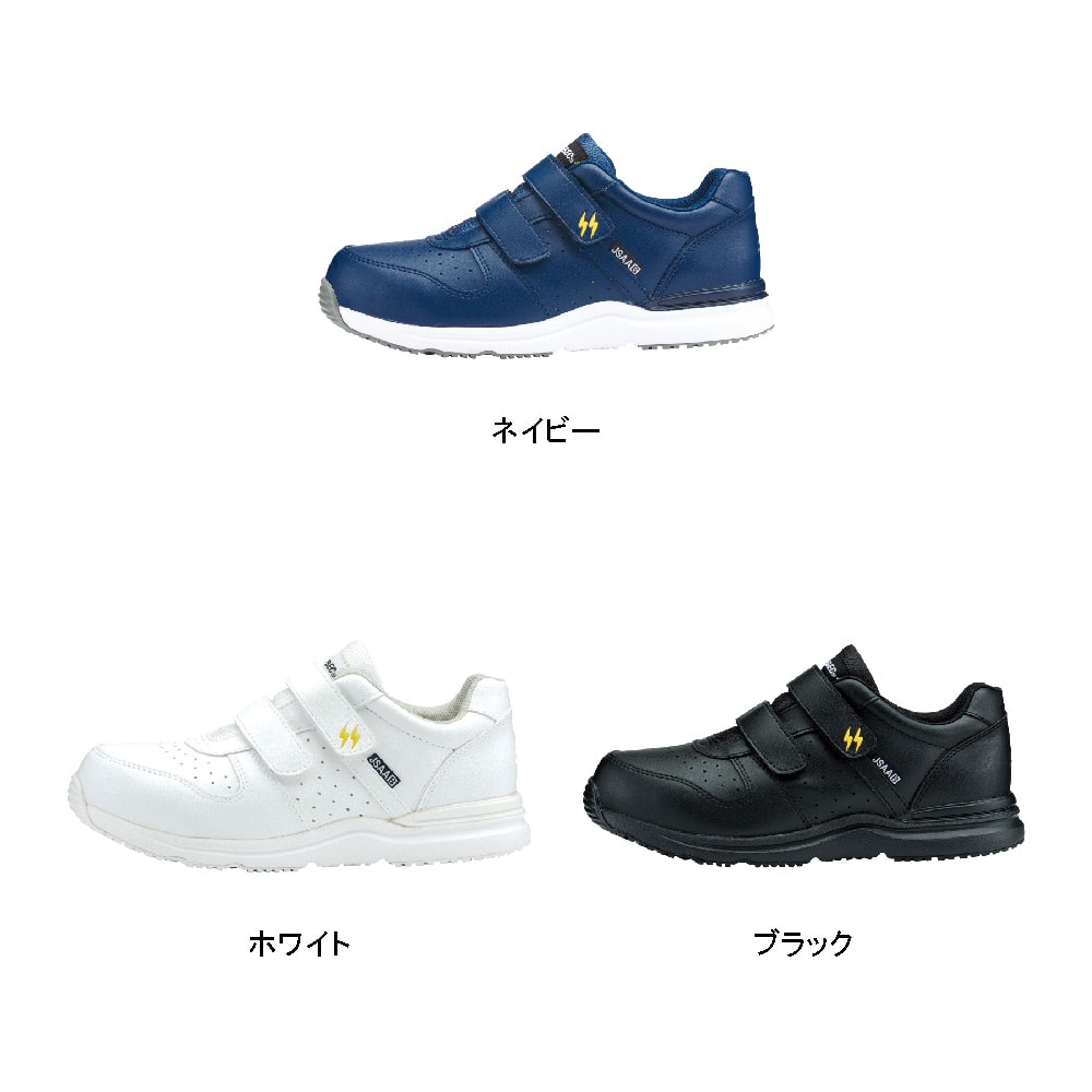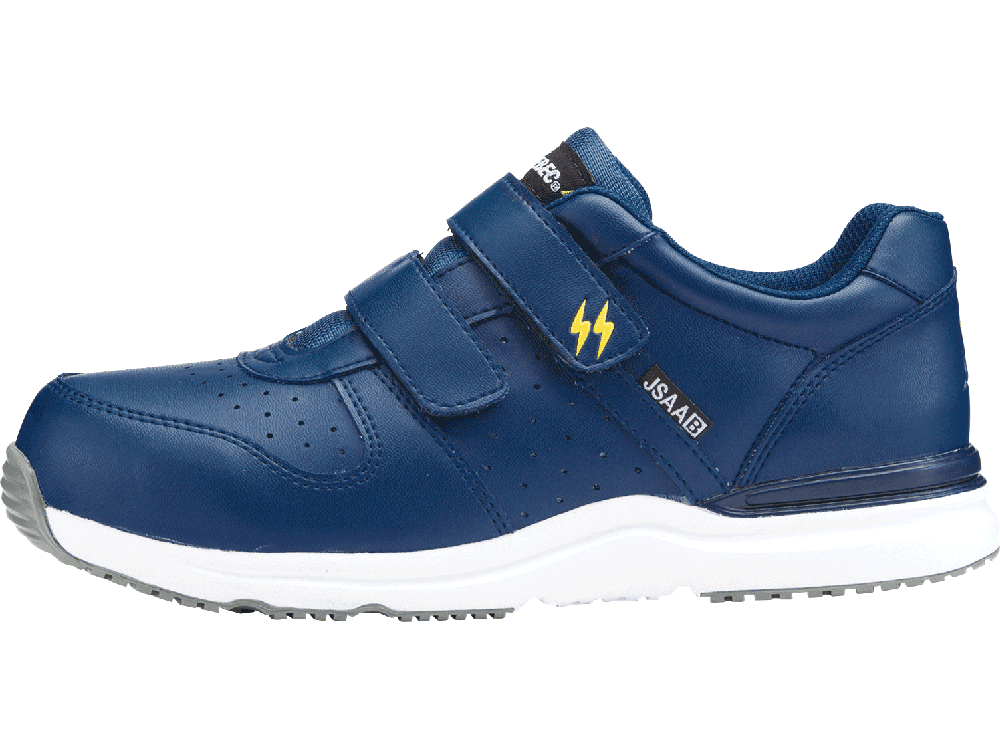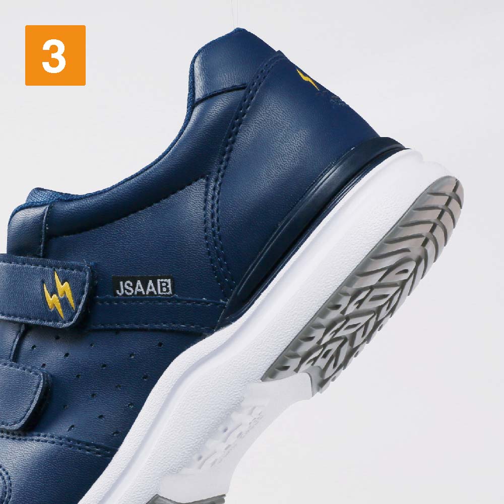 JSAA規格 B種に適合した静電気帯電防止性能を備えた安全靴。静電気の発生に対してシビアな環境でも履いていただけるので、電子機器や精密機器を扱う現場での導入も多いモデルです。また、その歩行安定性もポイント。かかと部分に施されたプラスチックスタビライザーが、かかとの横ぶれを抑え、足をしっかりとホールドします。歩行時に足が遊ばないことで疲労を軽減し、毎日の着用をアシストする一足。履き口には面ファスナーが使用され、手袋をした状態でも脱ぎ履きやフィット感調整が簡単に行えます。