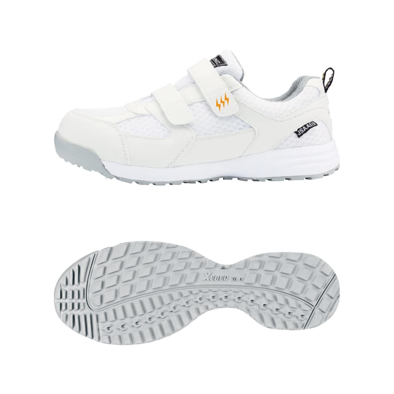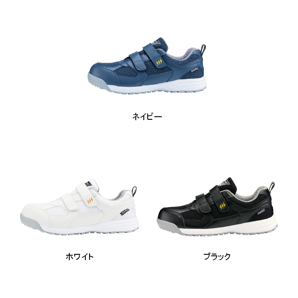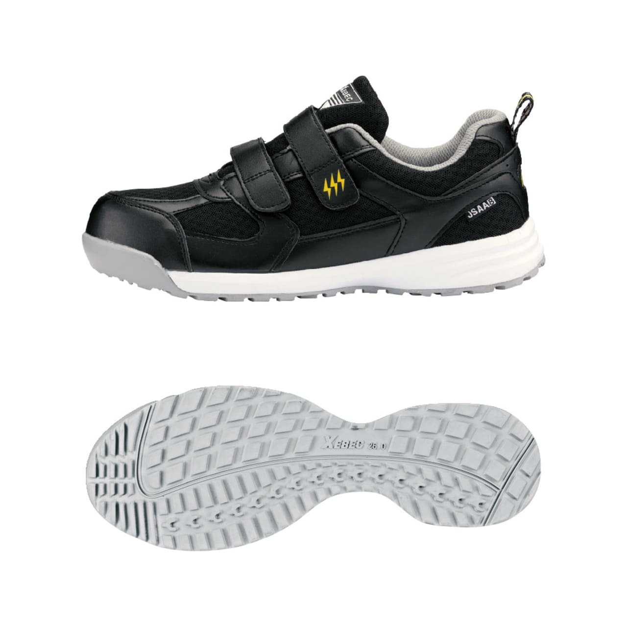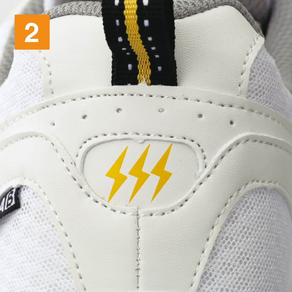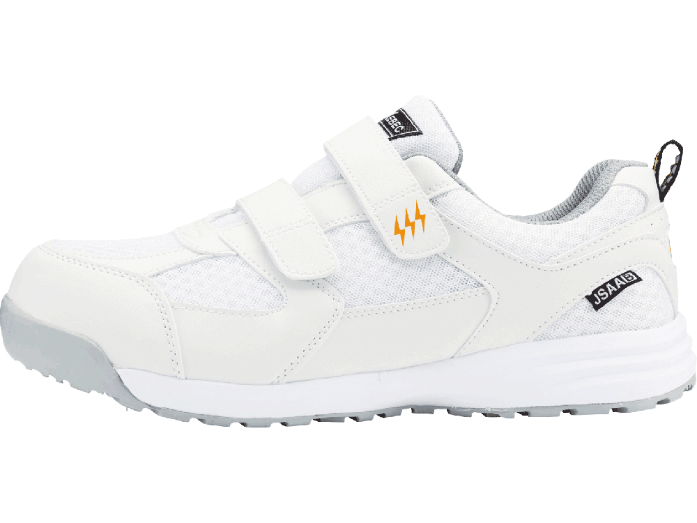 シンプルなルックスに静電気帯電防止性能を備えた、充実の機能が特長の安全靴です。電子機器や精密機器の製造現場での採用も多く、静電気にシビアな環境でも履いていただけます。また、その快適な履き心地も人気の秘密。アッパーにメッシュ素材が使用され、靴の蒸れを常に外に排出してくれます。中底は抗菌・防臭加工が施されているので、汗をかいても不快な臭いを抑え、清潔な状態をキープ。また、面ファスナー部分のさりげないイナズママークが、ちょっとしたアクセントとして制電効果をアピールしているのもポイントです。
