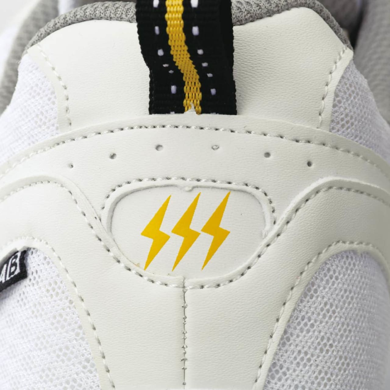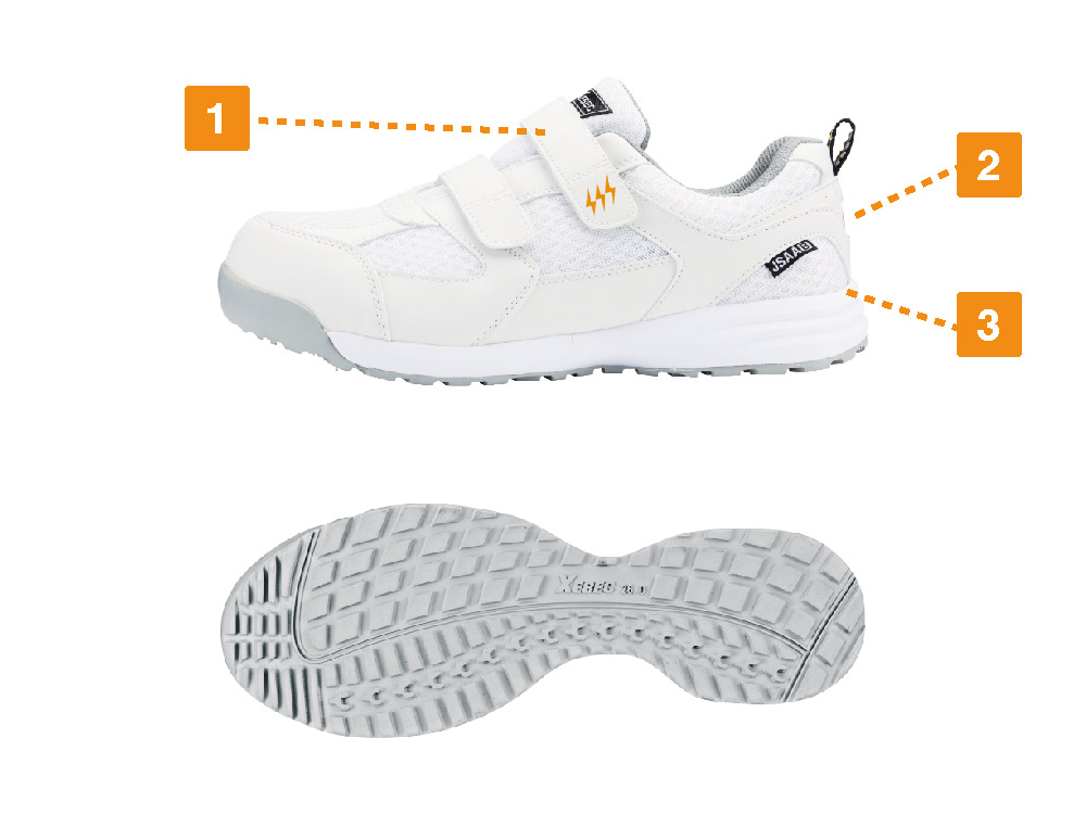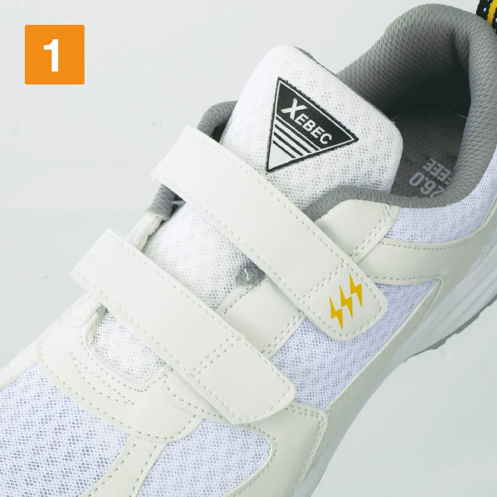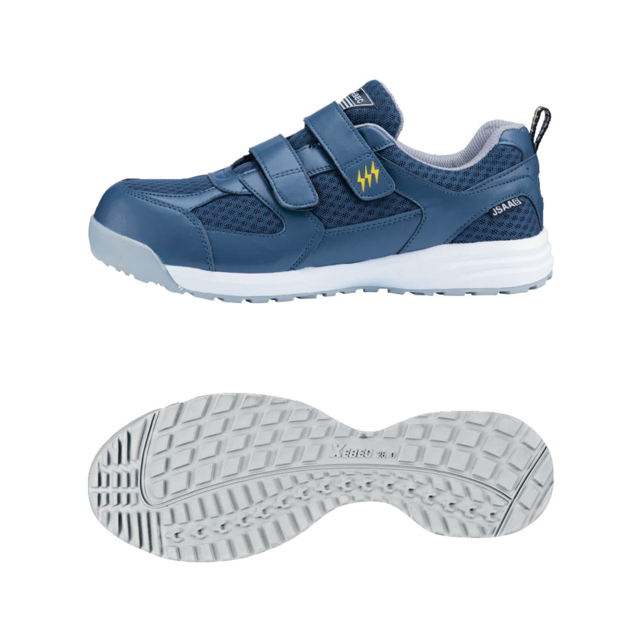 シンプルなルックスに静電気帯電防止性能を備えた、充実の機能が特長の安全靴です。電子機器や精密機器の製造現場での採用も多く、静電気にシビアな環境でも履いていただけます。また、その快適な履き心地も人気の秘密。アッパーにメッシュ素材が使用され、靴の蒸れを常に外に排出してくれます。中底は抗菌・防臭加工が施されているので、汗をかいても不快な臭いを抑え、清潔な状態をキープ。また、面ファスナー部分のさりげないイナズママークが、ちょっとしたアクセントとして制電効果をアピールしているのもポイントです。