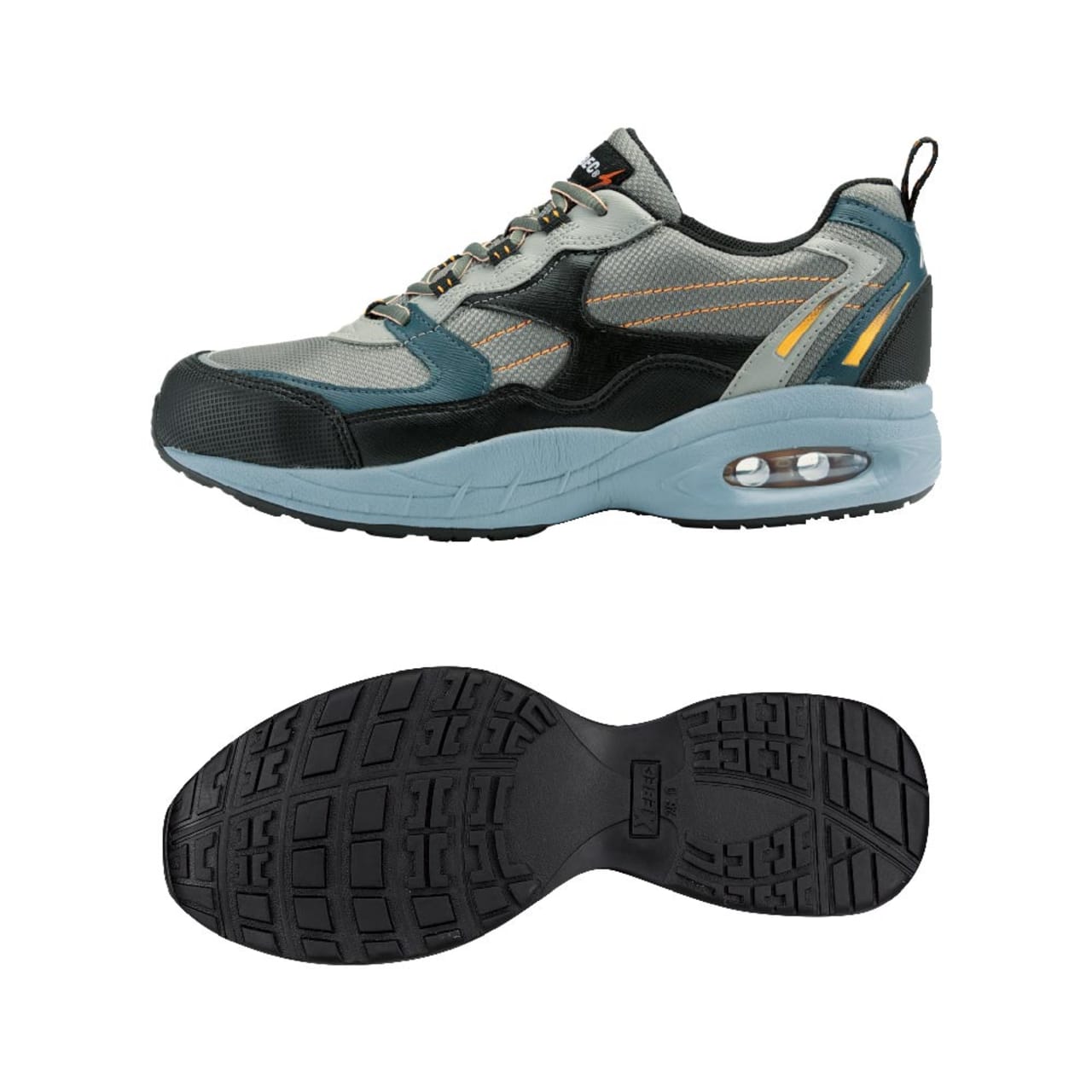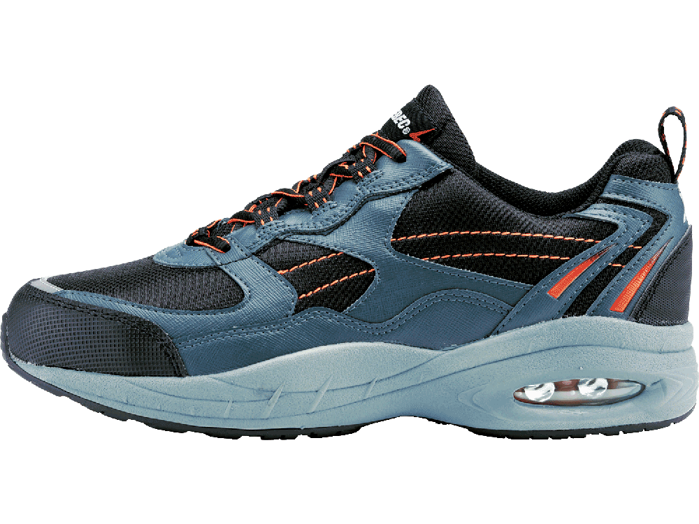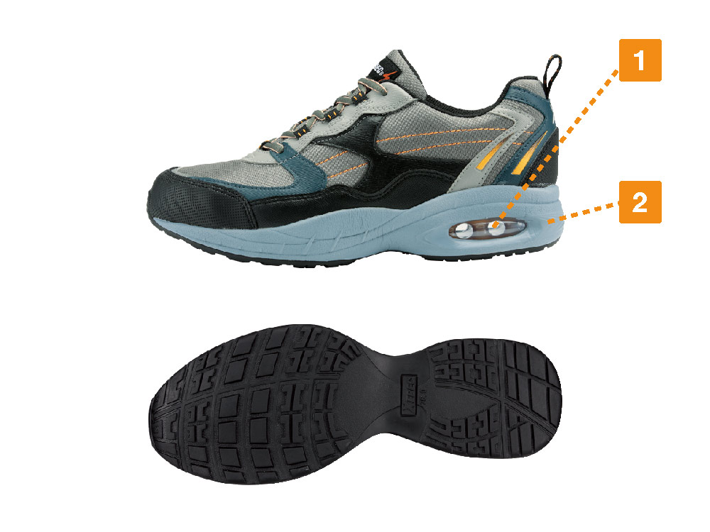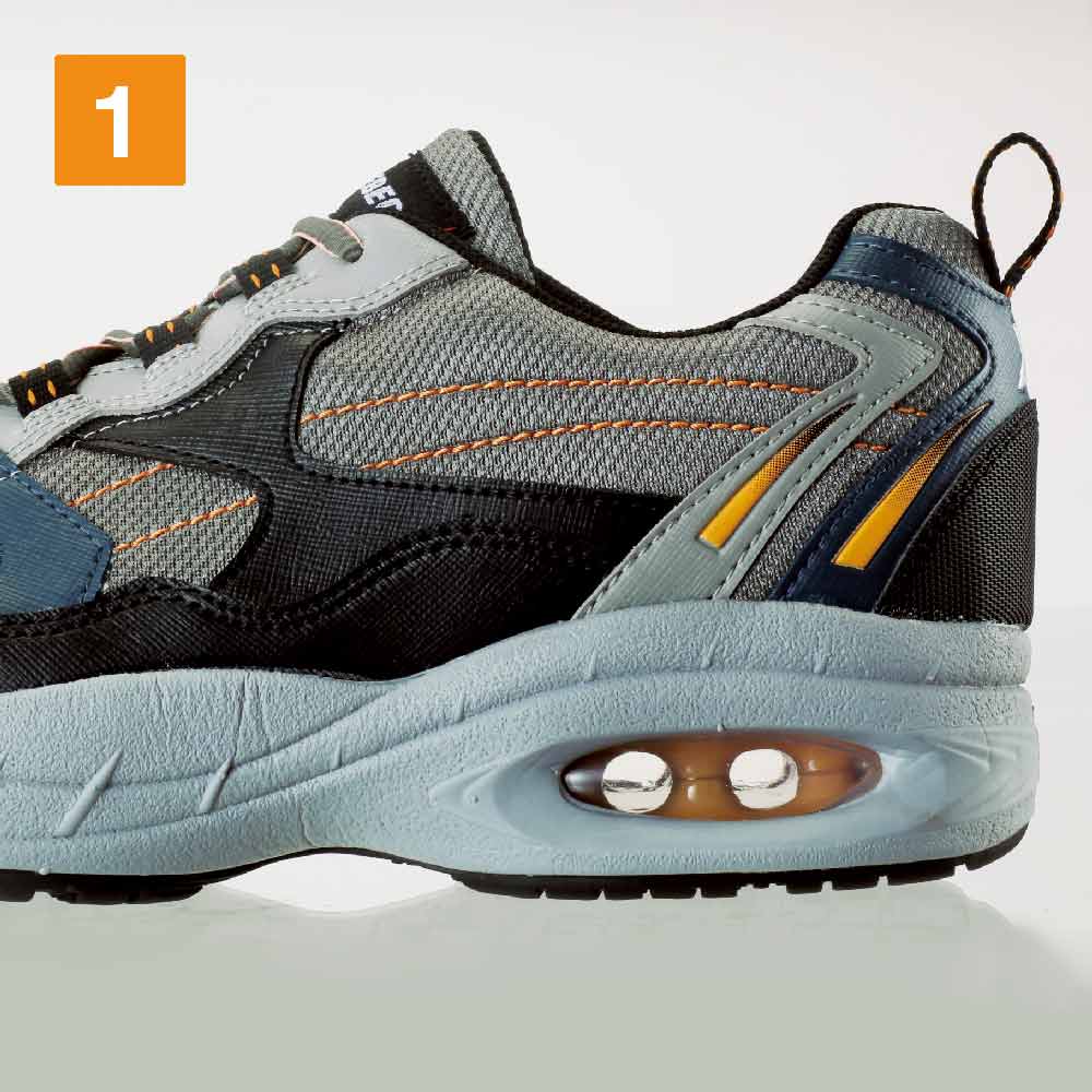 接地面から5cmまでの水の侵入を防ぐ、高い防水性能が人気の安全靴です。屋外はもちろん、水濡れの多い現場でも常に快適な着用感が持続します。さらに、体や服に帯電した静電気を床面へと逃がす、静電気帯電防止機能がポイント。静電気を嫌い、水濡れしやすい作業環境におすすめのシューズです。また、かかとに配置されたエアタンクが、高い衝撃吸収力で足への負荷を低減し、疲れにくいシューズに。また、デザイン上のアクセントにもなっています。