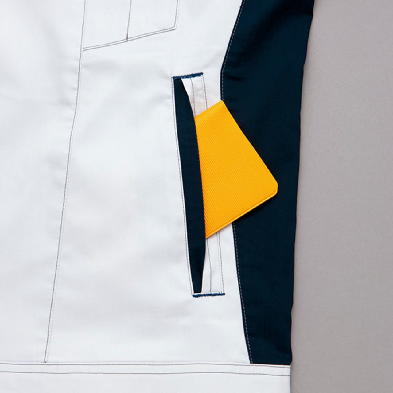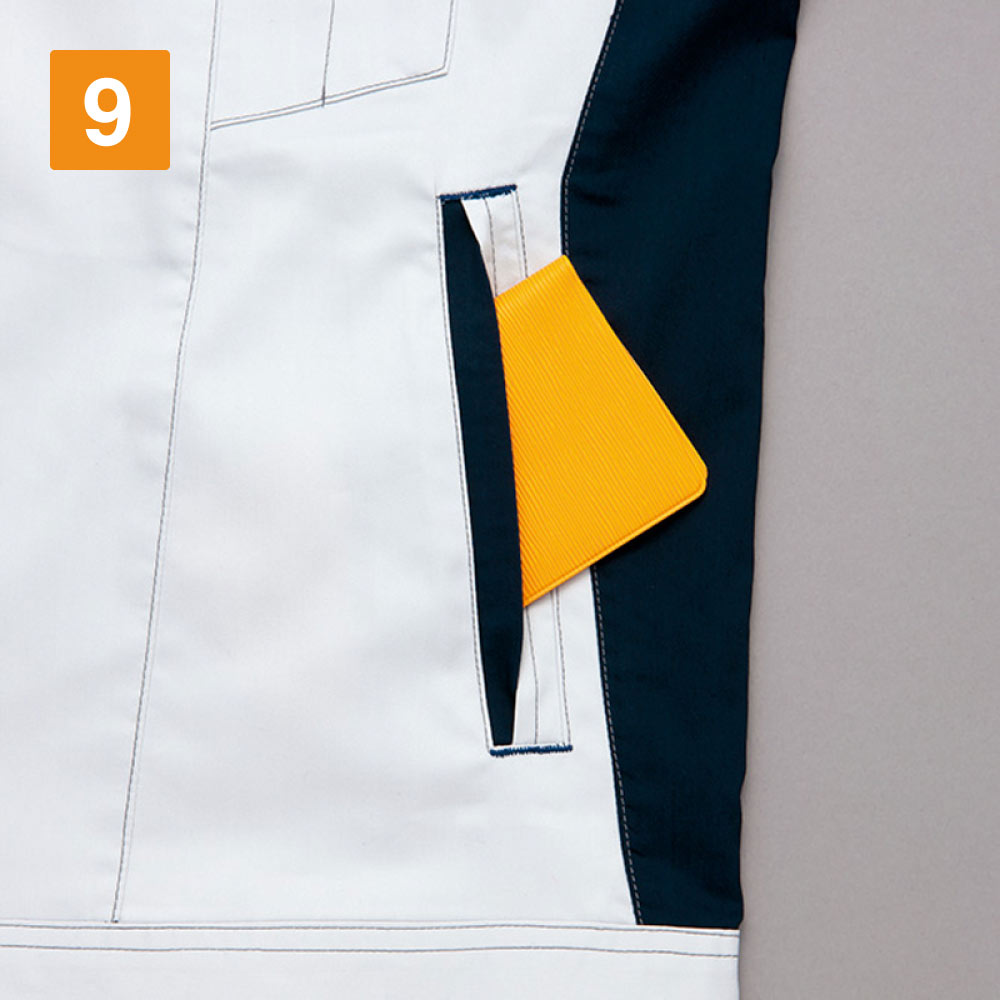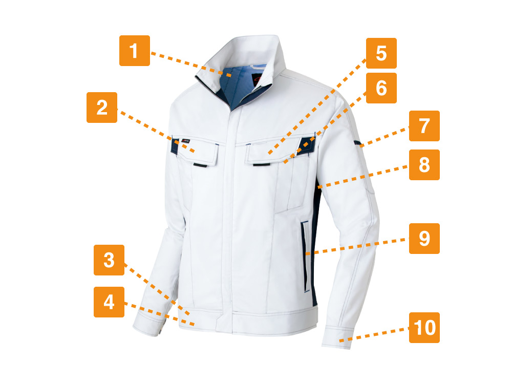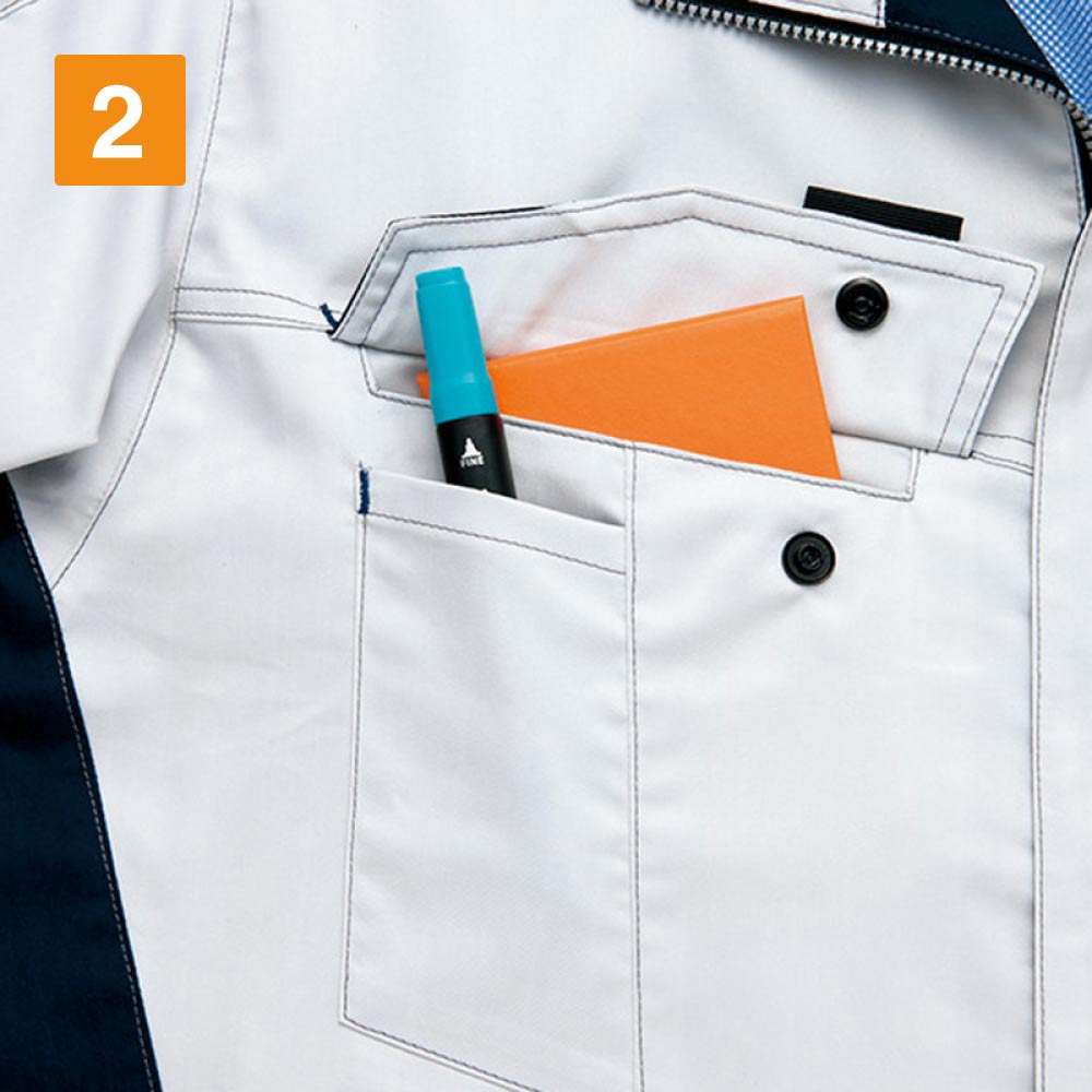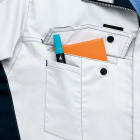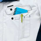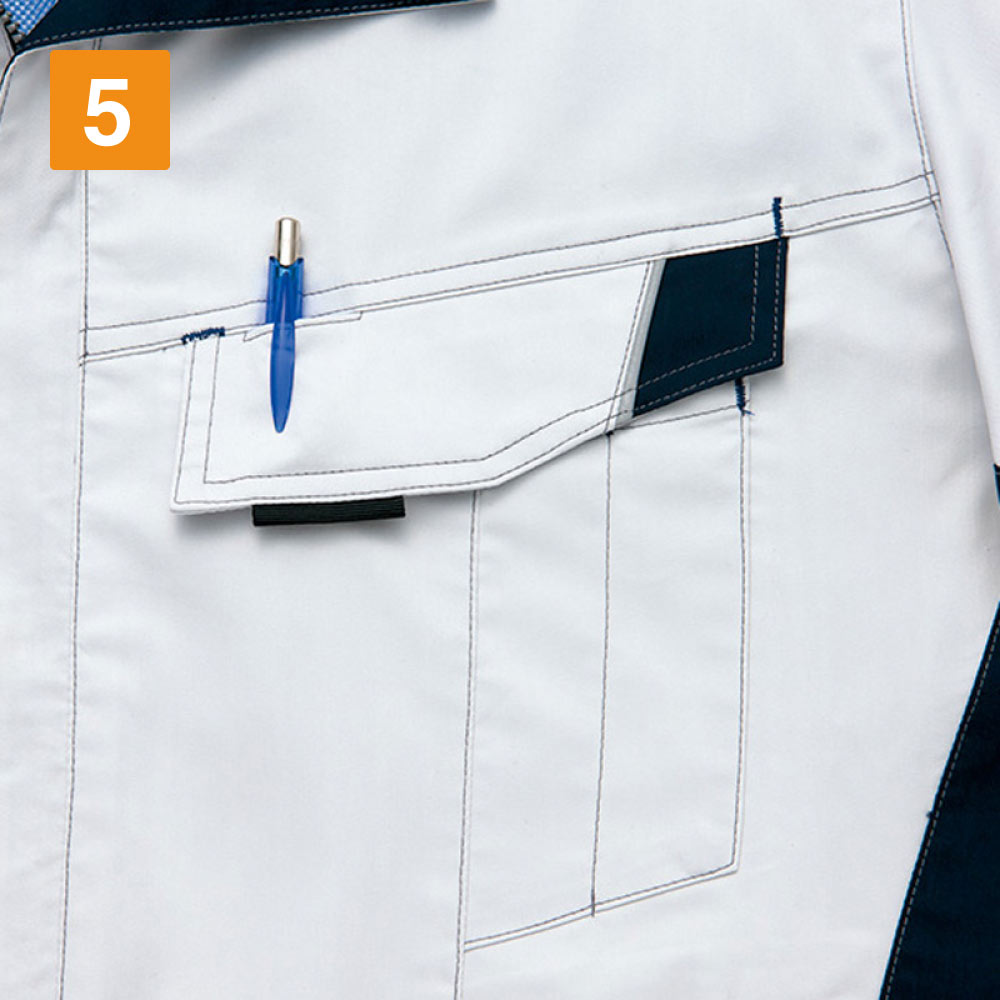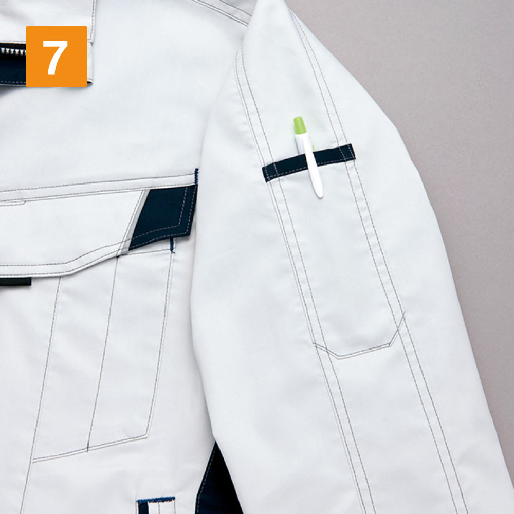 機動性やデザインが優れているのはもちろんのこと、収納面でも選ばれている一着。胸ポケットはペンやスケールをすっきり仕分けて収納できる、マルチポケット仕様。小物をたくさん持ち歩く方にもおすすめのウェアです。また、胸のペン差しはペン先がフラップから飛び出すディテールを採用。すっと取り出せるので、ペンによる筆記の多い現場でもスマートな立ち振る舞いを可能にします。さらに袖にペン差しを備えることで、複数のペンを用途や使用頻度に分けて収納可能です。IDや社員証などを携帯される方に最適なループも付属し、さまざまな職場で便利に着用できるブルゾンになっています。