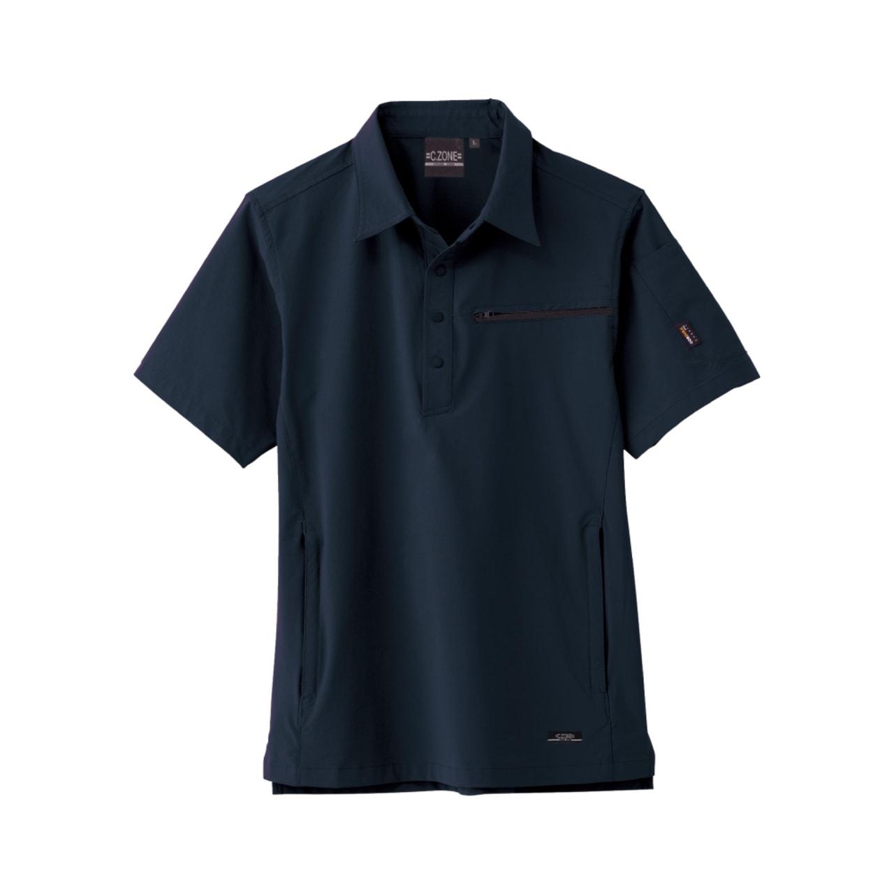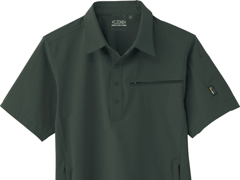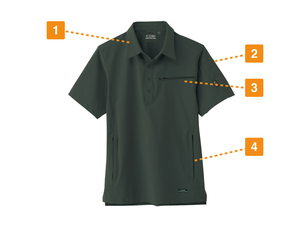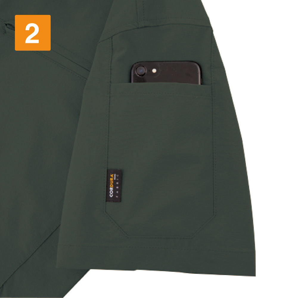 スタイリッシュさを保ちながら、半袖シャツとしては驚きの収納力を備えたウェアです。左胸に1ヵ所、両脇に2ヵ所、さらに左袖に1ヵ所の収納を有しており、左胸のポケットはファスナー付き。前にかがんでも物が落下しにくく安全作業をアシストしてくれます。左脇ポケットもファスナー付きで安全かつ大容量設計で、手帳やスマートフォンなどもすっぽり収納可能。優れた収納でお仕事の効率アップも期待できる一着になっています。