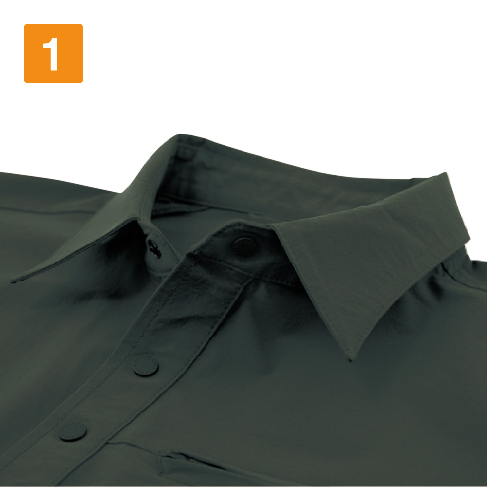 かっこいいだけでなく、機能面でも優れたウェアです。高い接触冷感性を持つ生地を使用し、暑い時期でもひやりとした肌触りが楽しめます。また、摩擦、摩耗に強いコーデュラストレッチを使用しているため、毎日のヘビーユーズでもへたりにくく、タフに着こなせるのもポイント。生地は頑丈ながら軽量なので、長時間の着用でも疲労を感じにくく、夏らしい爽やかな着心地もお楽しみいただけます。ボタンやファスナーには樹脂製パーツを採用し、汗などをかいてもさびる心配がなく、また蓄熱しにくいので夏場の作業でも不快感を感じさせません。
