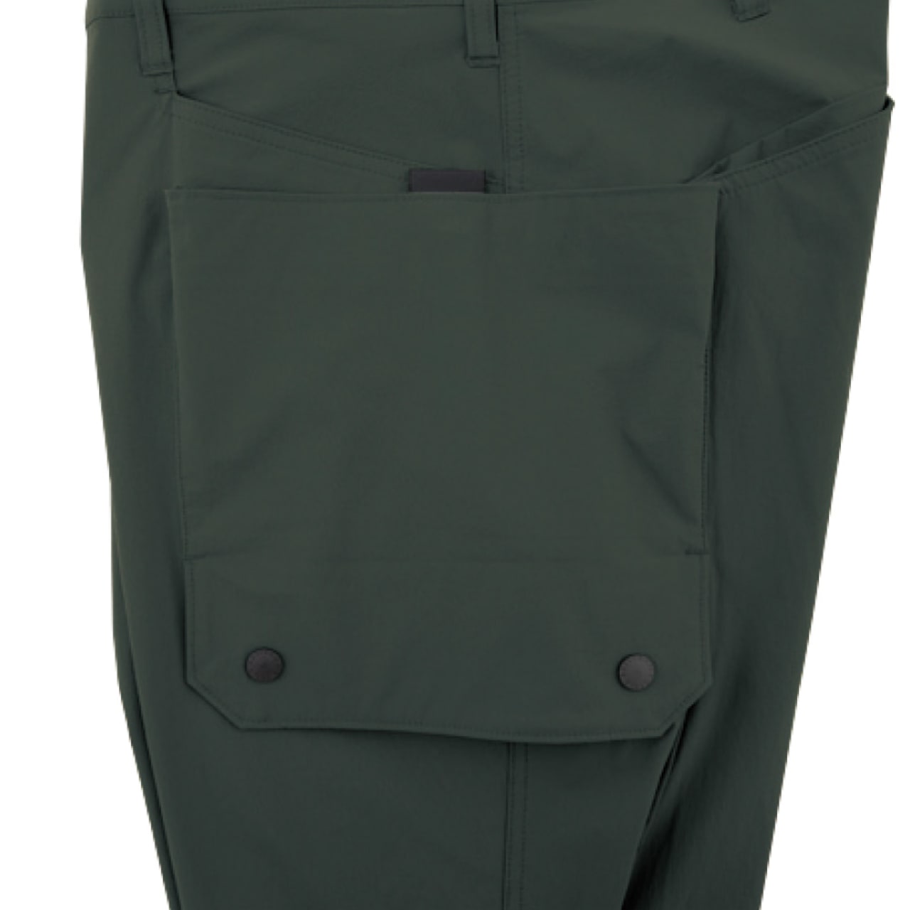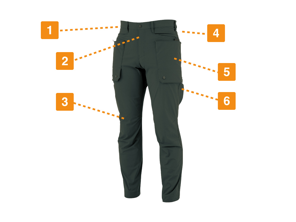 すっきりとしたシルエットに、パネル型のポケットを組み合わせたデザインがかっこいい!とスタッフ内でも話題のパンツです。機能面でも優れており、両脇ポケットとヒップポケットに加えて、大判のカーゴポケットを備えることで大容量収納を実現!財布や携帯電話をはじめとして、必需品をすべてパンツだけで持ち運びできる収納力を備えています。また、右脇には、カラビナなどを提げておくのに便利なループ付き。カギなど使用頻度の高いものを提げておけば作業効率がぐんとアップします。