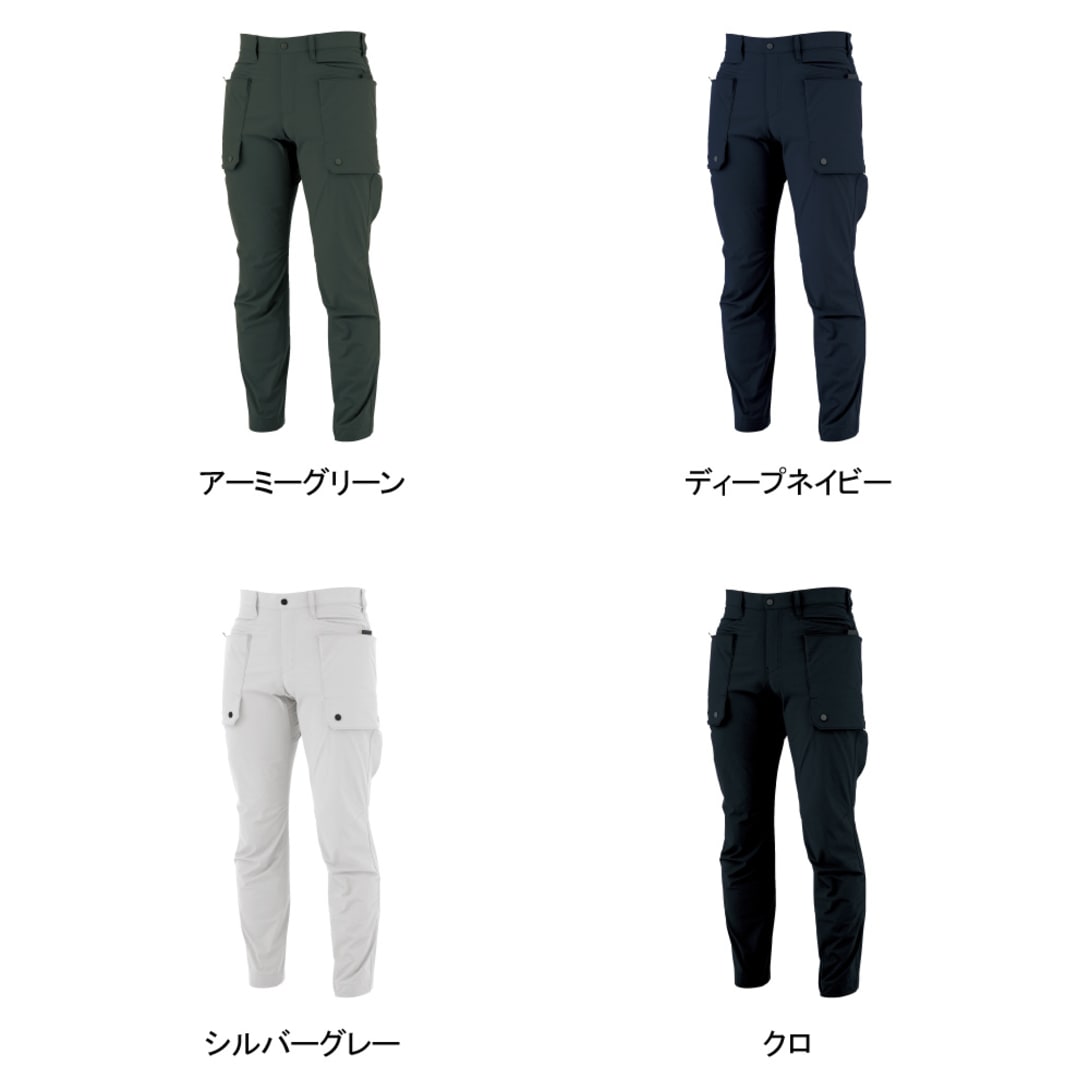 無駄を削ぎ落としたミリタリーテイストが今らしい、スタイリッシュワークウェア。裾に向かってややテーパーのついた、スマートシルエットが魅力の一着です。脚をすらりと見せ、作業姿を洗練された印象にしてくれます。また、ポイントは生地の持つストレッチ性能。体の動きを妨げず、作業着に求められる機動性をしっかり確保しています。さらに、夏場には最適な接触冷感性や耐久性など、シンプルなデザインに多くの機能が込められたウェア。サイズはS〜5Lまでと幅広いラインナップになっており、ユニフォームとしても人気のモデルです。