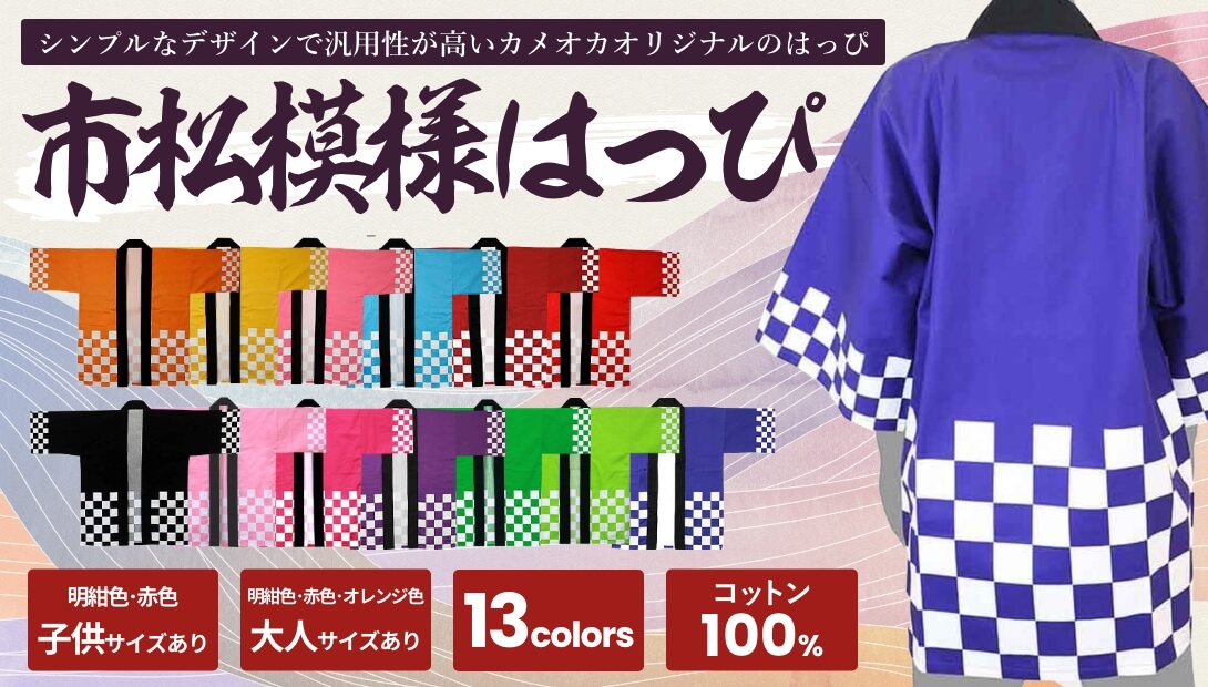 はっぴではお馴染みの市松模様はっぴ。カメオカの市松模様はっぴは、裾と袖口に市松模様が入っております。注目ポイントはなんといってもカラフルなカラー展開と子供~大人まで揃う豊富なサイズ展開。カメオカオリジナルアイテムなので他社では販売をしておりません。また、大量に生産することによりコストを抑え、高品質でリーズナブルな販売価格を実現してります。そのまま使用しても良いのですが、背中や両衿にプリントを入れると手軽にオリジナルのはっぴを製作することが可能です。