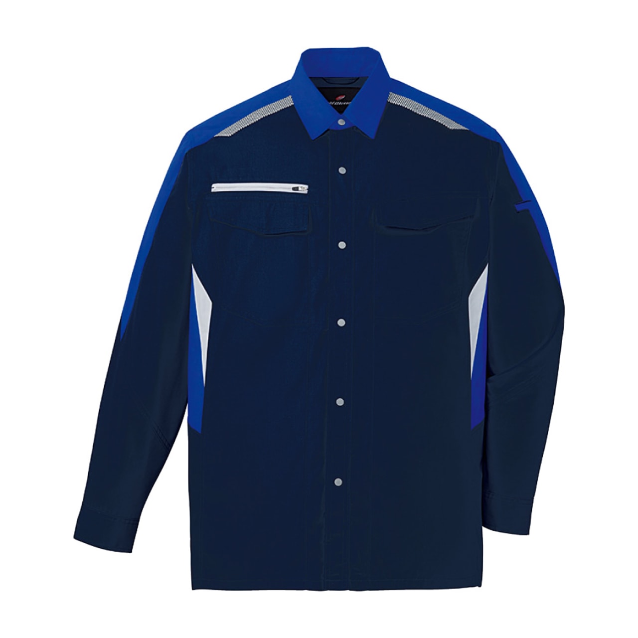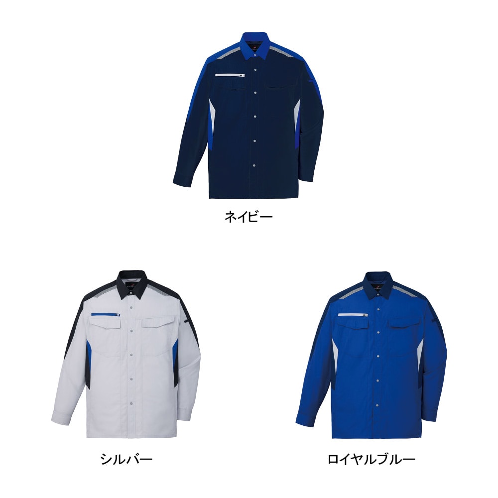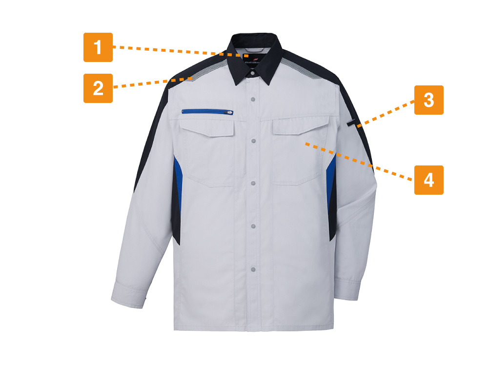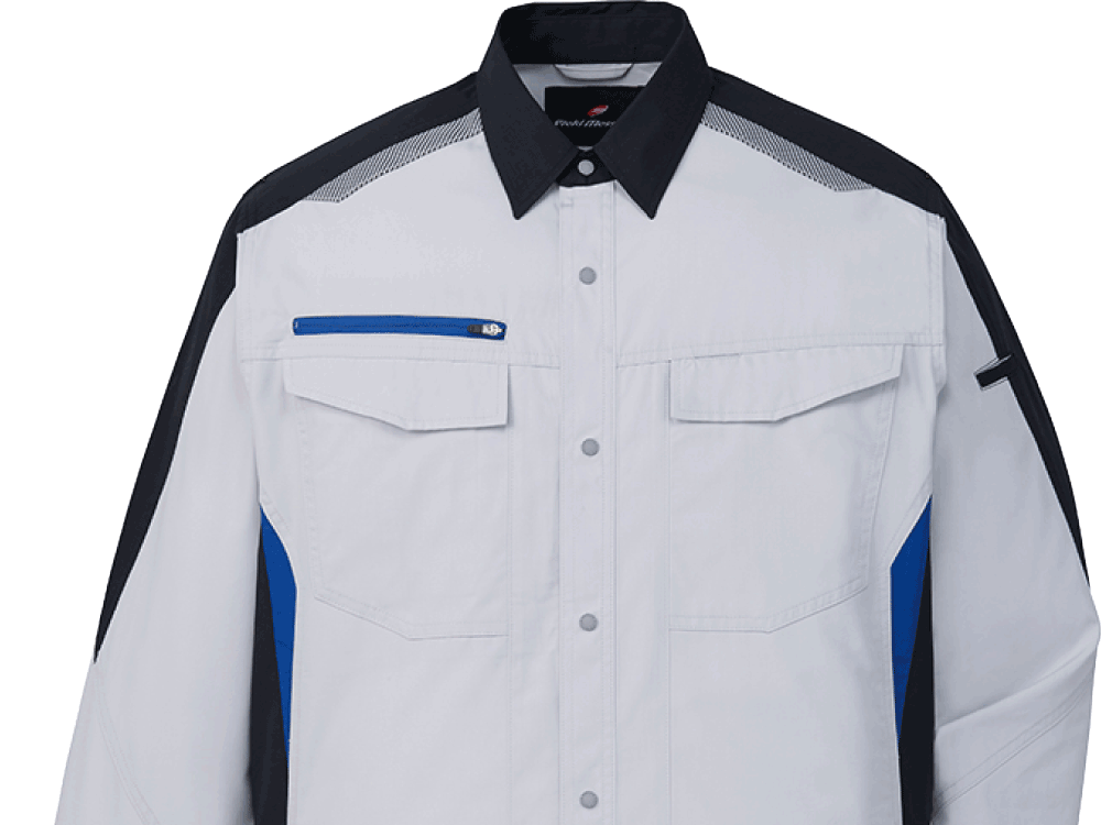 カラー切り替えを巧みに活かしたワークシャツ。ベースカラー、ファスナカラーに差し色を加えた3色で、シンプルながら存在感あふれる一着に。特に襟部分のカラー切り替えが印象的で、ルックスに独特のかっちり感をプラスしています。接客などのお仕事にもおすすめです。生地には、抗ウイルス加工が施されているので、さまざまな職場で安全に着用いただけます。また、レディース用シルエットが用意されているのもポイント。SSとSサイズは女性の体型にフィットするよう設計されており、男女問わず快適な着用を可能にしています。