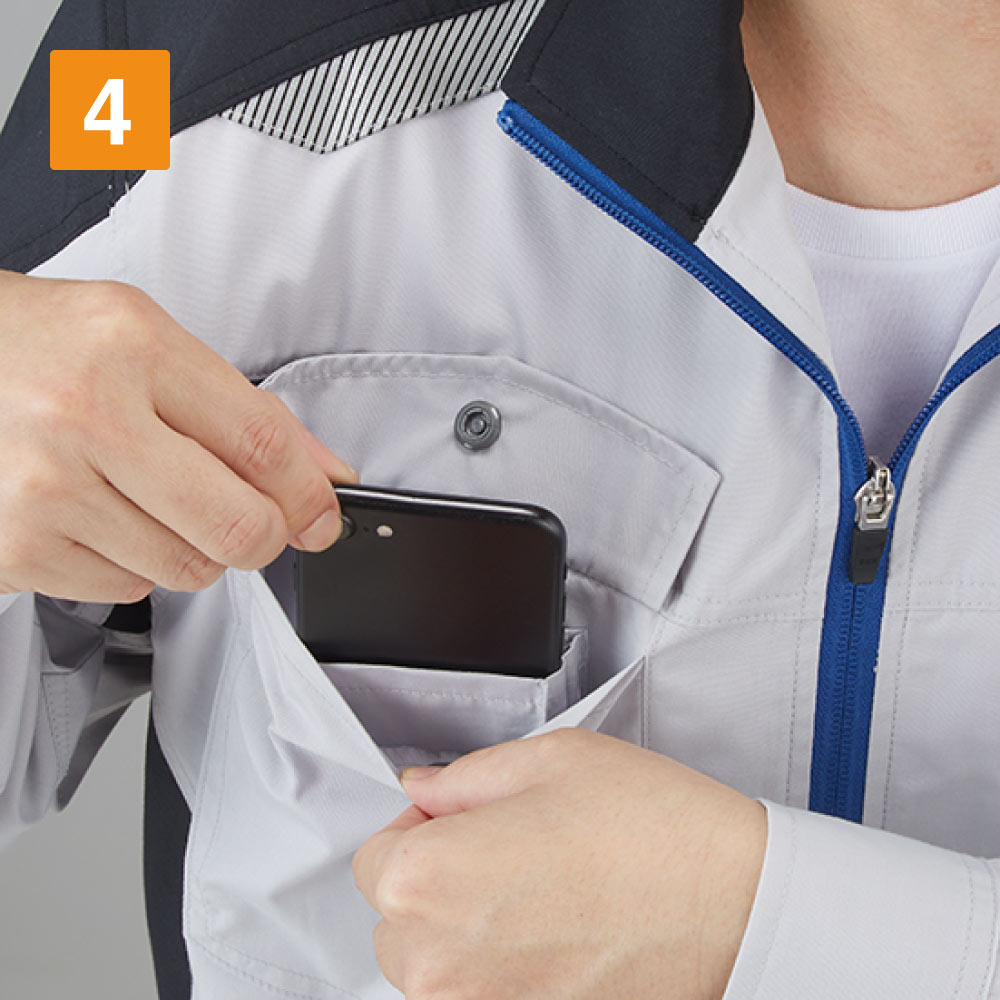 安全性と作業効率をアップしてくれるディテールにも注目の一着です。費用頻度の高い左胸ポケットは、はフラップポケットとファスナーポケットのダブル仕様。散らばりがちな小物も仕分けてすっきりと収納可能です。また、右胸はスマートフォンもすっぽりしまえる専用ポケット、左袖にはペン差しなど、用途に分けて使える便利な収納が採用されています。また、肩部分にはシャープなデザインの反射テープが配置されています。夜間の視認性をぐっとアップし、安全な作業をアシスト。デザインもかっこいい!とスタッフから人気のディテールです。
