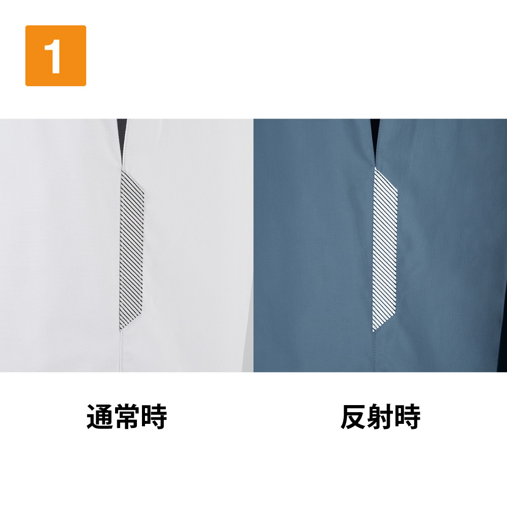 デザイン性と機能を両立させたディテールもポイント!両サイドの脇ポケット下には、シャープな形状の反射テープが配置され、暗所や夜間の視認性をアップしています。安全性を高めつつ、昼間はデザイン上のアクセントとしてもおしゃれに全体を彩ります。また、収納面では、両脇とヒップのポケットに加え、大判のカーゴポケットを備え大容量収納を実現しています。カーゴポケットはマチ付きで、フラップ付きで物の落下がしにくいのも嬉しいポイント。パンツだけで必需品をすっきり収納可能です。