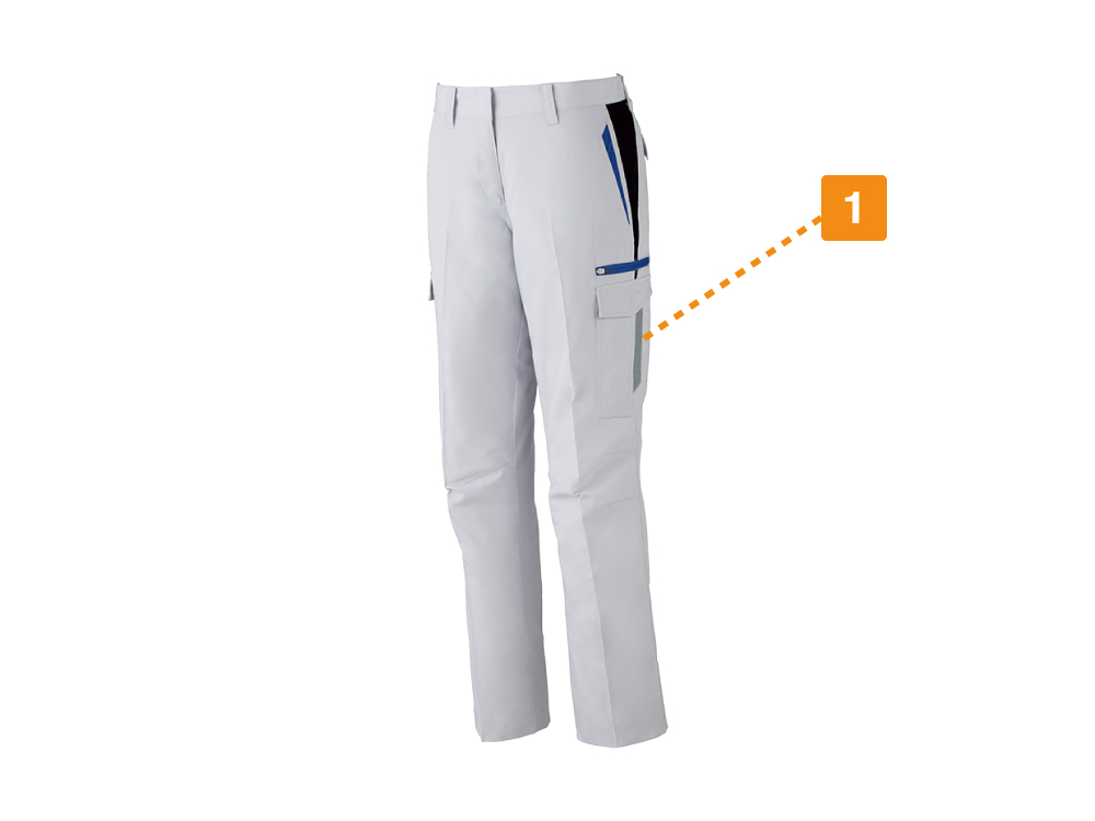 安全性や収納力といった、機能面のディテールにも注目のカーゴパンツです。ポイントは両サイドポケット下に配置された反射テープ。夜間作業の視認性をアップし、より安全な作業を可能に。シャープな形状のアクセントとしても機能し、パンツをスタイリッシュに演出します。収納面では、マチ付きの大容量カーゴポケットを採用し、厚みのあるものもすっきり収納いただけます。また、女性用だけのディテールとして、腰回りに裏地が施されているので、インナーの透けを気にしなくていいのも嬉しいポイントです。