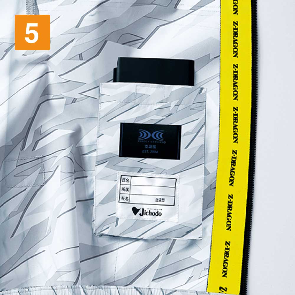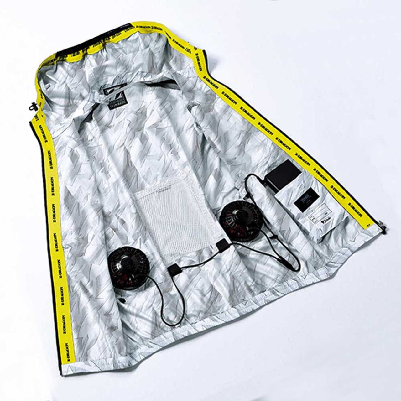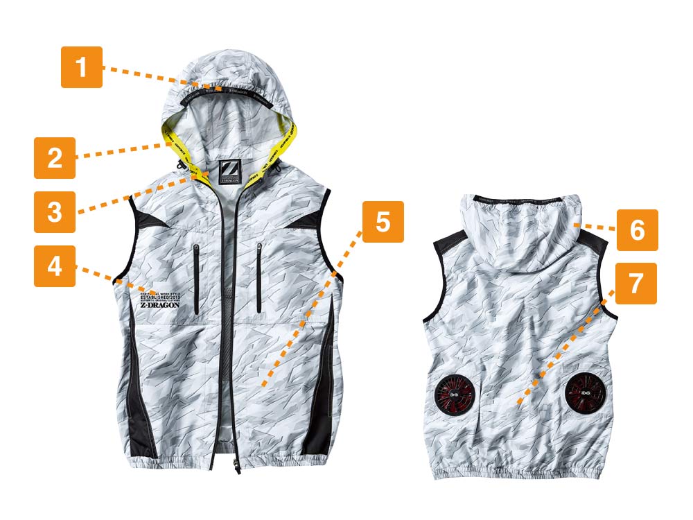 フード内側から裾まで繋がった、ストリート感のあるイエローのロゴ入りニットテープが、とてもおしゃれなアクセントに。優れたデザイン性で、作業時はもちろんスポーツ観戦時やアウトドアにも馴染む、クールな空調服です。胴体部分側面には全体を引き締めるブラックの生地切り替えを採用。空調服を着用していてもぐっとシャープな印象にしてくれます。また、空調機能を支える細やかな機能面も充実し、夏場の作業に欠かせない一着になっています。