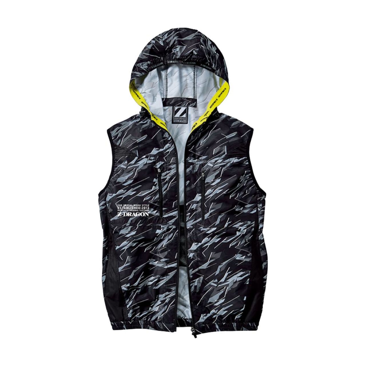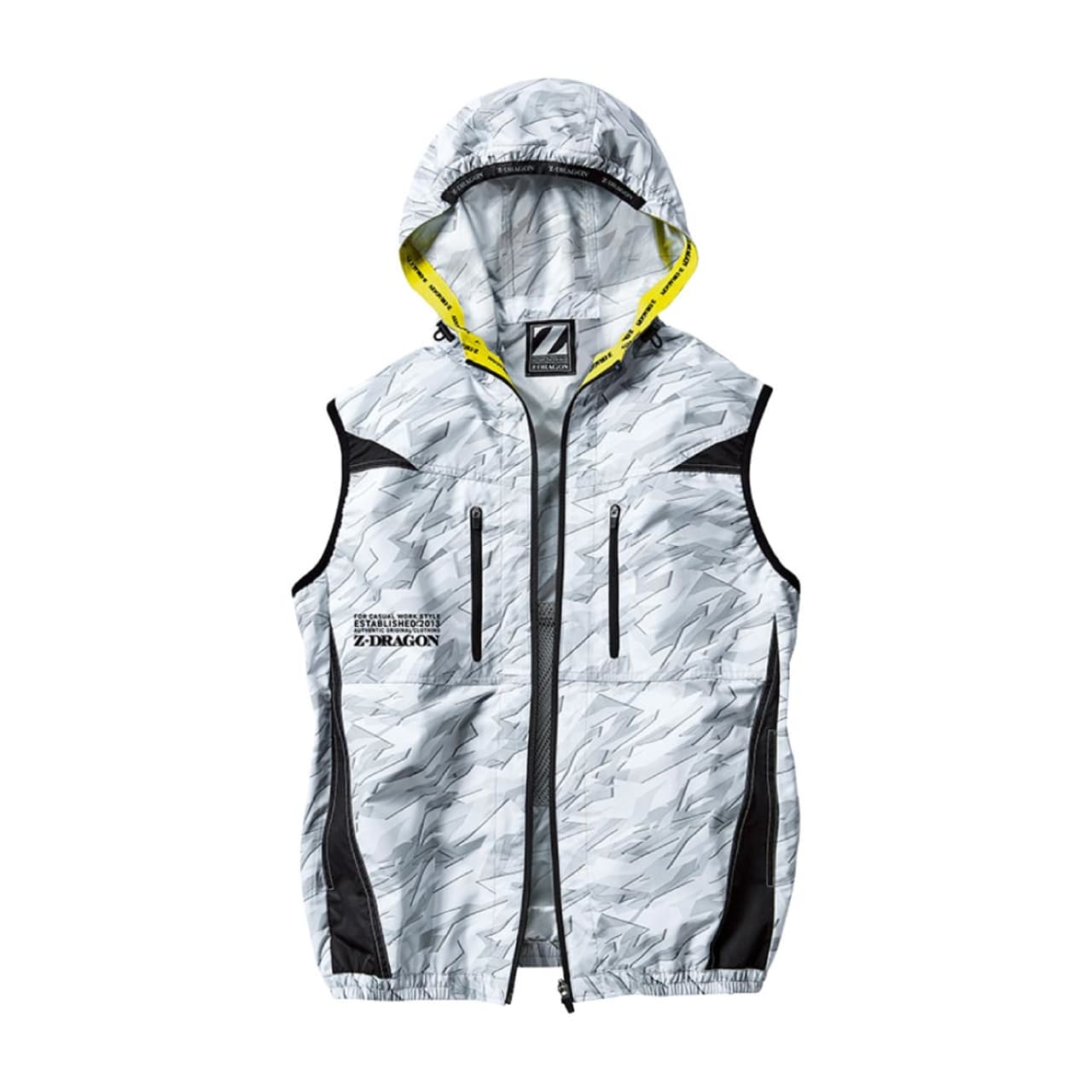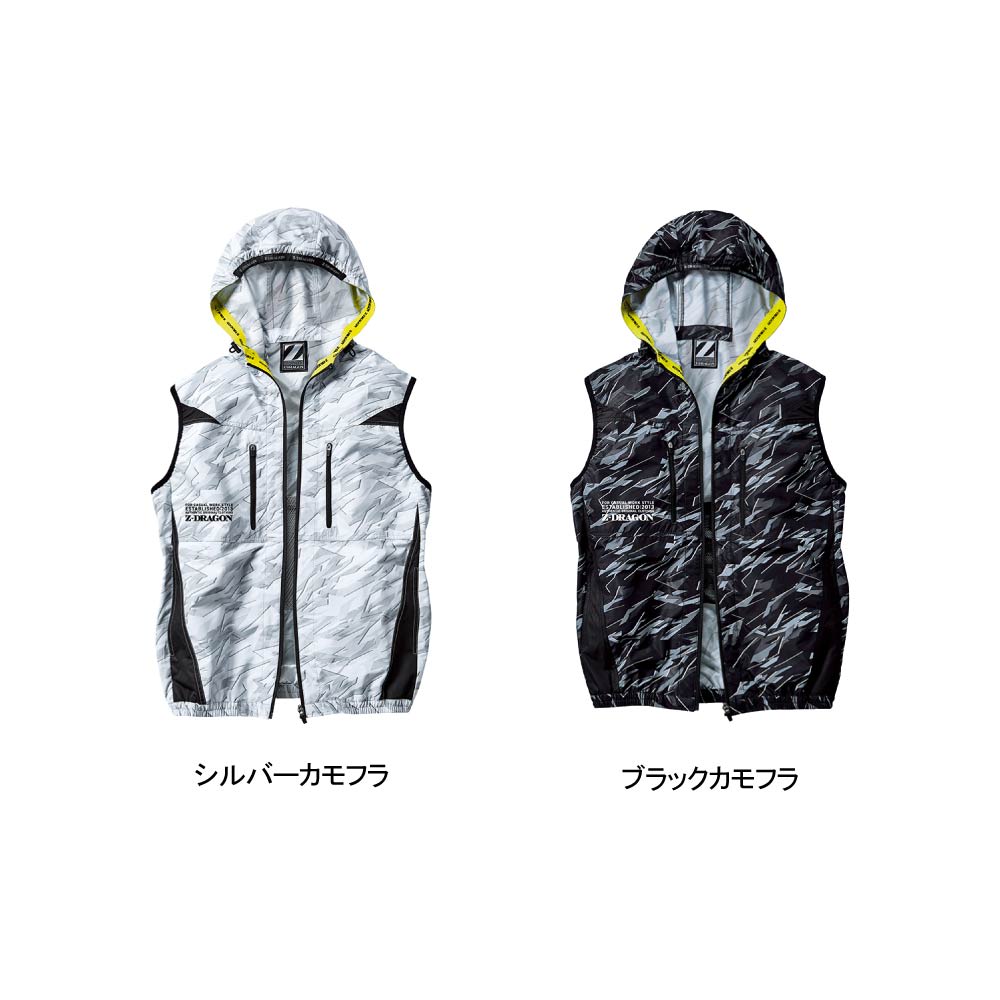 フード内側から裾まで繋がった、ストリート感のあるイエローのロゴ入りニットテープが、とてもおしゃれなアクセントに。優れたデザイン性で、作業時はもちろんスポーツ観戦時やアウトドアにも馴染む、クールな空調服です。胴体部分側面には全体を引き締めるブラックの生地切り替えを採用。空調服を着用していてもぐっとシャープな印象にしてくれます。また、空調機能を支える細やかな機能面も充実し、夏場の作業に欠かせない一着になっています。