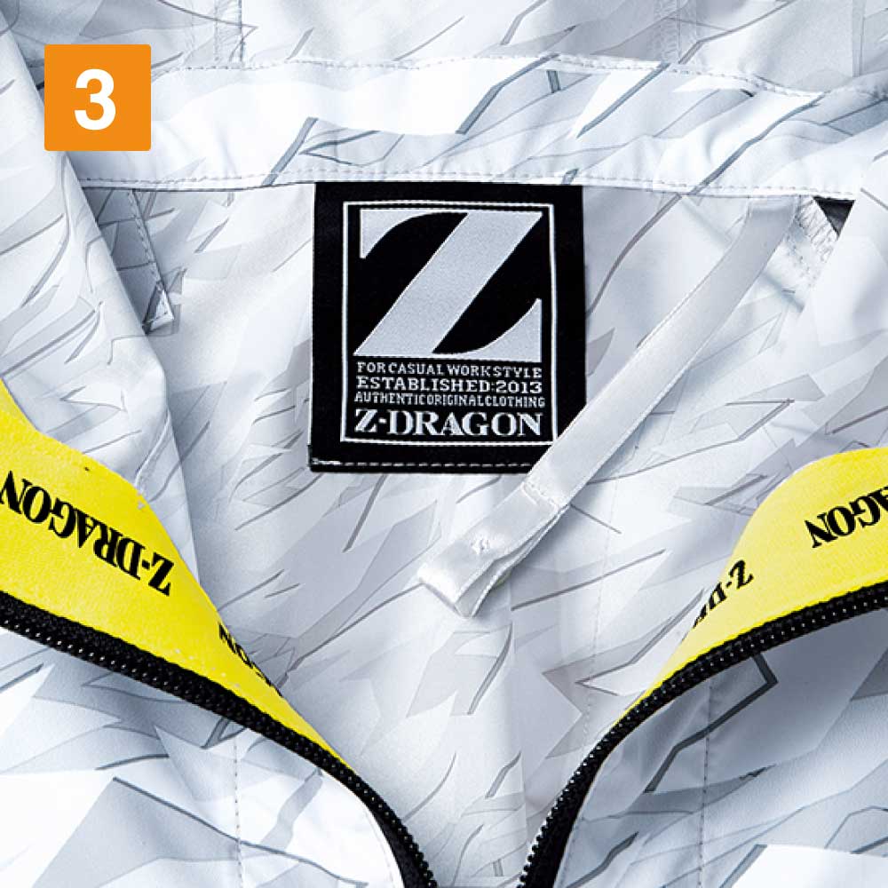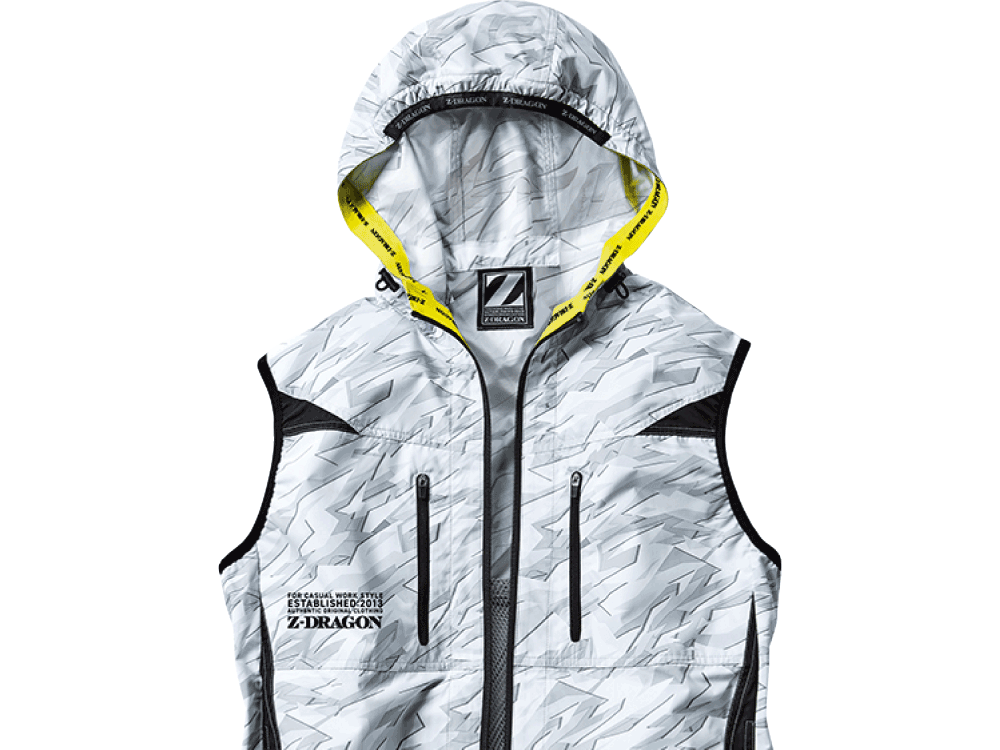 快適かつ安全な作業を可能にする、こだわりのディテールにも大注目のウェアです。パンチング加工の施されたフードがポイント。フードを被っても視界や音の制限が少なく、安全な作業を可能にします。また、フードのエッジにはロゴ入りテープが配置されています。内側はすべり止めのシリコンテープになっているので、フードを被った際の不快なずり上がりなどを解消。また、裾はゴムで身体にフィットし冷気が逃げにくく、常に服内の環境を快適に保ちます。