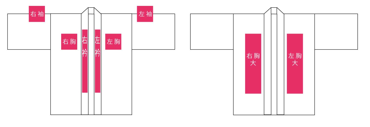 | 加工サイズ | 両衿 | 背中(小)/横25×縦25cm以内 | 背中(中)/横35×縦30cm以内 | 背中(大)/横35×縦40cm以内 | 両衿+背中(小) |