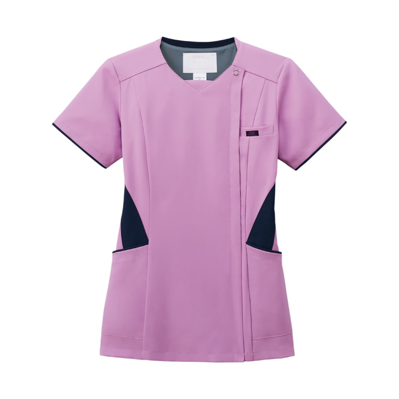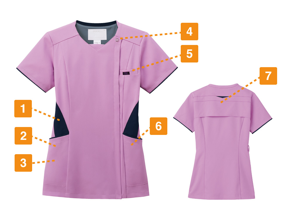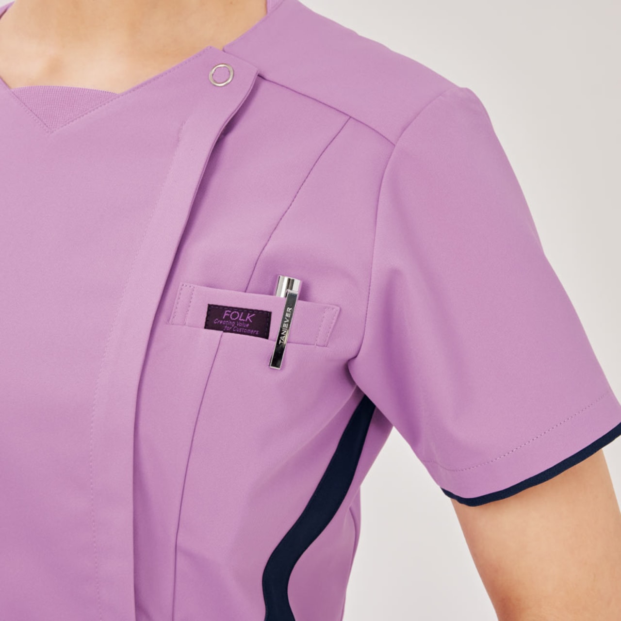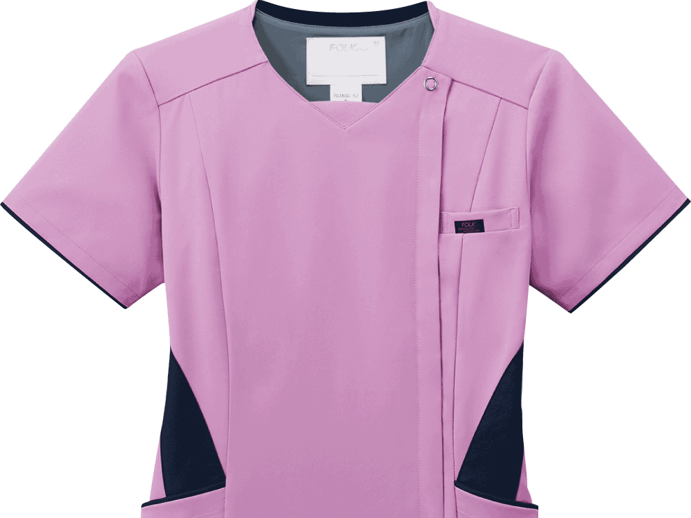 従来の被って着用するスクラブではなく、フォークが独自開発した羽織って着られるスクラブ。前開きで着脱がとてもスピーディに行えるので、ストレスを感じさせません。着脱の際に生地が顔に触れないので、メイクなどが崩れる心配がないのも嬉しいポイント。また、女性の体型にフォーカスした設計が採用されているのも特徴で、ウエストから腰にかけてややフレアな形状とすることで、生地の余りやつっぱりを抑え、動きやすく美しいシルエットに。