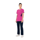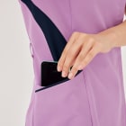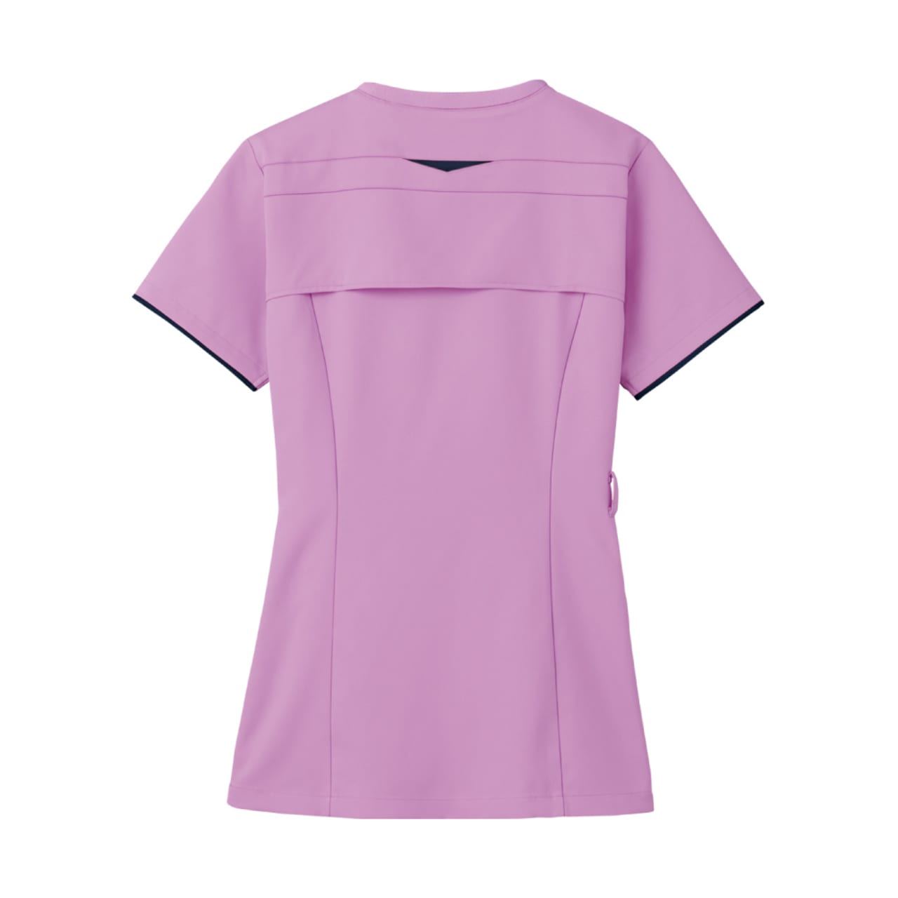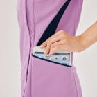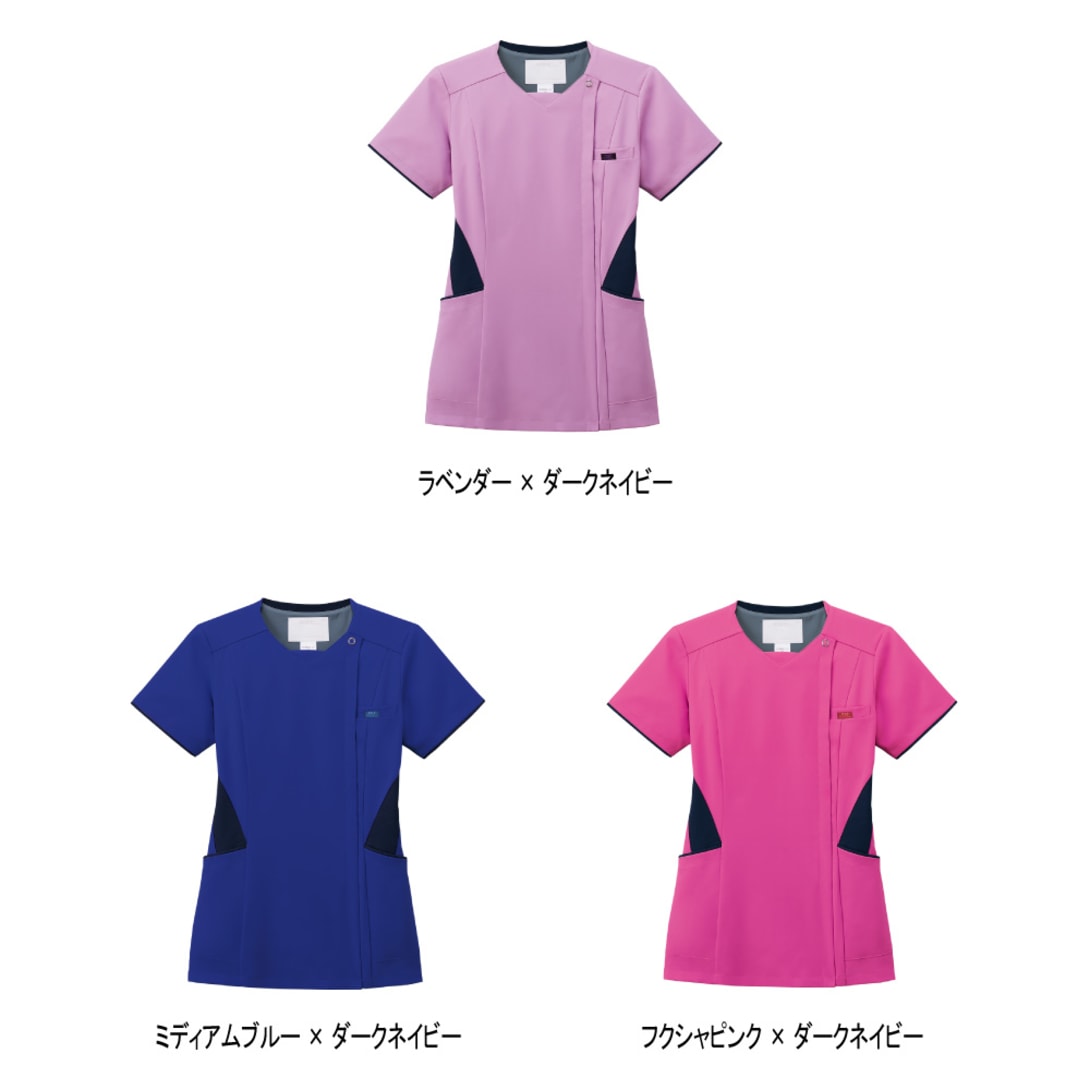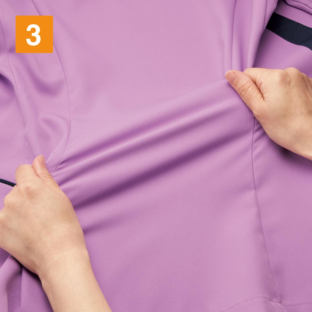 従来の被って着用するスクラブではなく、フォークが独自開発した羽織って着られるスクラブ。前開きで着脱がとてもスピーディに行えるので、ストレスを感じさせません。着脱の際に生地が顔に触れないので、メイクなどが崩れる心配がないのも嬉しいポイント。また、女性の体型にフォーカスした設計が採用されているのも特徴で、ウエストから腰にかけてややフレアな形状とすることで、生地の余りやつっぱりを抑え、動きやすく美しいシルエットに。