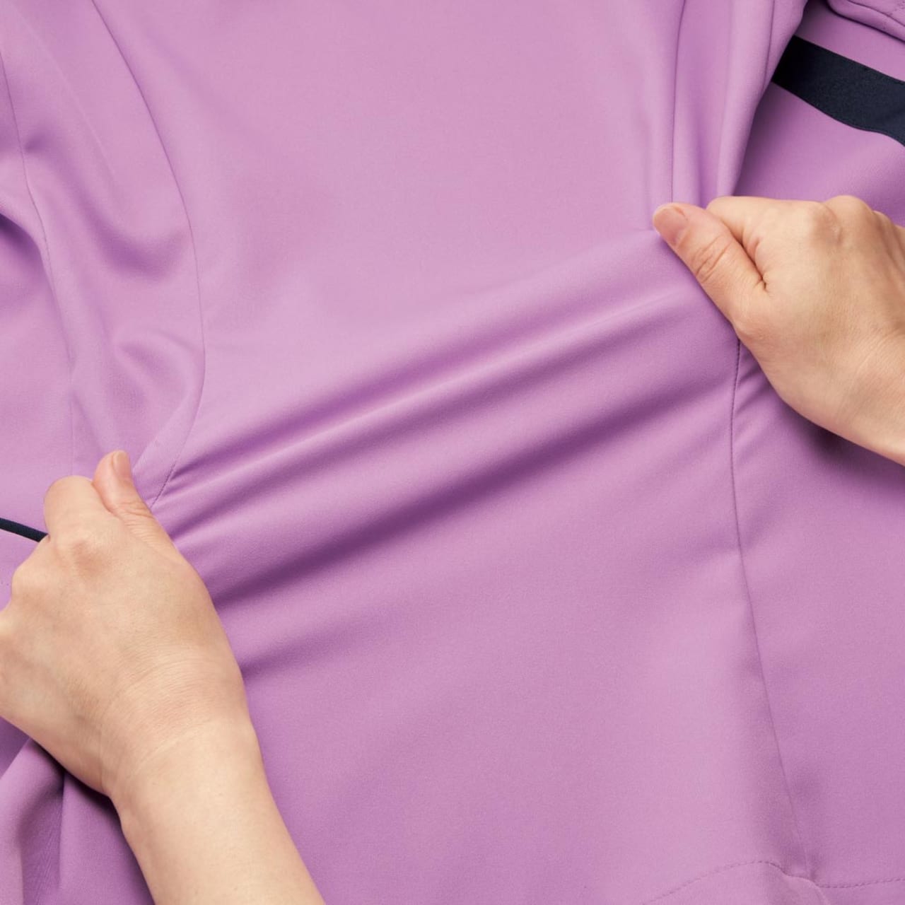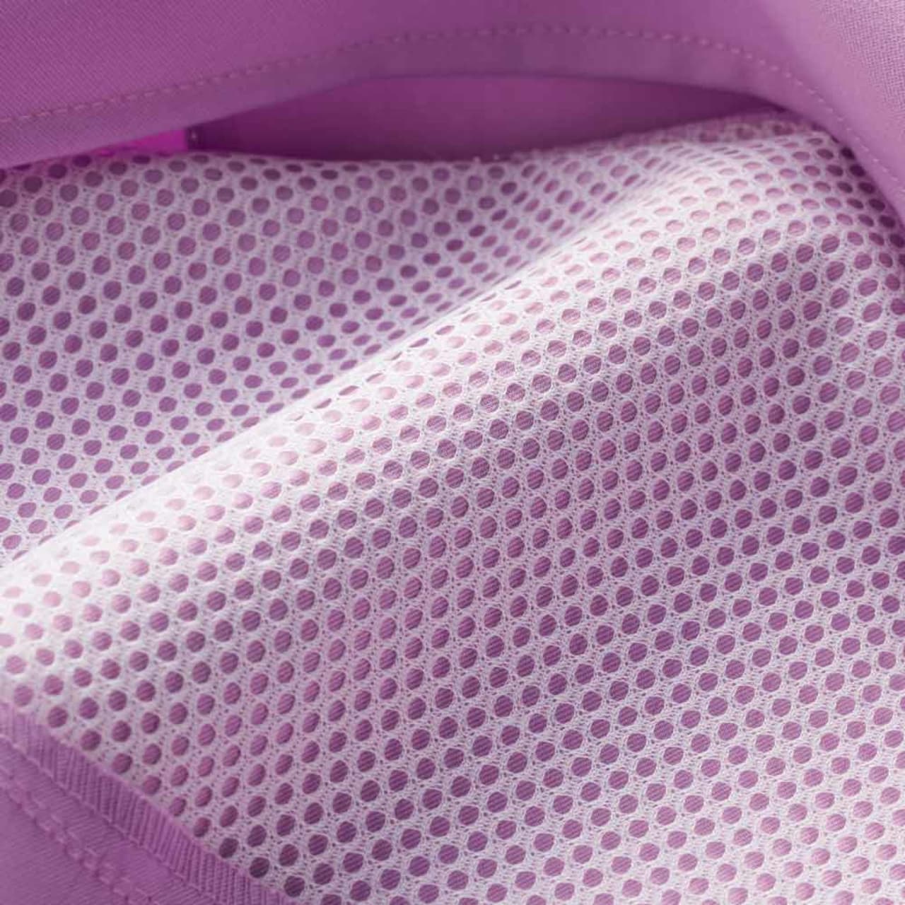 本体生地に使用されているのは、アリオンストレッチ。肌触りのいいナチュラルな質感が魅力の生地です。ストレッチ性能を備えているから、体の動きを妨げずストレスを感じさせません。また、高密度に織り込まれたツイル生地なので、適度なハリとコシがあるのも特徴。体にはりつきにくく、不快感が少ないのもポイントです。肌に触れる側には心地いい質感のフルダル糸が採用されているので、肌へのストレスも抑えたモデルになっています。