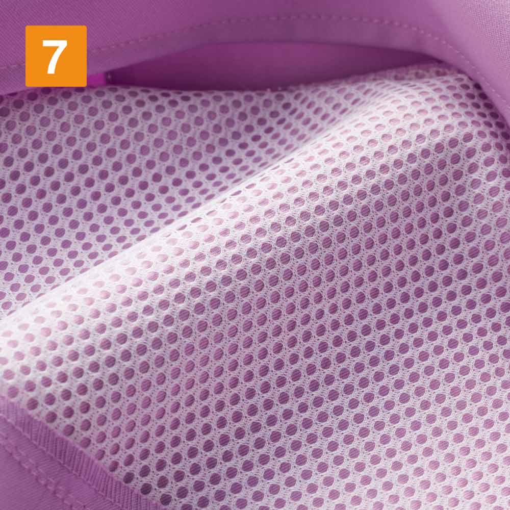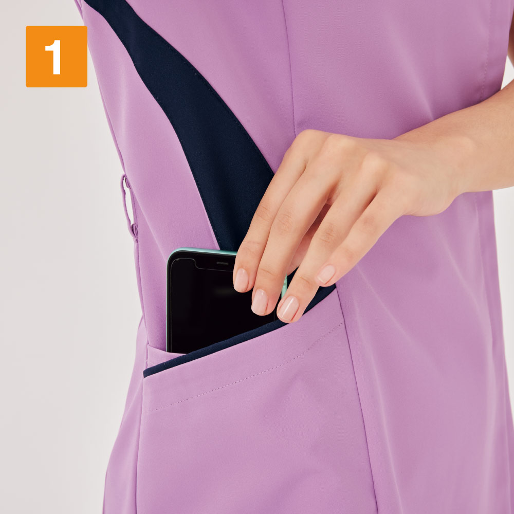 服の裾から背中の排出スリットまで空気が抜けるように設計されたスクラブ。服の内部を常に心地よい状態に保ち、お仕事時のストレスも低減してくれます。背面の排出スリットの部分は裏地にメッシュを使用し、より効率的に空気を排出。熱がこもらず、暑い季節にぴったりの仕様です。収納面では、左胸と両脇にポケットが配置されています。脇ポケットは、タブレット端末もすっぽり入る超大判デザイン。さらに、右脇には携帯電話用のミニポケットや、はさみなどをつないでおけるループも備えています。持ち物を整理して持ち運べるので、お仕事の効率もアップ!