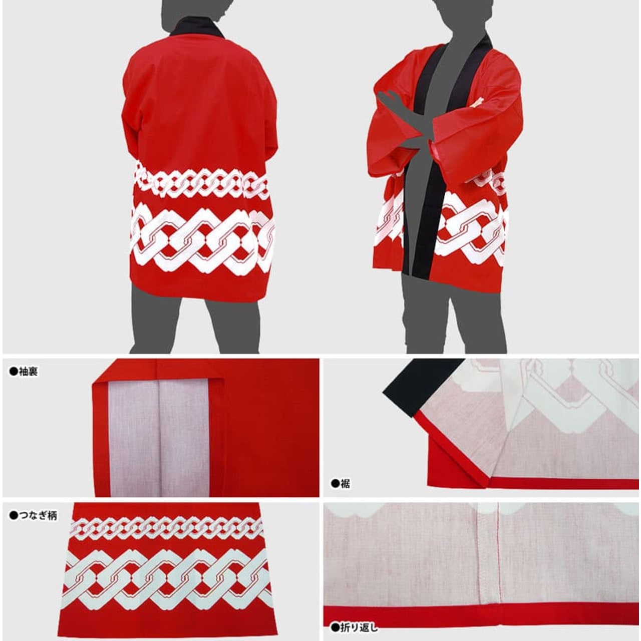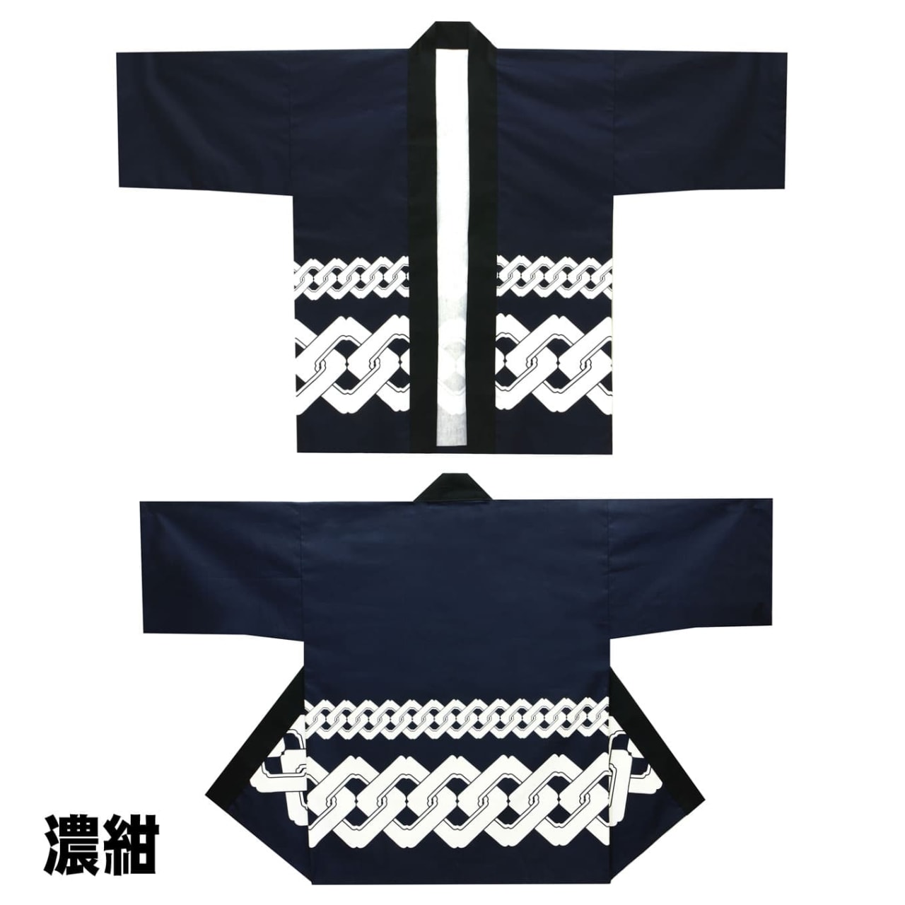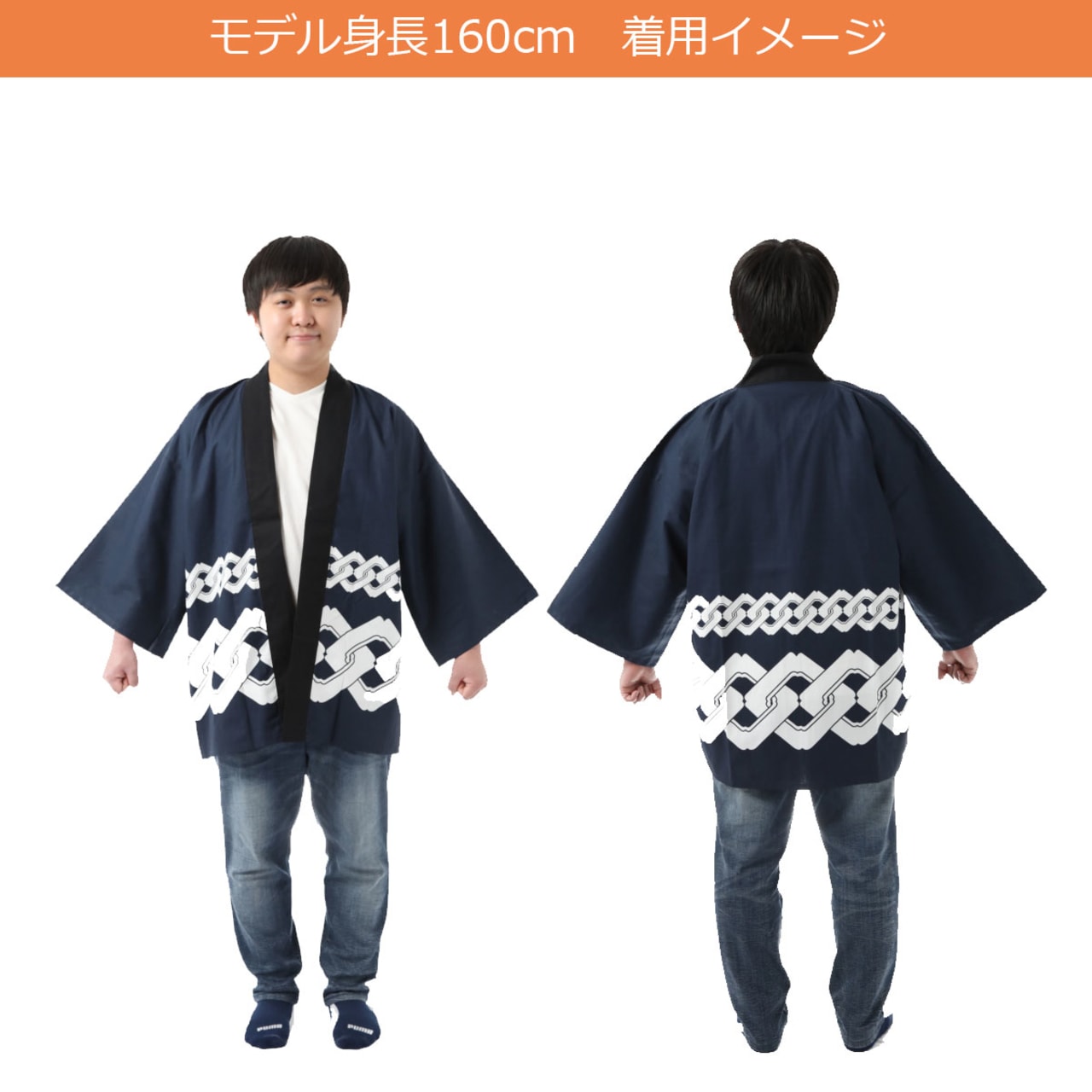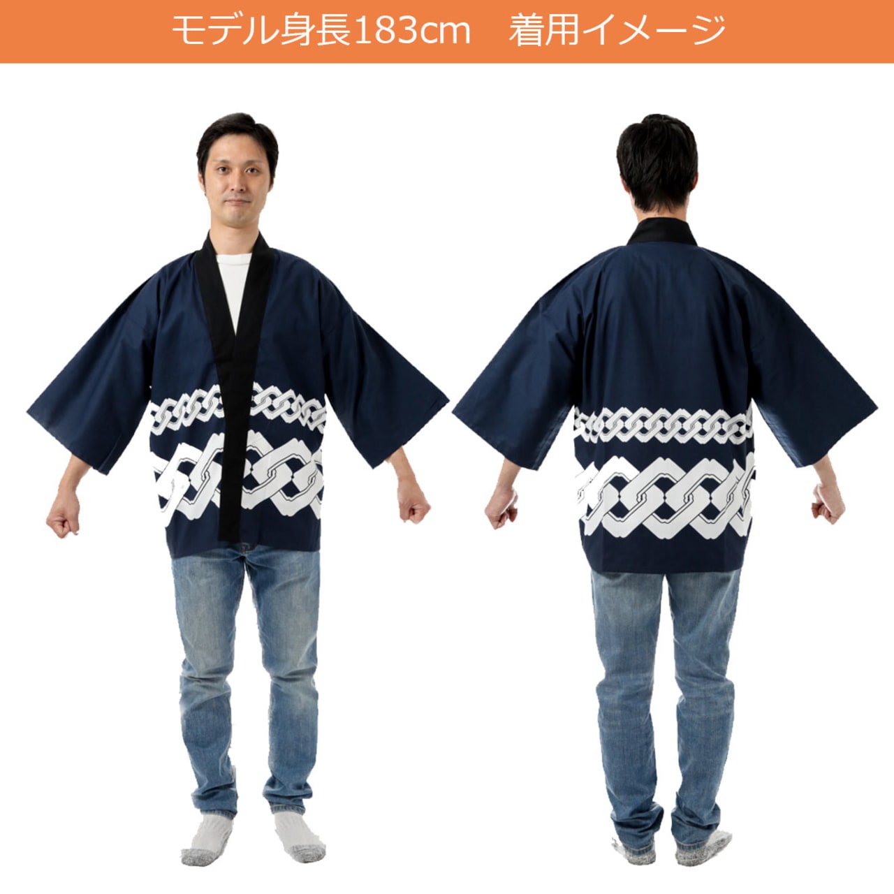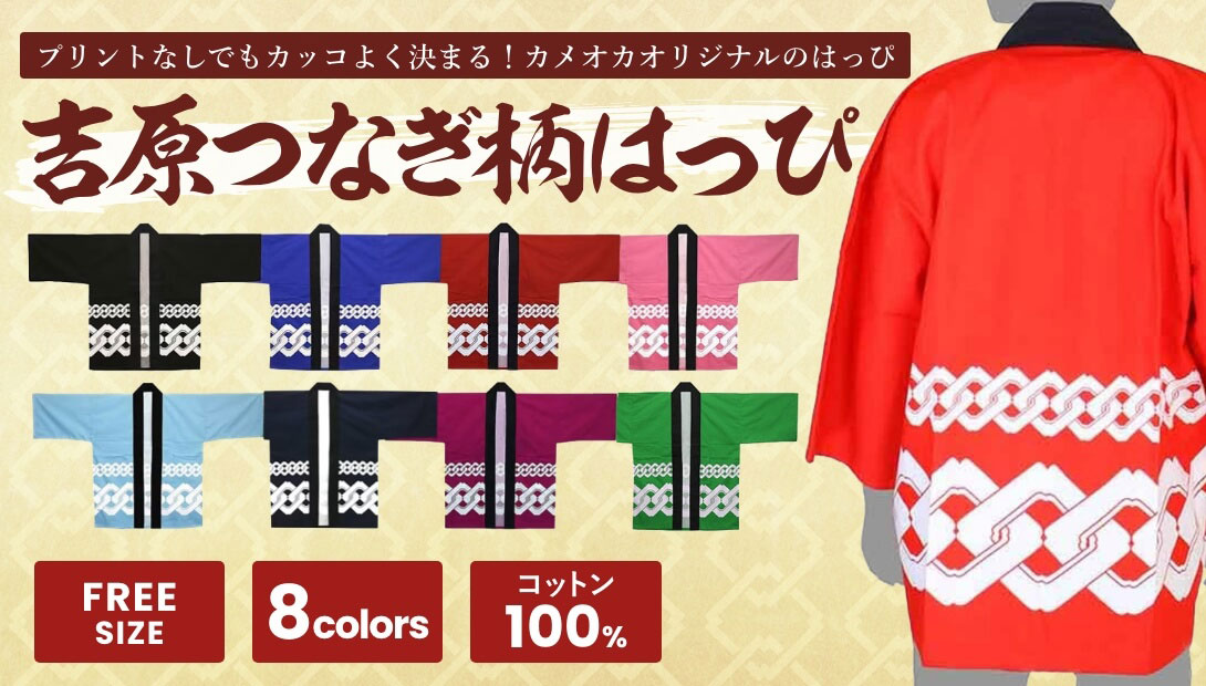 はっぴでは定番柄の吉原つなぎ柄はっぴです。背中や両衿にお客様オリジナルの刺繍やプリントを入れることにより、簡単にオリジナルのはっぴを製作することができます。生地にはややボリュームのあるコットン100%を使用しており、シンプルなデザインながらクオリティの高い仕上がりになっております。