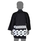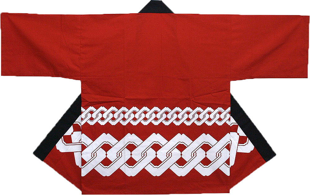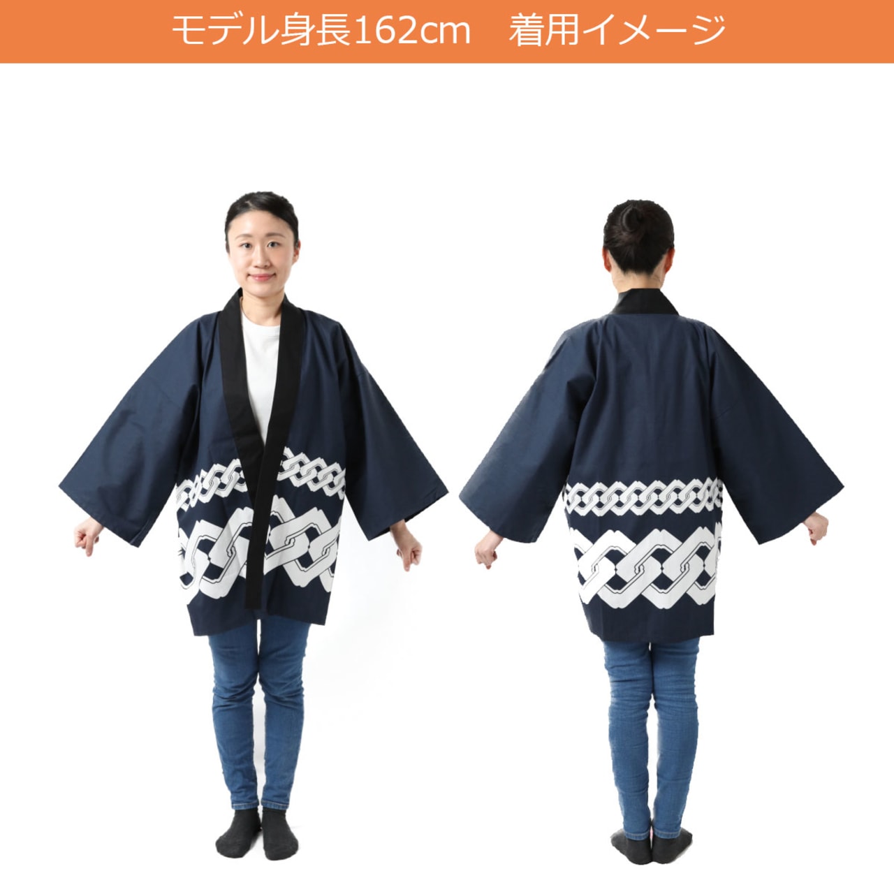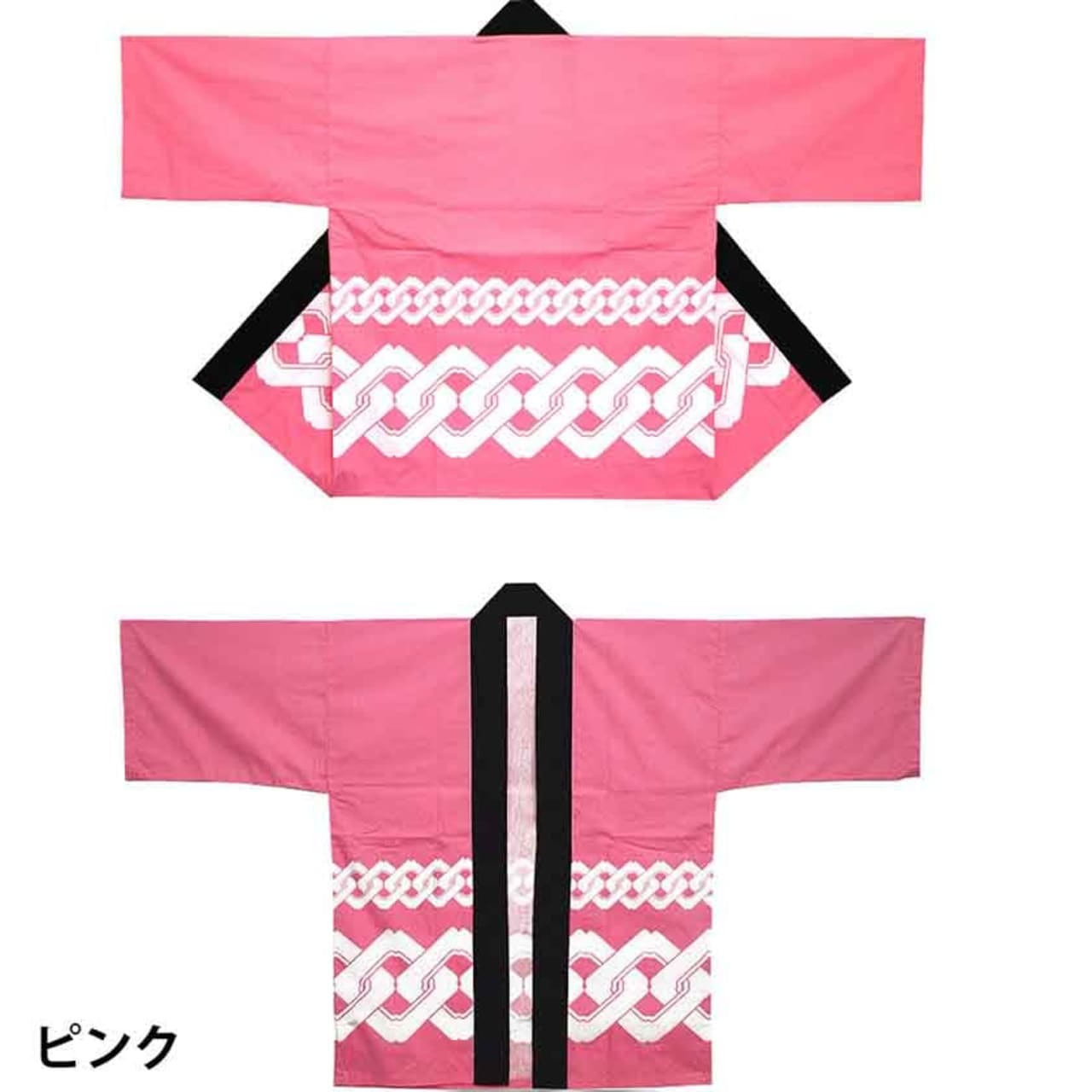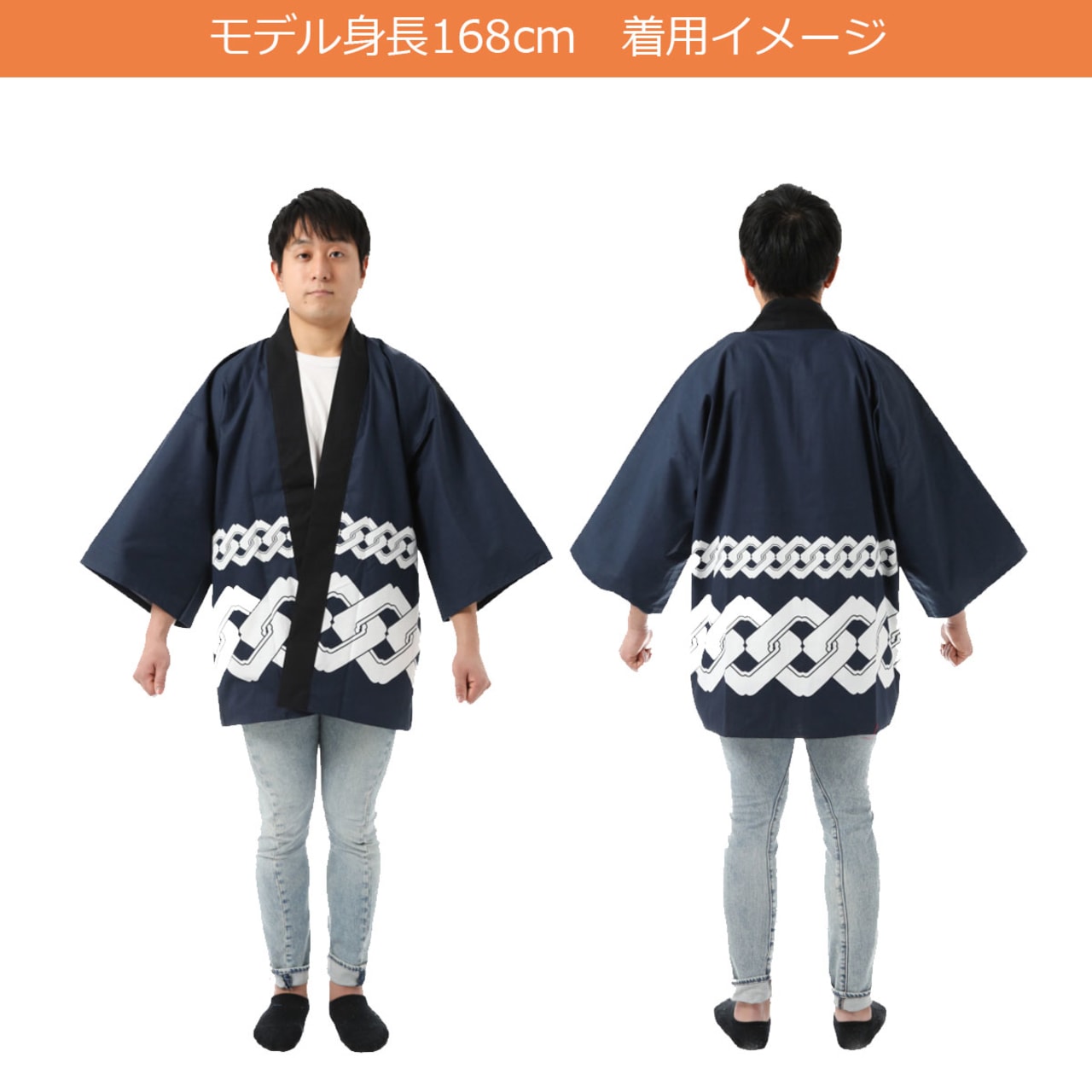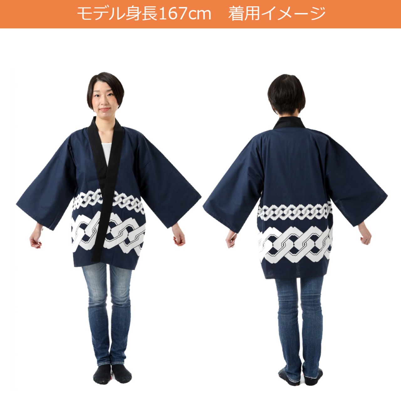 はっぴでは定番柄の吉原つなぎ柄はっぴです。背中や両衿にお客様オリジナルの刺繍やプリントを入れることにより、簡単にオリジナルのはっぴを製作することができます。生地にはややボリュームのあるコットン100%を使用しており、シンプルなデザインながらクオリティの高い仕上がりになっております。