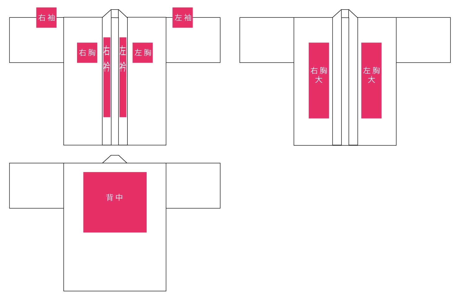 | 加工サイズ | 両衿 | 背中(小)/横25×縦25cm以内 | 背中(中)/横35×縦30cm以内 | 背中(大)/横35×縦40cm以内 | 両衿+背中(小) |