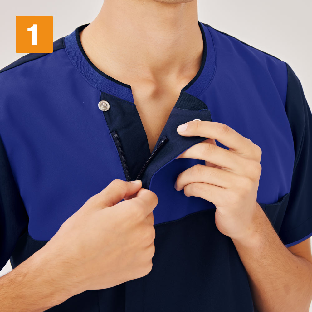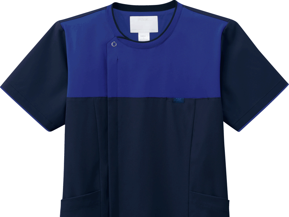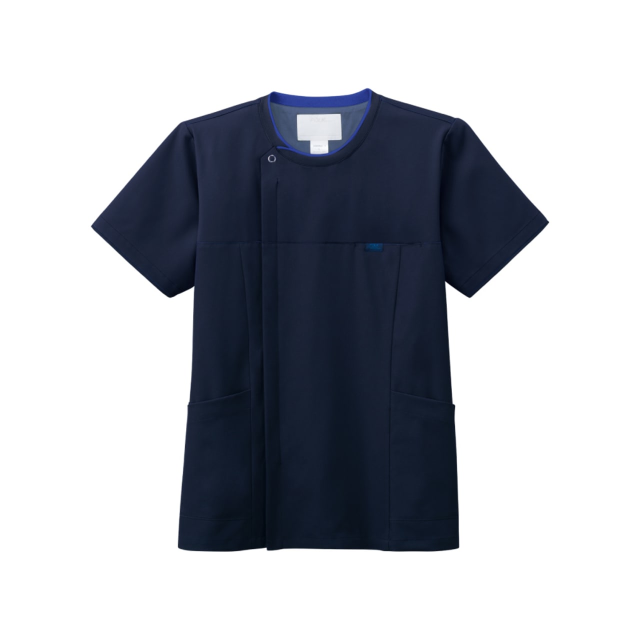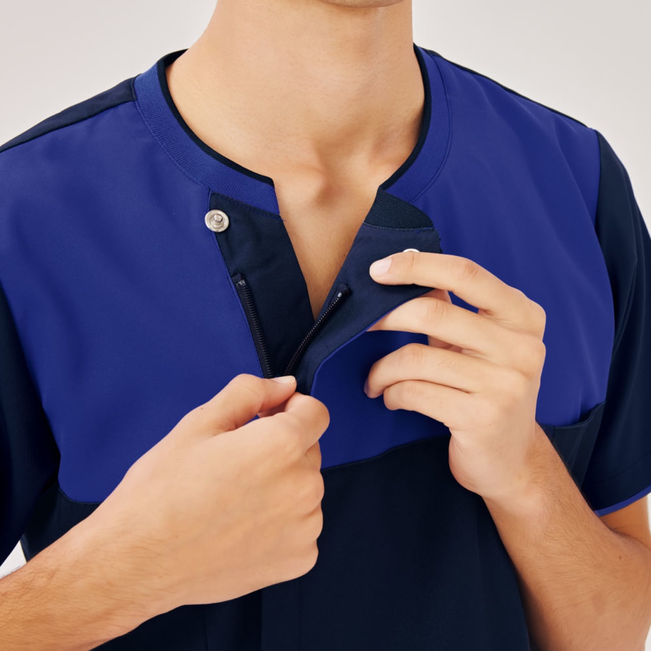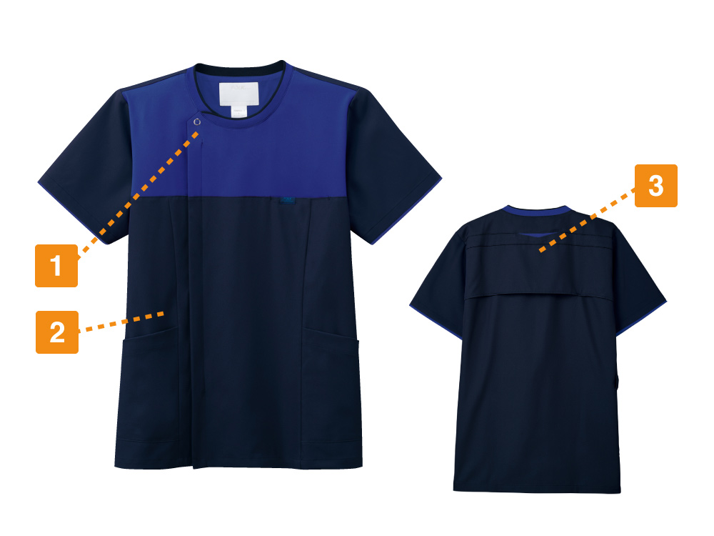 従来型のスクラブの煩雑さをなくした、羽織って着るタイプの新しいスクラブです。被るタイプのスクラブでは、どうしても髪型の崩れが気になるなど、感じていた煩雑さを解消してくれる一着になっています。着脱がとてもスムーズで、ストレスを感じさせません。また、デザインはすっきりとしたシルエットで、お仕事姿を洗練された印象に。いつものシャツやジャケットと同じく右前の合わせとすることで、着脱時の違和感を無くしているのもポイントです。