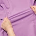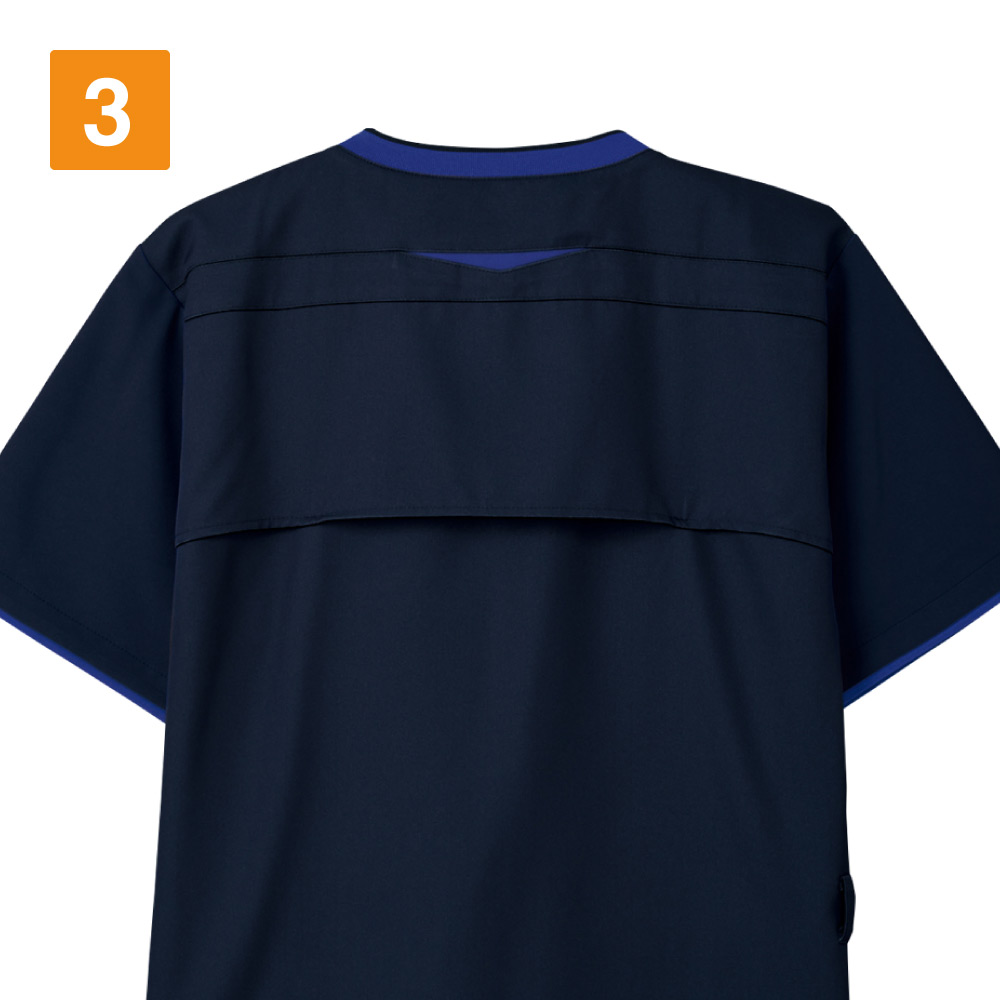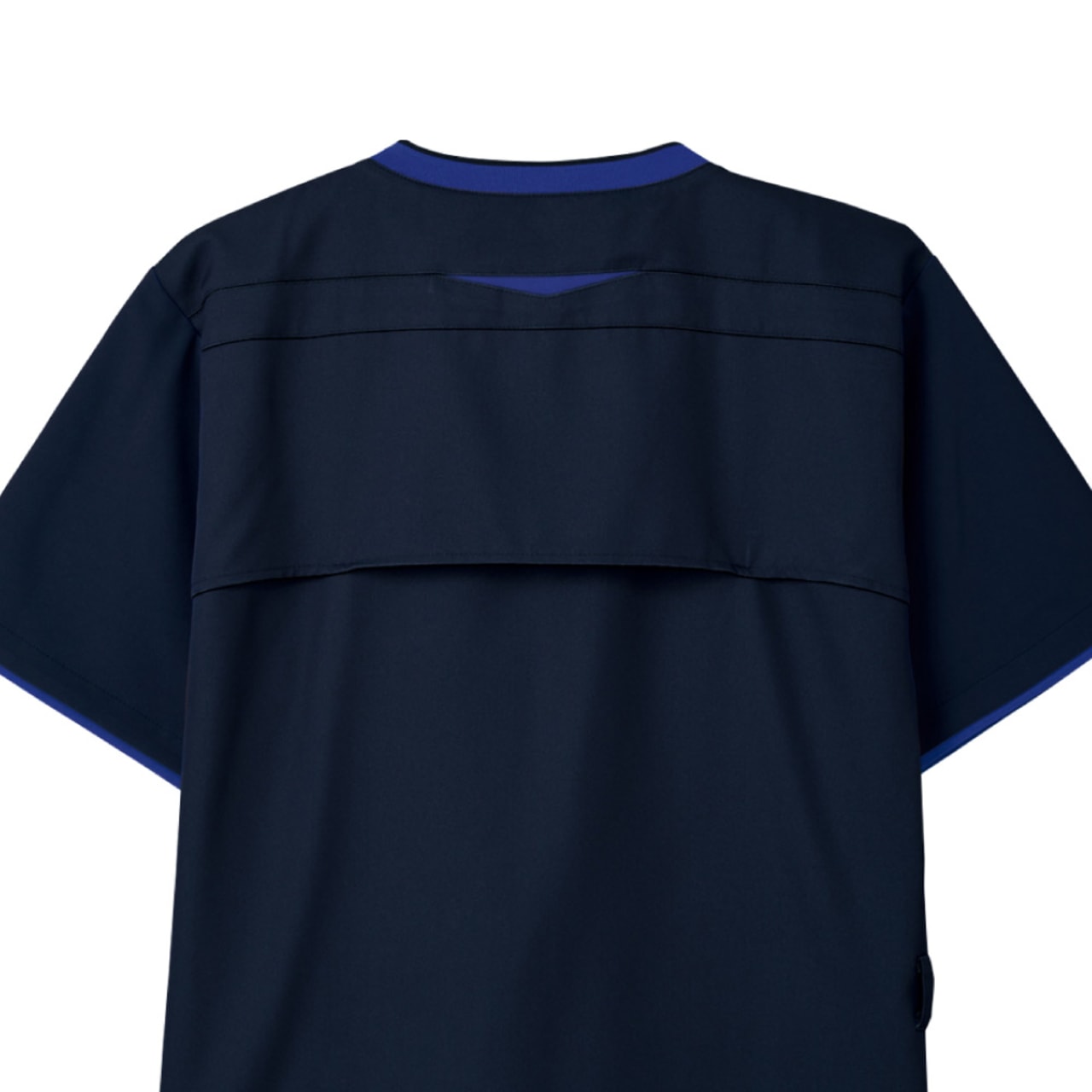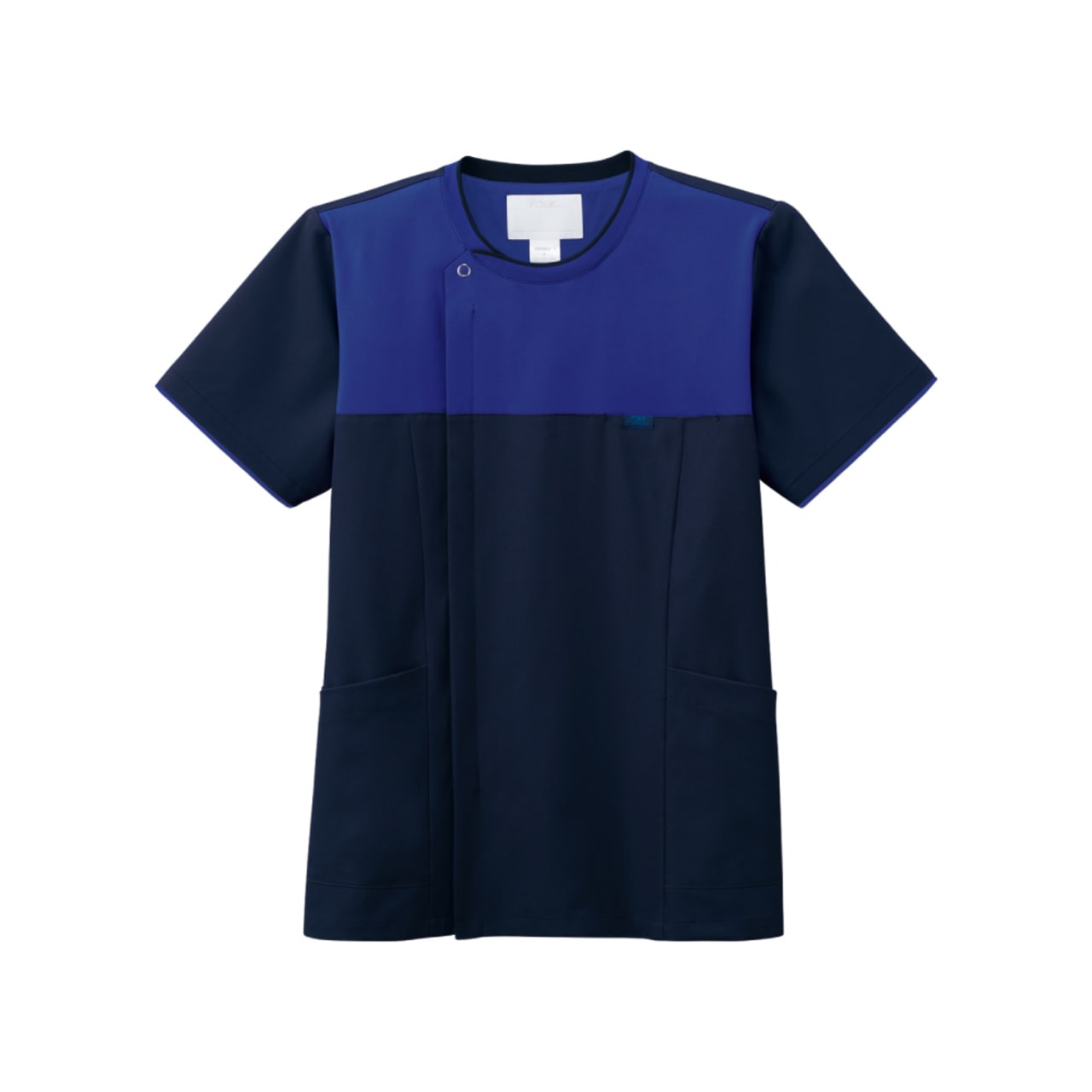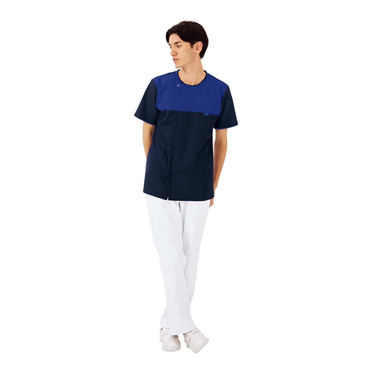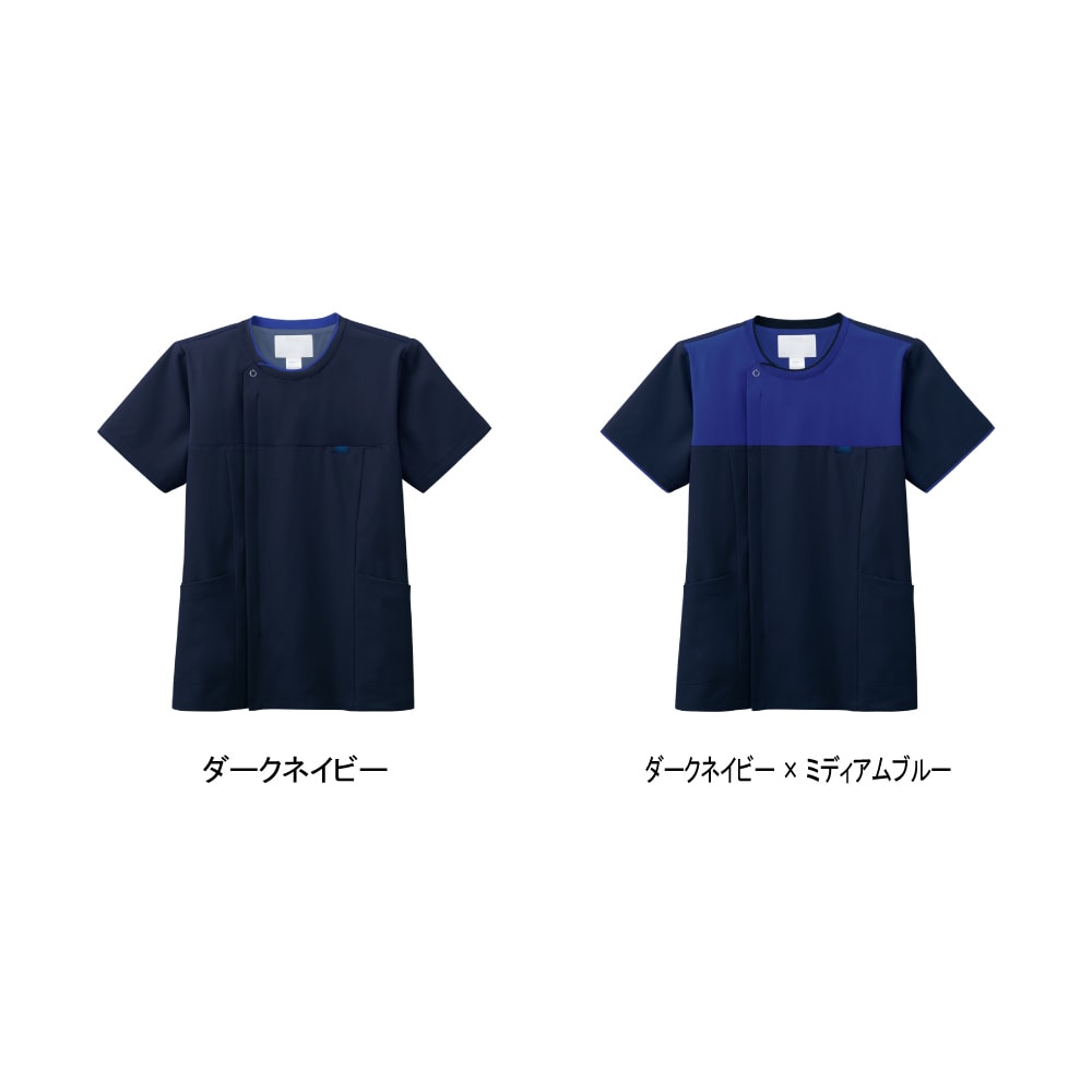 従来型のスクラブの煩雑さをなくした、羽織って着るタイプの新しいスクラブです。被るタイプのスクラブでは、どうしても髪型の崩れが気になるなど、感じていた煩雑さを解消してくれる一着になっています。着脱がとてもスムーズで、ストレスを感じさせません。また、デザインはすっきりとしたシルエットで、お仕事姿を洗練された印象に。いつものシャツやジャケットと同じく右前の合わせとすることで、着脱時の違和感を無くしているのもポイントです。
