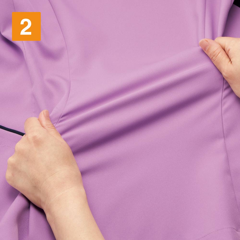 高いストレッチ性能を有したアリオンストレッチが、本体生地に採用されたスクラブ。動きを妨げることなく、作業時のストレスを低減してくれます。また、肌触りのいいナチュラルな質感も好評の一着。肌に触れる側はフルダル糸を使用することで、より心地いい着用感を実現しています。生地は高密度に織り込まれたツイル生地なので、適度にぱりっとしたコシがあるのもポイント。肌にはりつきにくく、暑い季節も快適にお過ごしいただけます。
