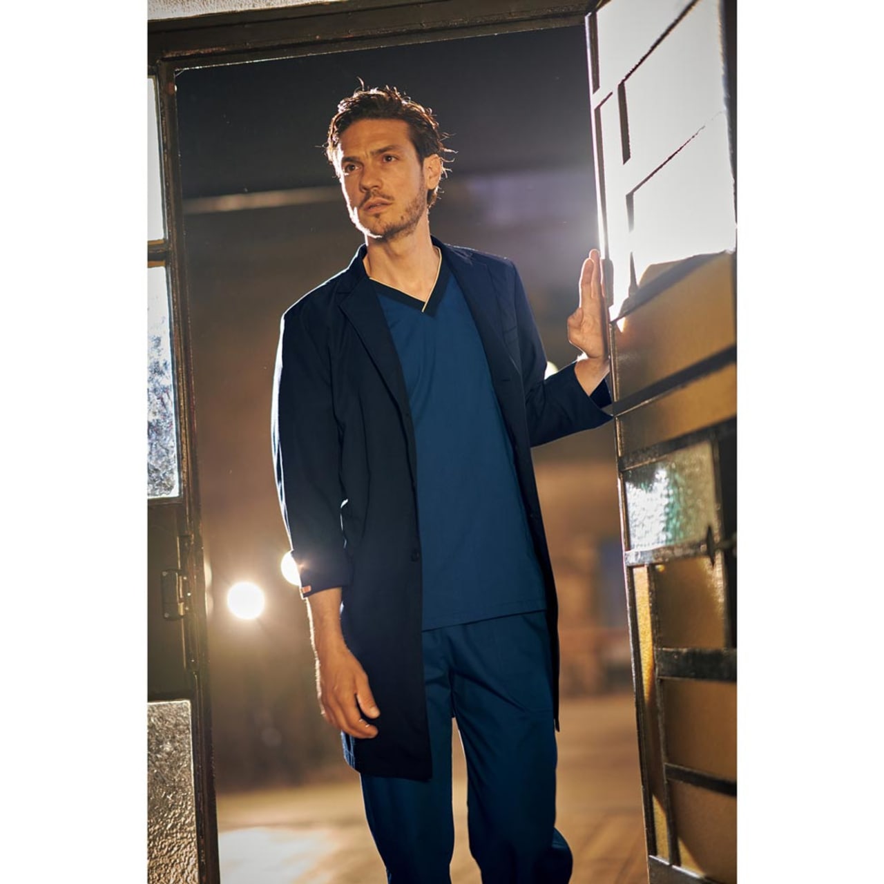ワークウェアの要素を取り入れたデザインドクターコート。スタイリッシュなだけでなく、タフなお仕事を支える機能が詰まったドクターコートになっています。衝撃に強いボタンや耐久性の高い生地を使用することで、毎日のハードワークでもへたりにくいのがポイント。洗いざらしのような独特の風合いで、着こむほどに味わいの深くなる生地も魅力的です。また、生地のストレッチ性能により、動作の際も動きを妨げることなく、いつもストレスのない作業が行えます。