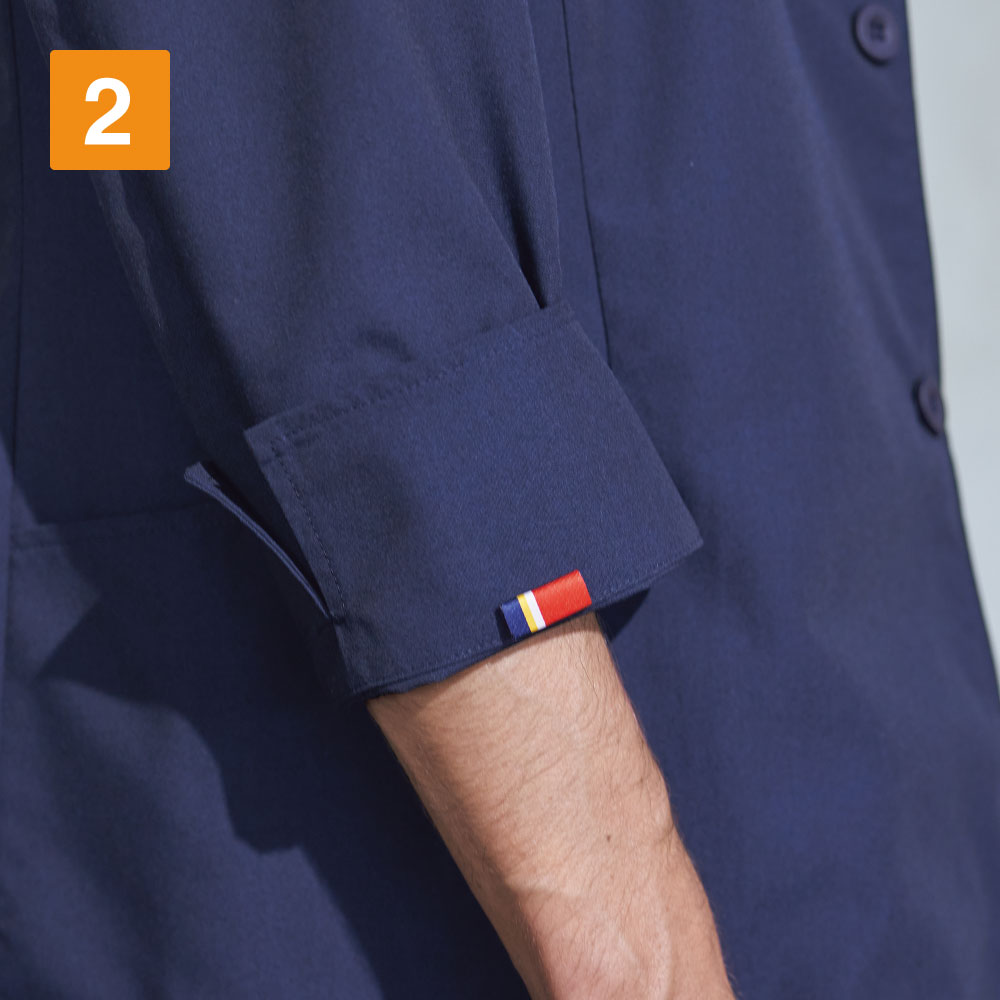 細やかなディテールにまで気を配った、こだわりのドクターコートです。収納面では、両腰にシンプルなポケットが配置され、携帯電話などもすっきりと収納可能に。また、袖口にはスリットが設けられており、袖を折り返しての着用もスムーズに行えます。折り返すと、アクセントのレッドカラーのタグがちらり。おしゃれで遊び心あふれるデザインも魅力のひとつです。背中側裾部分にはセンターベントが設けられているので、足さばきもとてもスムーズに行えます。