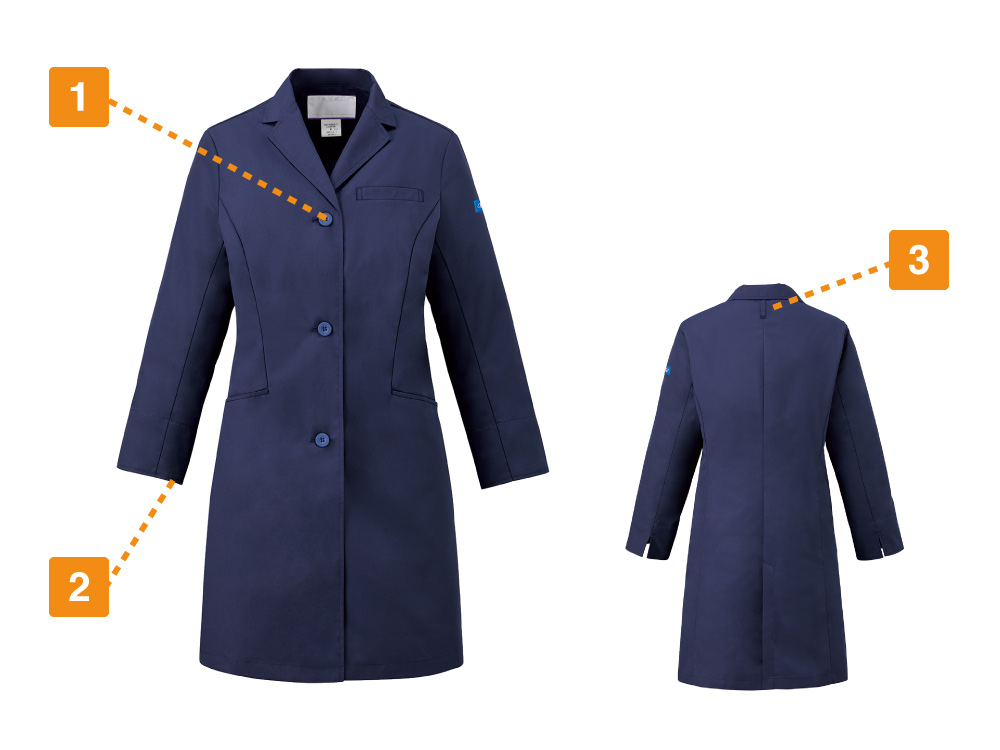 作業性をアップする充実の機能面にも注目のコートです。左胸に加え、両腰にポケットが配置されており、小物や携帯電話も仕分けてすっきりと収納いただけます。また、袖口には折り返しやすいスリット入り。急いで腕まくりをする際にもストレスを感じさせません。折り返し部分にはアクセントとなるタグがあしらわれており、腕をまくってもおしゃれに決まるのがポイントです。さらに、動きやすさをアップするディテールとして、背面裾部分にはセンターベントが設けられています。足さばきをとてもスムーズにし、作業の快適性を向上してくれます。