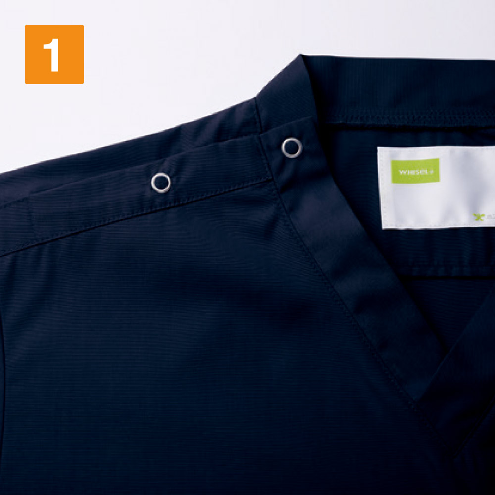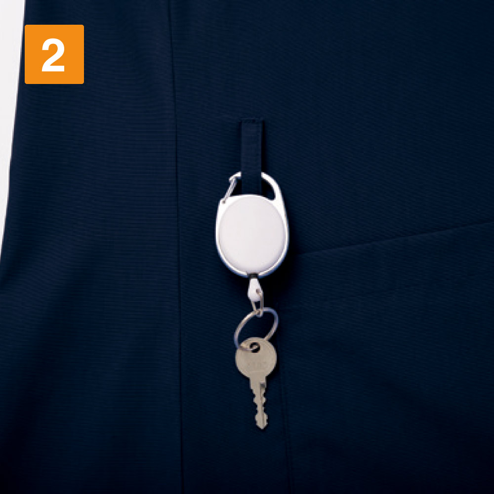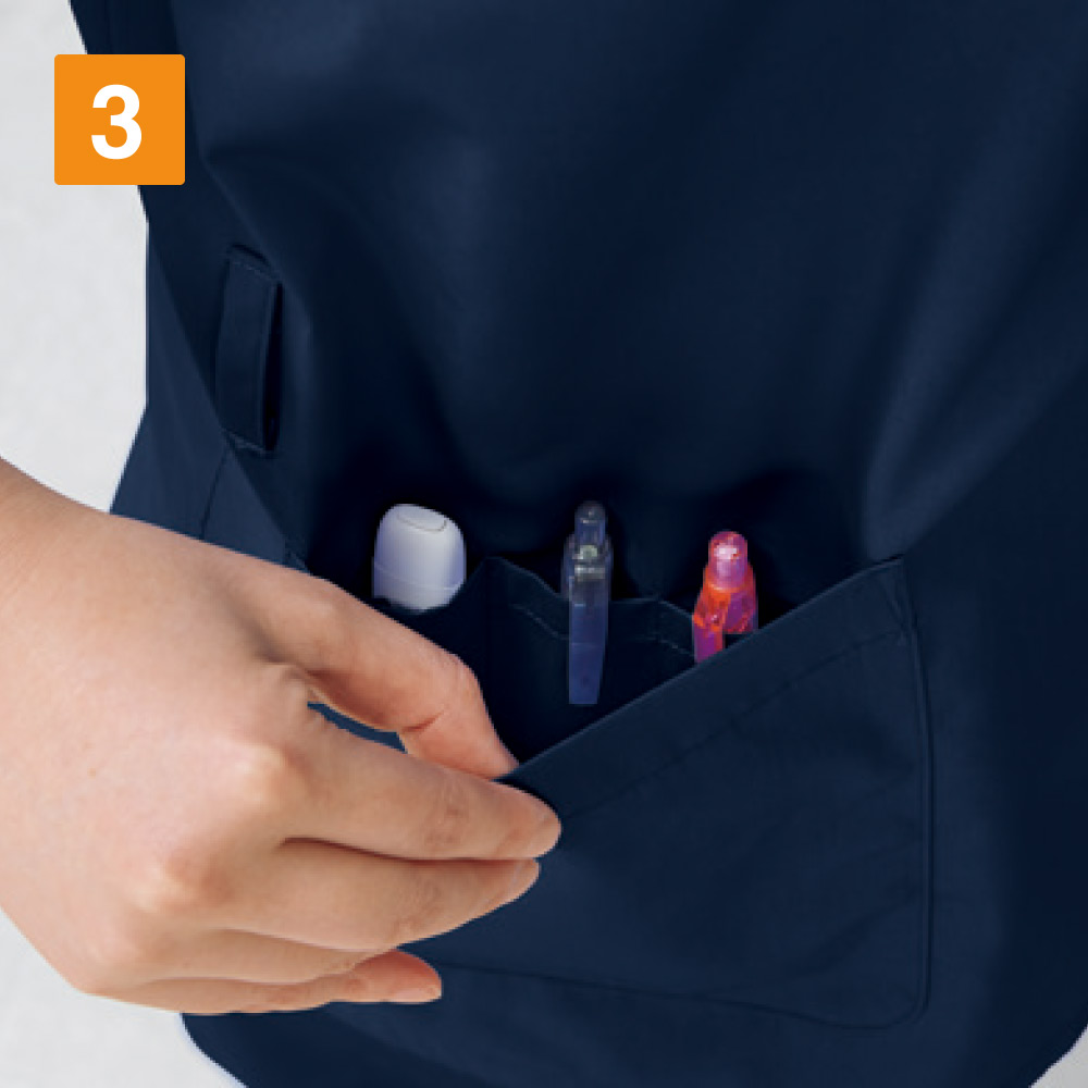 毎日のお仕事のストレスをなくし、効率アップできるディテールが詰まった一着です。着脱用に設けられた肩の2つボタンがポイントです。着脱をスピーディに行えるので、ストレスない着替えをアシストしてくれます。また、ポケットは胸と両脇の3ヶ所に設けられています。左右の脇ポケットは、仕切り付きの内ポケットが内蔵されており、小物やペン、はさみなどを分けて収納可能です。脇にはカギやはさみを提げておけるループ付き。使用頻度の高いものをさっと取り出せて便利です。