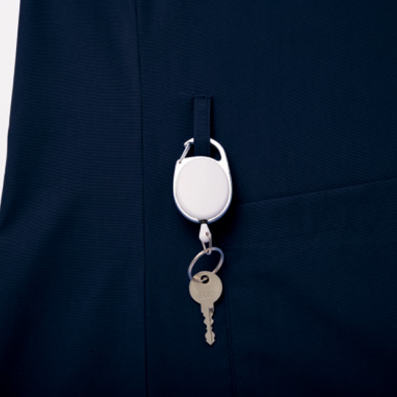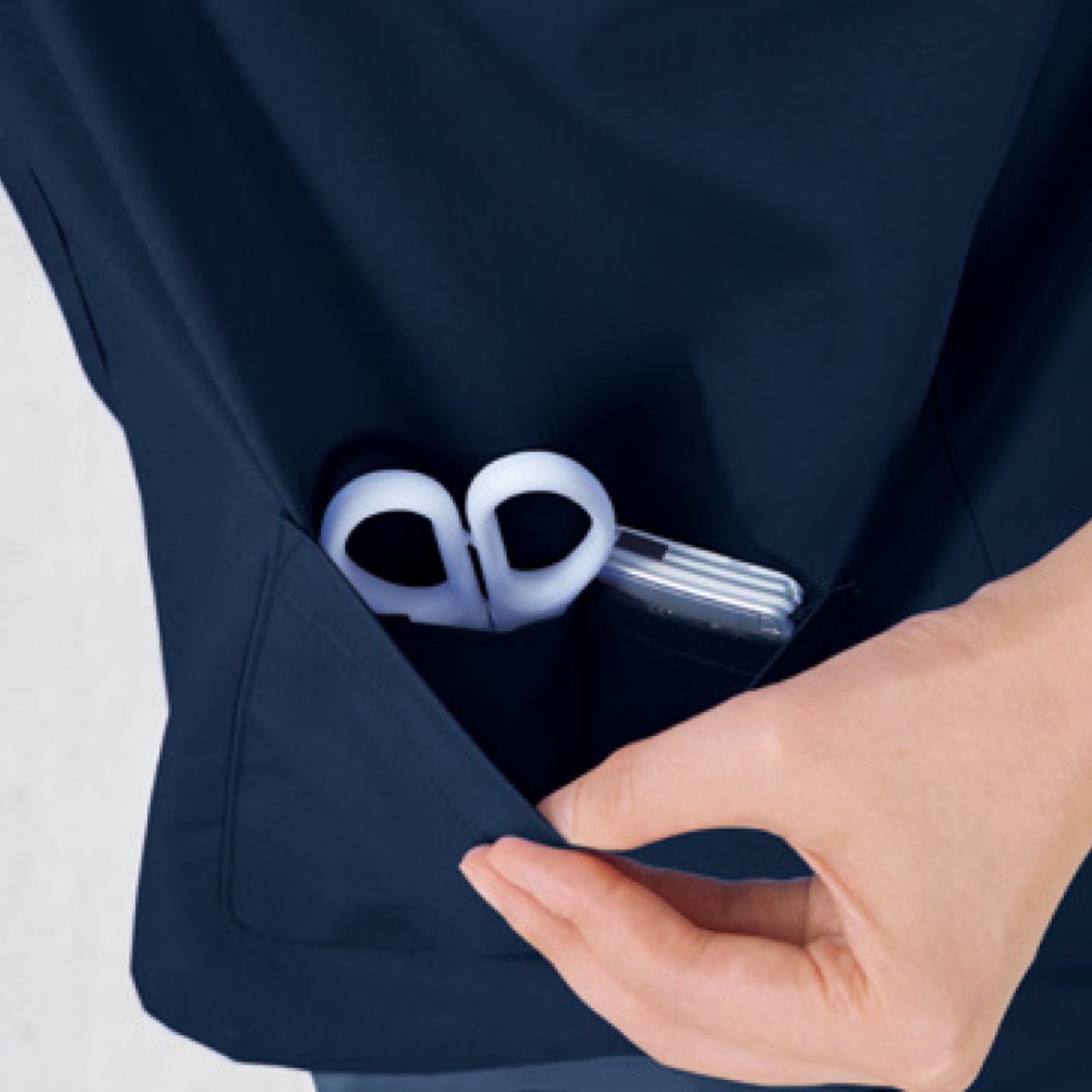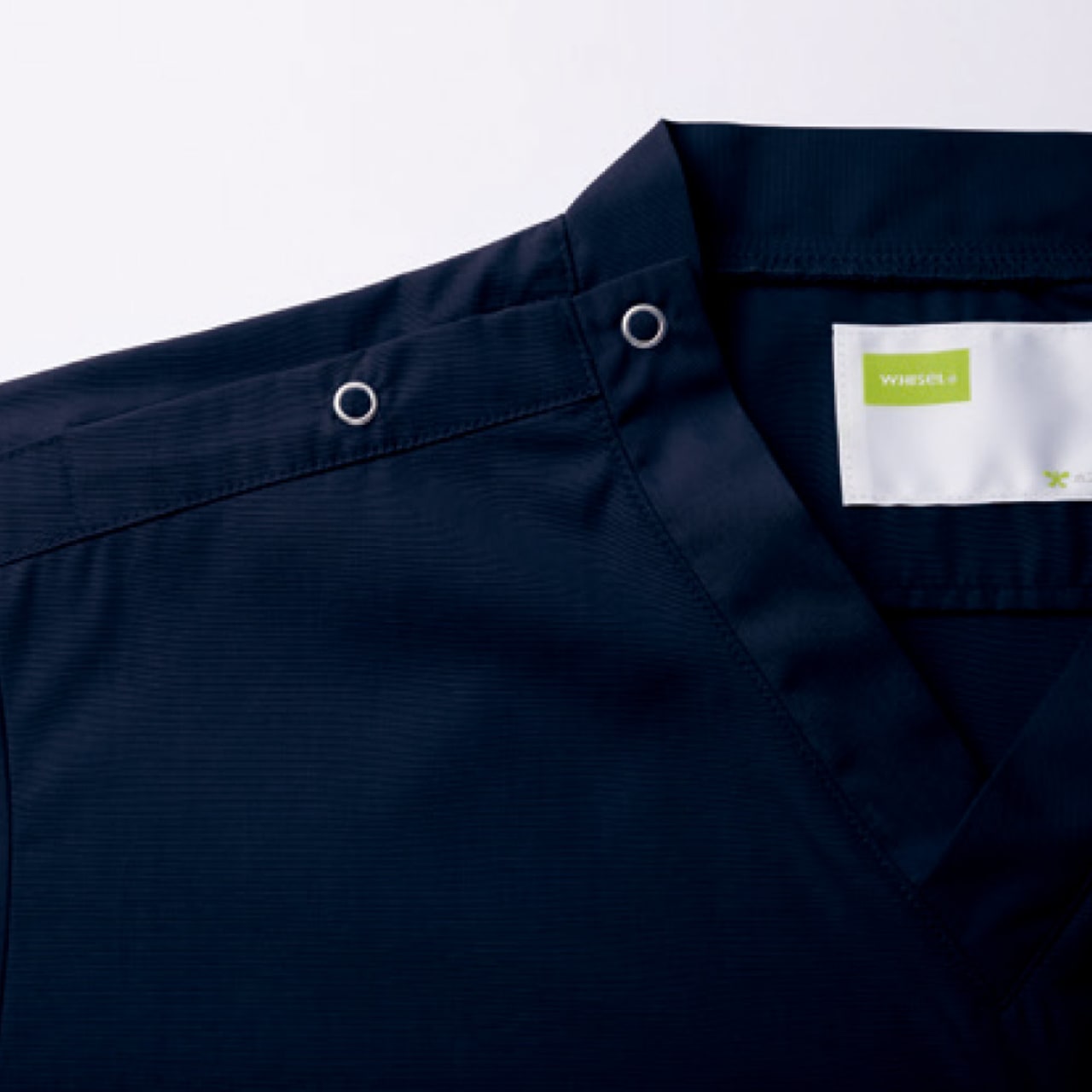 毎日のお仕事のストレスをなくし、効率アップできるディテールが詰まった一着です。着脱用に設けられた肩の2つボタンがポイントです。着脱をスピーディに行えるので、ストレスない着替えをアシストしてくれます。また、ポケットは胸と両脇の3ヶ所に設けられています。左右の脇ポケットは、仕切り付きの内ポケットが内蔵されており、小物やペン、はさみなどを分けて収納可能です。脇にはカギやはさみを提げておけるループ付き。使用頻度の高いものをさっと取り出せて便利です。