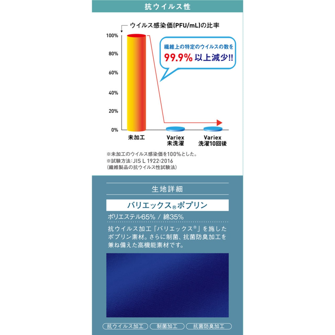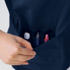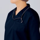 生地の持つ優れた機能がポイントのスクラブです。本体生地に使用されているのは抗ウイルス加工が施された、高機能素材バリエックスポプリン。繊維に付着した特定のウイルスを99.9%以上減少させることが確認され、各種安全性試験をクリアした清潔かつ安全な素材です。さらに、抗ウイルス加工、制菌加工、抗菌防臭加工分野でのSEKマークを取得し、衛生面で高い水準が求められる現場でも着用いただける一着に。医療現場でも安全に着用いただけます。