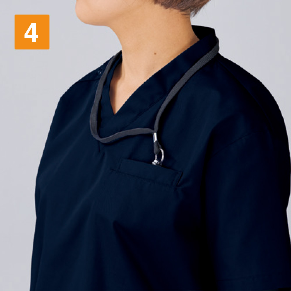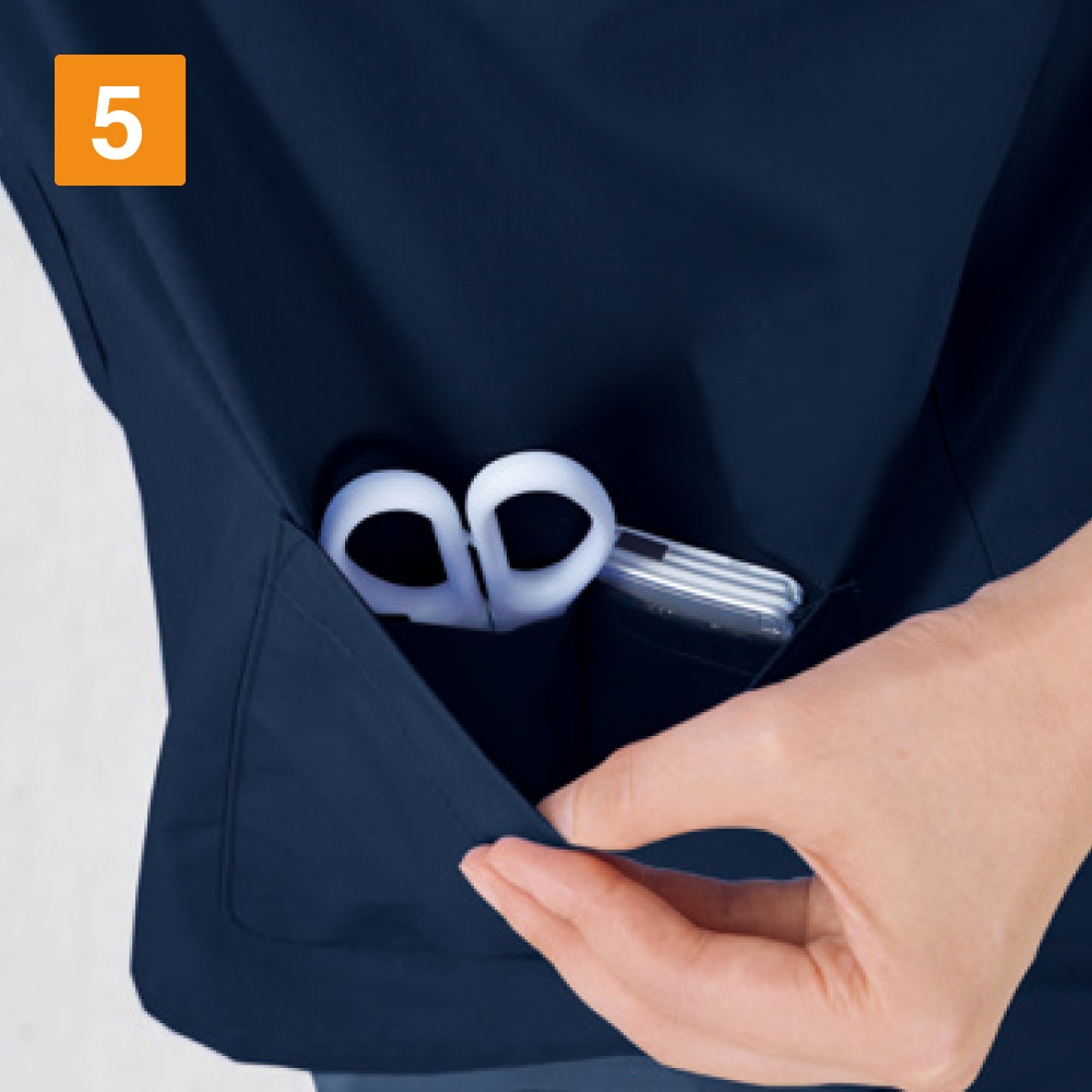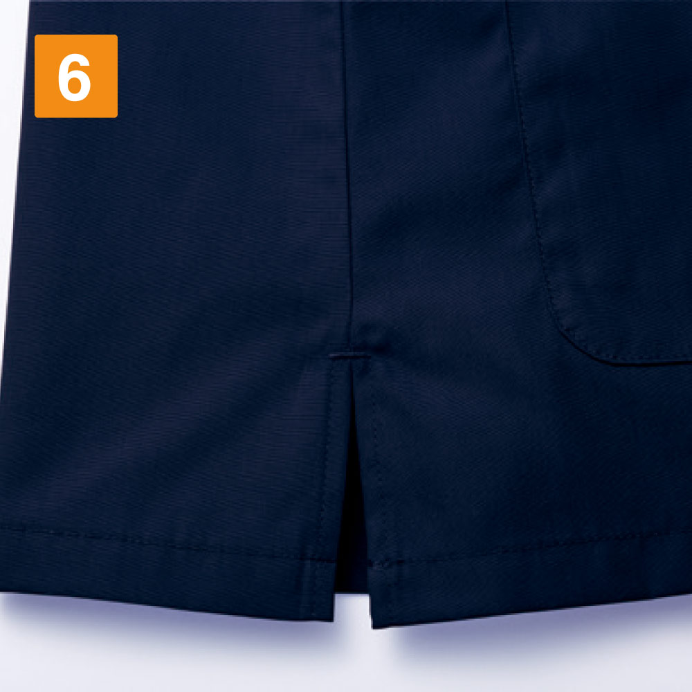 抗ウイルス加工、制菌加工、抗菌防臭加工の3分野でSEKマークを取得したまさに医療現場のための一着になっています。シンプルながらこだわりを感じる設計もポイント。首まわりはすっきりとしたVネックデザインになっています。襟にやや立ち上がりがあることで、首にストラップが接しないので、肌にやさしく衛生的です。また、裾の両脇にスリットが設けられているので、腰回りのつっぱり感をなくし動きやすさをアップ。高い機動性が求められる現場にもぴったりです。