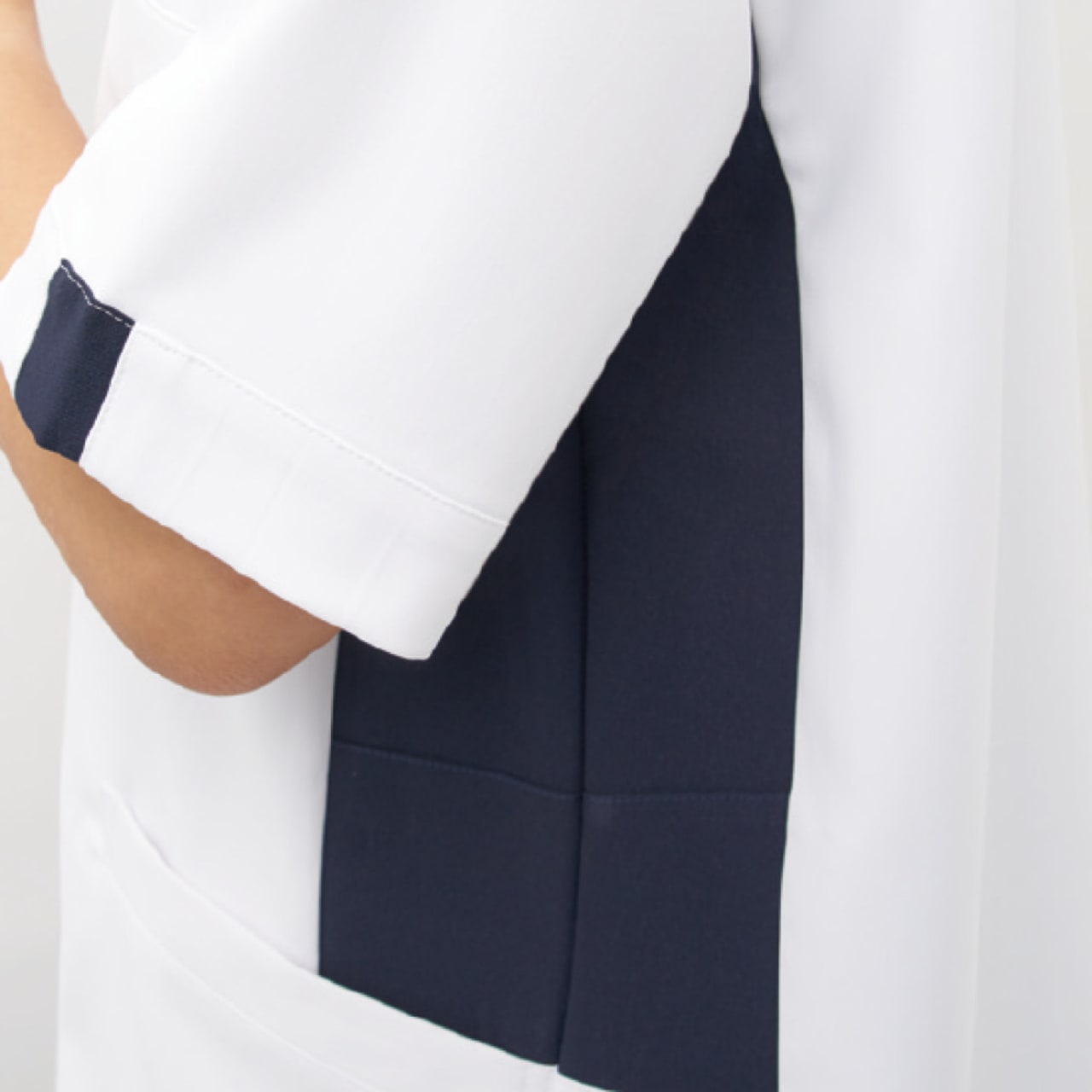 本体生地に使用されているのは、TFストレッチラチネ。優しい着心地が人気の素材です。肌触りがやさしく、さらに生地の持つストレッチ性能でよりやわらかな着用感に。透けにくい特性を持ち、インナーなどを気にする必要がありません。また、やわらかさと同時に、適度なハリ、コシ感のある生地なので、美しいシルエットを保ってくれるのも嬉しいポイント。さらに帯電防止性能により不快な静電気の発生をカット、吸汗・速乾性能により汗をかいても快適な着用感が持続するなど、たくさんの機能をあわせ持ったスクラブになっています。