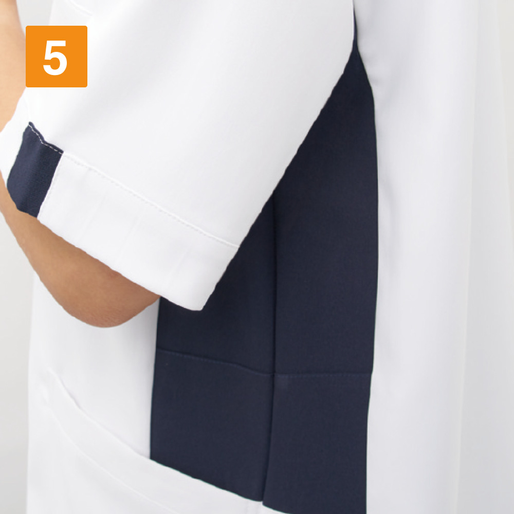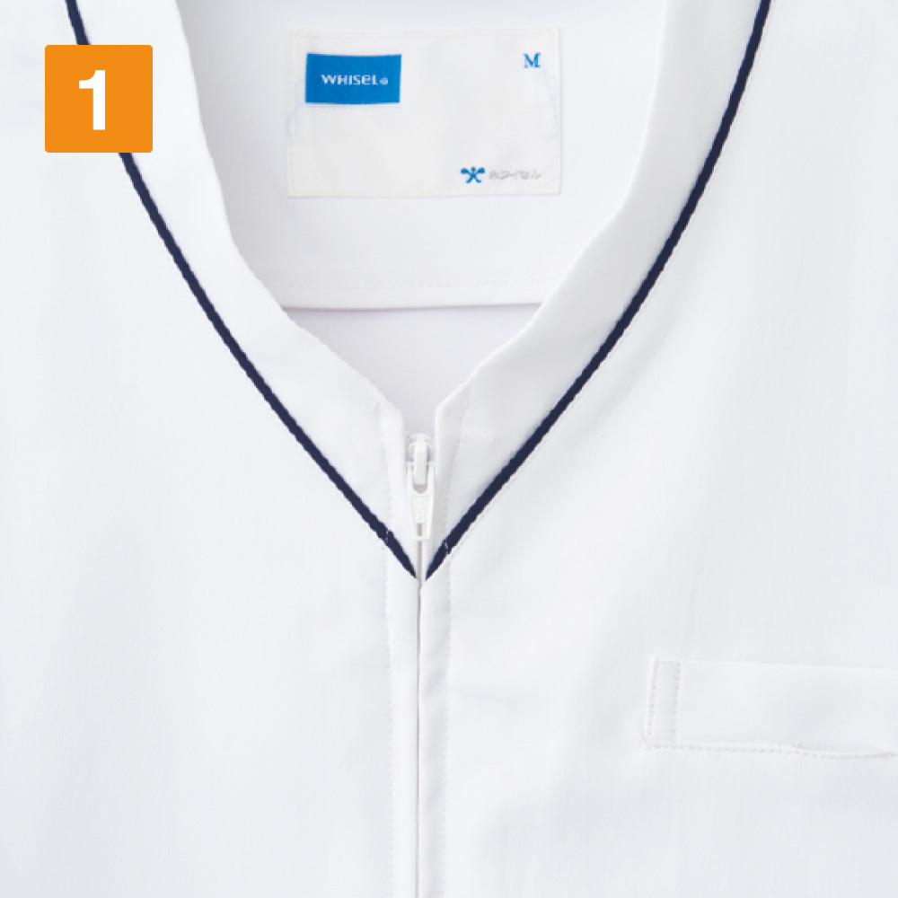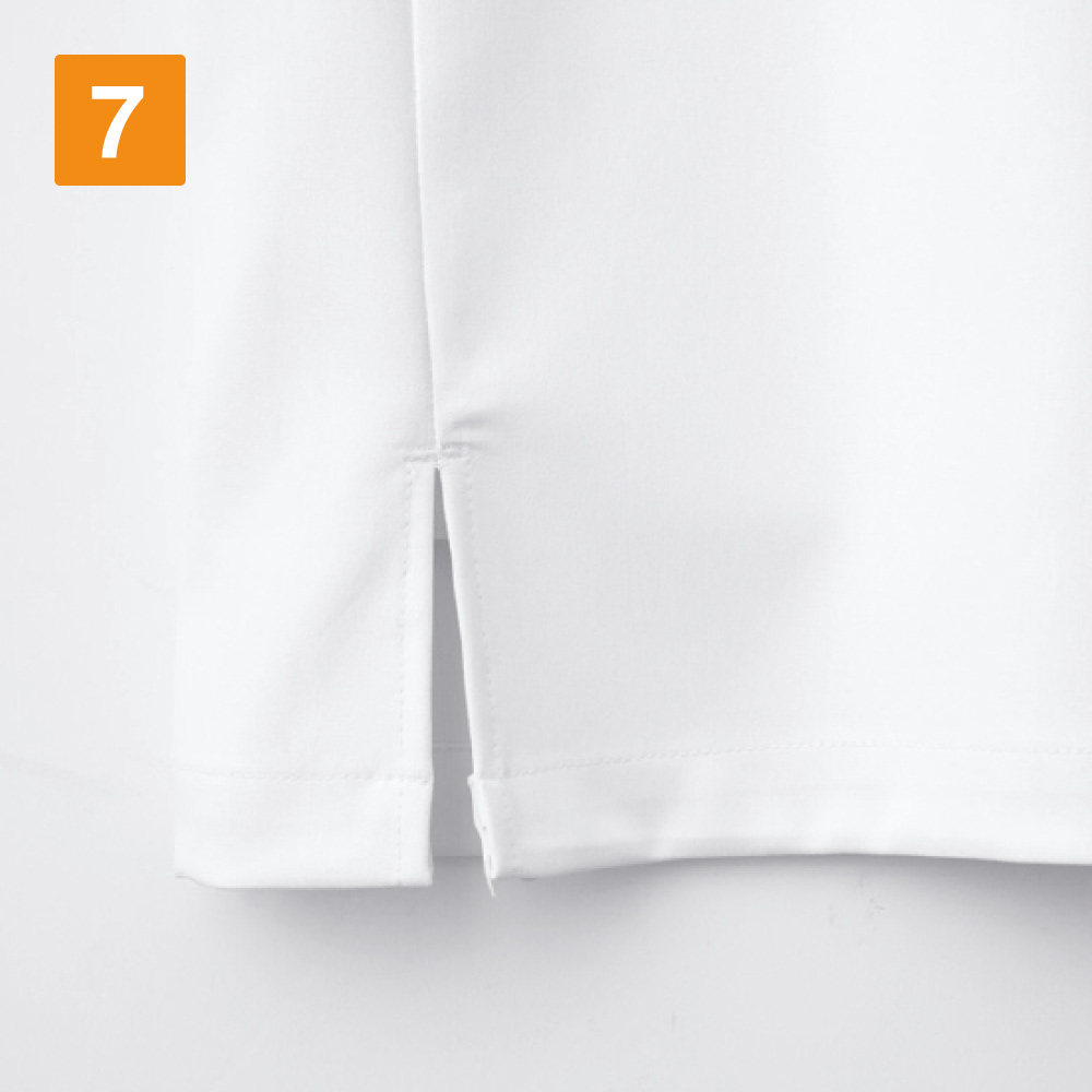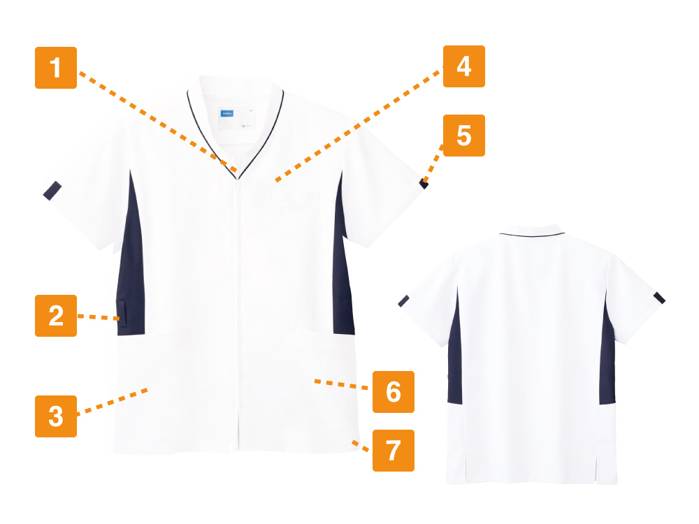 ファスナーで前面をオープン可能!羽織って着られて、着脱がスムーズに行えるスクラブです。ヘアセットやメイクをされる方も衣服と顔や頭が接しないので、崩れる心配がなくストレスを感じさせません。また、制菌加工の分野でSEKマークの認定を取得しているのもポイント。医療現場の衛生面にシビアな環境でも安心してご着用いただけます。さらに生地には防汚加工が施されているので、汚れがつきにくく、お手入れもらくらく。医療現場での着用を丁寧に考え抜かれたウェアです。